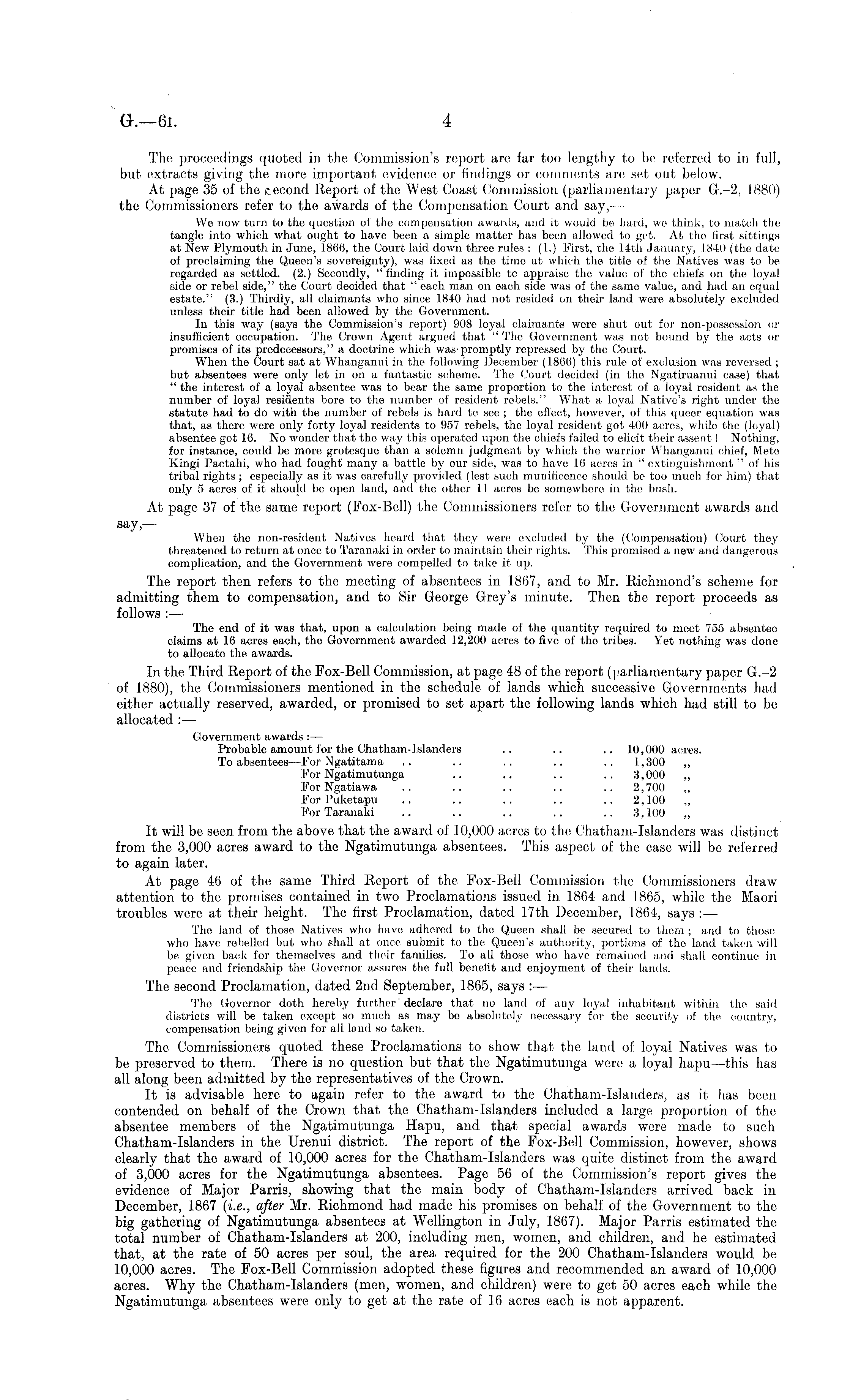 The proceedings quoted in the Commission's report are far too lengthy to be referred to in full, but extracts giving the more important evidence or findings or comments are set out below. At page 35 of the fcecond Report of the West Coast Commission (parliamentary paper G.-2, 1880) the Commissioners refer to the awards of the Compensation Court and say,We now turn to the question of the compensation awards, and it would be hard, we think, to match the tangle into which what ought to have been a simple matter has been allowed to get. At the first sittings at New Plymouth in June, 18(1(5, the Court laid down three rules : (1.) first, the 14th January, 1840 (the date of proclaiming the Queen's sovereignty), was fixed as the time at which the title of the Natives was to be regarded as settled. (2.) Secondly, "finding it impossible to appraise the value of the chiefs on the loyal side or rebel side," the Court decided that " each man on each side was of the same value, and had an equal estate." (3.) Thirdly, all claimants who since 184(1 had not resided on their land were absolutely excluded unless their title had been allowed by the Government. In this way (says the Commission's report) 908 loyal claimants wore shut out for non-possession oi' insufficient occupation. The Crown Agent argued that " The Government was not bound by the acts or promises of its predecessors," a doctrine which was'promptly repressed by the Court. When tho Court sat at Whanganui in the following December (1866) this rule of exclusion was reversed ; but absentees were only let in on a fantastic scheme. The Court decided (in tho Ngatiruanui case) that " the interest of a loyal absentee was to bear the same proportion to the interest of a loyal resident as the, number of loyal residents bore to the number of resident rebels." What a loyal Native's right under the statute had to do with the number of rebels is hard te see ; the effect, however, of this queer equation was that, as there were only forty loyal residents to 957 rebels, the loyal resident got 400 acres, while the (loyal) absentee got 10. No wonder that tho way this operated upon the chiefs failed to elicit their assent! Nothing, for instance, could be more grotesque than a solemn judgment by which the warrior Whanganui chief, Mete Kingi Paetahi, who had fought many a battle by our side, was to have 16 acres in " extinguishment " of his tribal rights ; especially as it was carefully provided (lest such munificence should be too much for him) that only 5 acres of it should be open land, and the other 11 acres be somewhere in the bush. At page 37 of the same report (Fox-Bell) the Commissioners refer to the Government awards and say,— When the non-resident Natives heard that they were excluded by the (Compensation) Court they threatened to return at once to 'taranaki in order to maintain their rights. This promised a new and dangerous complication, and the Government were compelled to take it up. The report then refers to the meeting of absentees in .1867, and to Mr. Richmond's scheme for admitting them to compensation, and to Sir George Grey's minute. Then the report proceeds as follows :— The end of it was that, upon a calculation being made of the quantity required to meet 755 absentee claims at 16 acres each, the Government awarded 12,200 acres to five of the tribes. Yet nothing was done to allocate the awards. In the Third Report of the Fox-Bell Commission, at page 48 of the report (parliamentary paper G.-2 of 1880), the Commissioners mentioned in the schedule of lands which successive Governments had either actually reserved, awarded, or promised to set apart the following lands which had still to be allocated :— Government awards :— Probable amount for the Chatham-Islanders .. .. .. 10,000 acres. To absentees—For Ngatitama .. .. .. .. .. 1,300 „ For Ngatimutunga .. .. .. .. 3,000 „ For Ngatiawa .. .. .. .. .. 2,700 For Puketapu .. .. .. .. .. 2,100 Kor Taranaki .. .. .. .. .. 3,100 ~ It will be seen from the above that the award of 10,000 acres to the Chatham-Islanders was distinct from the 3,000 acres award to the Ngatimutunga absentees. This aspect of the case will be referred to again later. At page 46 of the same Third Report of the Fox-Bell Commission the Commissioners draw attention to the promises contained in two Proclamations issued in 1864 and 1865, while the Maori troubles were at their height. The first Proclamation, dated 17th December, 1864, says : — The land of those Natives who have adhered to the Queen shall be secured to them ; and to those who have rebelled but who shall at once submit to the, Queen's authority, portions of the land taken will be given back for themselves and their families. To all those who have remained and shall continue in peace and friendship the Governor assures the full benefit and enjoyment of their lands. Tho second Proclamation, dated 2nd September, 1865, says : — The Governor doth hereby further' declare that no land of any loyal inhabitant within the said districts will be taken except so much as may be absolutely necessary for the security of the country, compensation being given for all loud so taken. The Commissioners quoted these Proclamations to show that the land of loyal Natives was to be preserved to them. There is no question but that the Ngatimutunga were a loyal hapu—this has all along been admitted by the representatives of the Crown. It is advisable here to again refer to the award to the Chatham-Islanders, as it has been contended on behalf of the Crown that the Chatham-Islanders included a large proportion of the absentee members of the Ngatimutunga Hapu, and that special awards were made to such Chatham-Islanders in the Urenui district. The report of the Fox-Bell Commission, however, shows clearly that the award of 10,000 acres for the Chatham-Islanders was quite distinct from the award of 3,000 acres for the Ngatimutunga absentees. Page 56 of the Commission's report gives