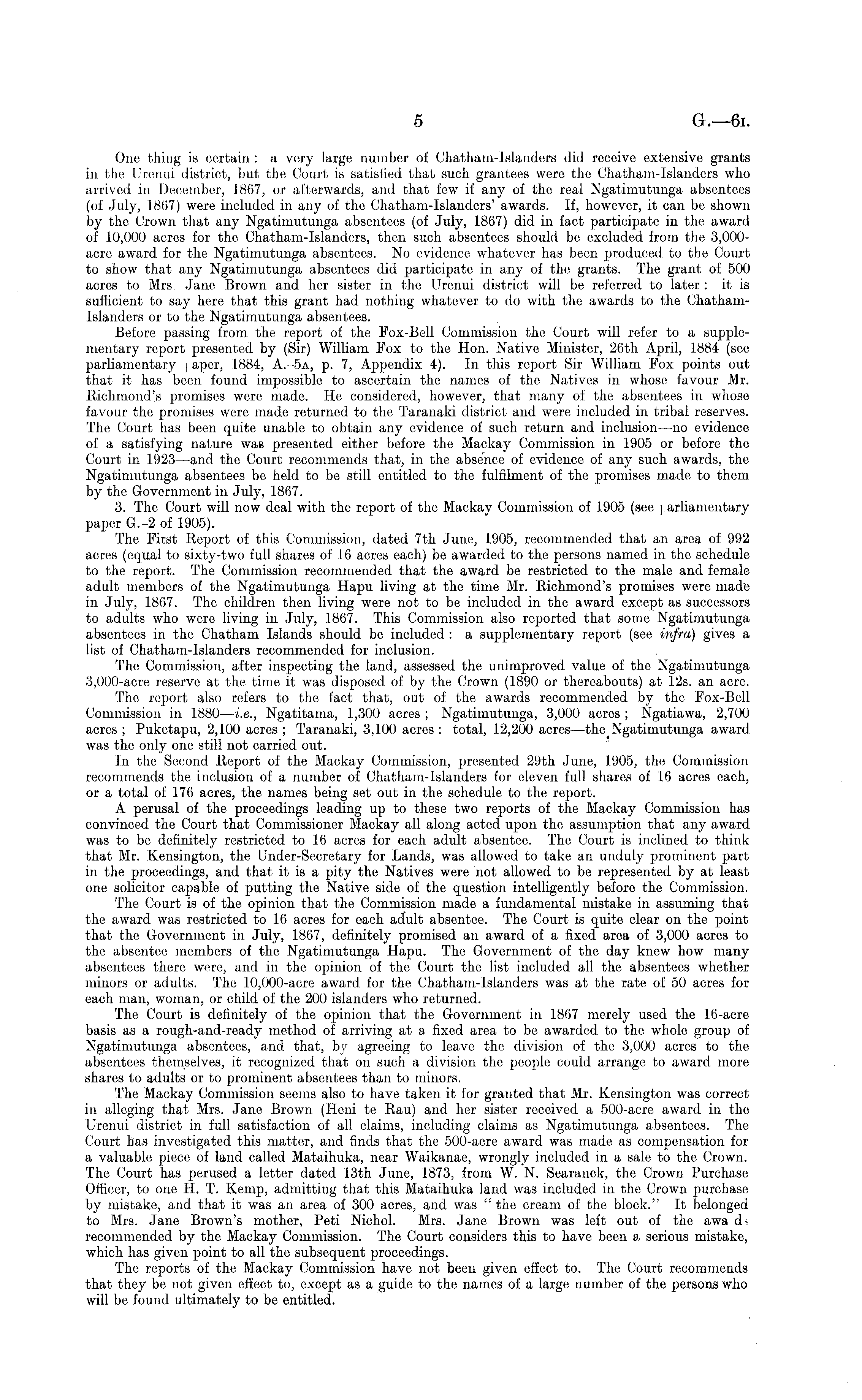 One thing is certain : a very large number of Chatham-Islanders did receive extensive grants in the Uronui district, but the Court is satisfied that such grantees were the Chatham-Islanders who arrived in December, 1867, or afterwards, and that few if any of the real Ngatimutunga absentees (of July, 1867) were included in any of the Chatham-Islanders' awards. If, however, it can be shown by the Crown that any Ngatimutunga absentees (of July, 1867) did in fa.ct participate in the award of 10,000 acres for tho Chatham-Islanders, then such absentees should be excluded from the 3,000--acre award for the Ngatimutunga absentees. No evidence whatever has been produced, to the Court to show that any Ngatimutunga absentees did participate in any of the grants. The grant of 500 acres to Mrs. Jane Brown and her sister in the Urenui district will be referred to later : it is sufficient to say here that this grant had nothing whatever to do with the awards to the ChathamIslanders or to the Ngatimutunga absentees. Before passing from the report of the Fox-Bell Commission the Court will refer to a supplementary report presented by (Sir) William Fox to the Hon. Native Minister, 26th April, 1884 (see parliamentary j apcr, 1884, A.--sa, p. 7, Appendix 4). In this report Sir William Fox points out that it has been found impossible to ascertain the names of the Natives in whose favour Mr. Richmond's promises were made. He considered, however, that many of the absentees in whose favour the promises were made returned to the Taranaki district and were included in tribal reserves. The Court has been quite unable to obtain any evidence of such return and inclusion—no evidence of a satisfying nature was presented either before the Mackay Commission in 1905 or before the Court in 1923—and the Court recommends that, in the absence of evidence of any such awards, the Ngatimutunga absentees be held to be still entitled to the fulfilment of the promises made to them by the Government in July, 1867. 3. The Court will now deal with the report of the Mackav Commission of 1.905 (see | arliamentary paper G.-2 of 1905). The First Report of this Commission, dated 7th June, 1905, recommended that an area of 992 acres (equal to sixty-two full shares of 16 acres each) be awarded to the persons named in tho schedule to the report. The Commission recommended that the award be restricted to the male and female adult members of the Ngatimutunga Hapu living at the time Mr. Richmond's promises were made in July, 1867. The children then living were not to be included in the award except as successors to adults who wore living in July, 1867. This Commission also reported that some Ngatimutunga absentees in the Chatham Islands should be included : a supplementary report (see infra) gives a list of Chatham-Islanders recommended for inclusion. The Commission, after inspecting the land, assessed the unimproved value of the Ngatimutunga 3,000-acre reserve at the time it was disposed of by the Crown (1890 or thereabouts) at 12s. an acre. The report also refers to the fact that, out of the awards recommended by the Fox-Bell Commission in 1880 — i.e., Ngatitama, 1,300 acres ; Ngatimutunga, 3,000 acres ; Ngatiawa, 2,700 acres ; Puketapu, 2,100 acres ; Taranaki, 3,100 acres : total, 12,200 acres—thcNgatimutunga award was the only one still not carried out. In the Second Report of the Mackay Commission, presented 29th June, 1905, the Commission recommends tho inclusion of a number of Chatham-Islanders for eleven full shares of 16 acres each, or a total of 176 acres, the names being set out in the schedule, to the report. A perusal of the proceedings leading up to these two reports of the Mackay Commission has convinced the Court that Commissioner Mackay all along acted upon the assumption that any award was to be definitely restricted to 16 acres for each adult absentee. The Court is inclined to think that Mr. Kensington, the Under-Secretary for Lands, was allowed to take an unduly prominent part in the proceedings, and that, it is a pity the Natives were not allowed to be represented by at least one solicitor capable of putting the Native side of the question intelligently before the Commission. The Court is of the opinion that the Commission made a fundamental mistake in assuming that the award was restricted to 16 acres for each adult absentee. The Court is quite clear on the point that the Government in July, 1867, definitely promised an award of a fixed area of 3,000 acres to the absentee members of the Ngatimutunga Hapu. The Government of the day knew how many absentees there were, and in the opinion of the Court the list included all the absentees whether minors or adults. The 10,000-acrc award for the Chatham-Islanders was at the rate of 50 acres for each man, woman, or child of the 200 islanders who returned. The Court is definitely of the opinion that the Government in 1867 merely used the 16-acre basis as a rough-and-ready method of arriving at a, fixed area to be awarded to the whole group of Ngatimutunga absentees, and that, by agreeing to leave the division of the 3,000 acres to the absentees themselves, it recognized that on such a division the people could arrange to award more shares to adults or to prominent absentees than to minors. The Mackay Commission seems also to have taken it for granted that Mr. Kensington was correct in alleging that Mrs. Jane Brown (Heni te Rau) and her sister received a 500-acre award in the Urenui district in full, satisfaction of all claims, including claims as Ngatimutunga absentees. The Court has investigated this matter, and finds that the 500-acre award was made as compensation for a valuable piece of land called Mataihuka, near Waikanae, wrongly included in a sale to the Crown. The Court has perused a letter dated 13th June, 1873, from W. N. Searanck, the Crown Purchase Officer, to one H. T. Kemp, admitting that this Mataihuka land was included in the Crown purchase by mistake, and tha