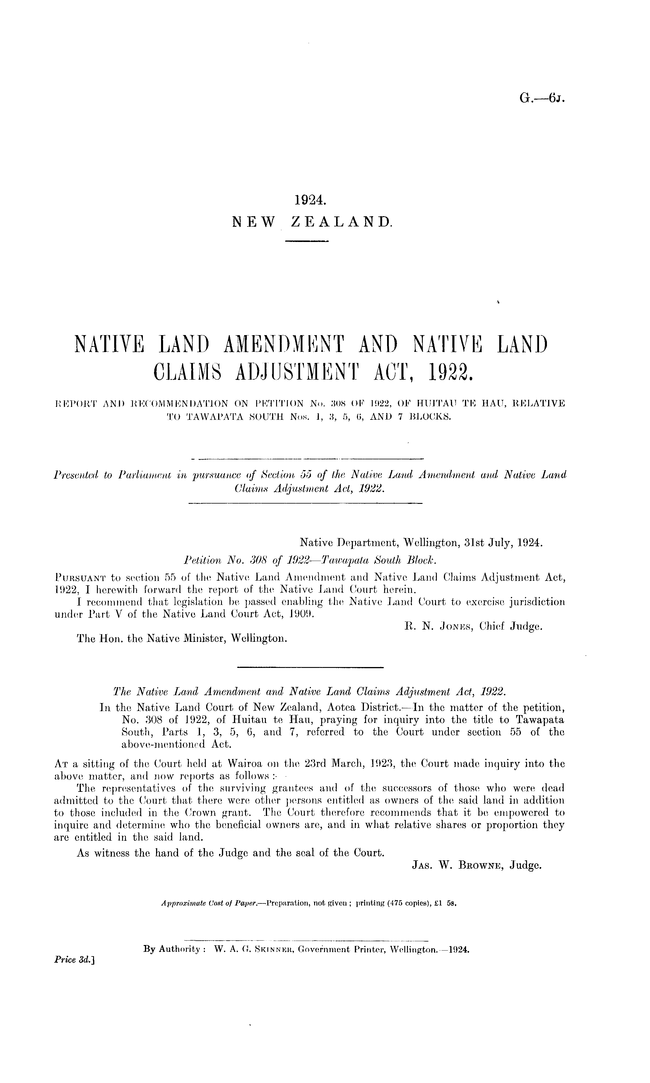 NATIVE LAND AMENDMENT AND NATIVE LAND CLAIMS ADJUSTMENT ACT, 1922. REPORT AND RECOMMENDATION ON PETITION No. 308 OF HUITAU TE HAU. RELATIVE TO TAWAPATA SOUTH Nos. 1, 3, 5, 6, AND 7 BLOCKS.