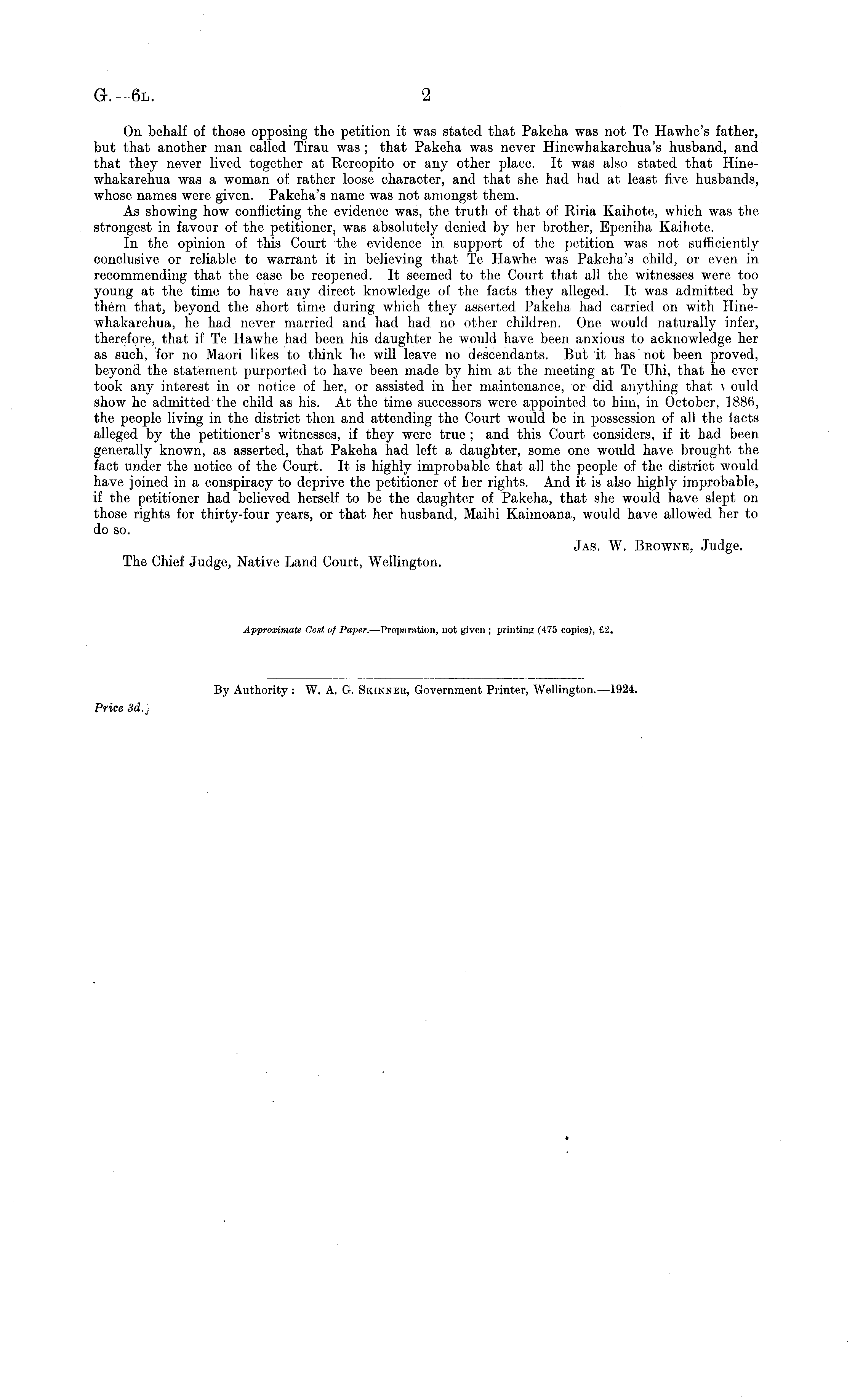 On behalf of those opposing the petition it was stated that Pakeha was not Te Hawhe's father, but that another man called Tirau was ; that Pakeha was never Hinewhakarehvia's husband, and that they never lived together at Rereopito or any other place. It was also stated that Hinewhakarchua was a woman of rather loose character, and that she had had at least five husbands, whose names were given. Pakeha's name was not amongst them. As showing how conflicting the evidence was, the truth of that of Riria Kaihote, which was the strongest in favour of the petitioner, was absolutely denied by her brother, Epeniha Kaihote. In the opinion of this Court the evidence in support of the petition was not sufficiently conclusive or reliable to warrant it in believing that Te Hawhe was Pakeha's child, or even in recommending that the case be reopened. It seemed to the Court that all the witnesses were too young at the time to have any direct knowledge of the facts they alleged. It was admitted by them that, beyond the short time during which they asserted Pakeha had carried on with Hinewhakarehua, he had never married and had had no other children. One would naturally infer, therefore, that if Te Hawhe had been his daughter he would have been anxious to acknowledge her as such, for no Maori likes to think ho will leave no descendants. But it has not been proved, beyond the statement purported to have been made by him at the meeting at To Uhi, that ho ever took any interest in or notice of her, or assisted in her maintenance, or did anything that \ ould show he admitted the child as his. At the time successors wore appointed, to him, in October, 1886, the people living in the district then and attending the Court would be in possession of all the lacts alleged by the petitioner's witnesses, if they were true ; and this Court considers, if it had been generally known, as asserted, that Pakeha had left a daughter, some one would have brought the fact under the notice of the Court. It is highly improbable that all the people of the district would have joined in a conspiracy to deprive the petitioner of her rights. And it is also highly improbable, if the petitioner had believed herself to be the daughter of Pakeha, that she would have slept on those rights for thirty-four years, or that her husband, Maihi Kaimoana, would have allowed her to do so. Jas. W. Browne, Judge. The Chief Judge, Native Land Court, Wellington.