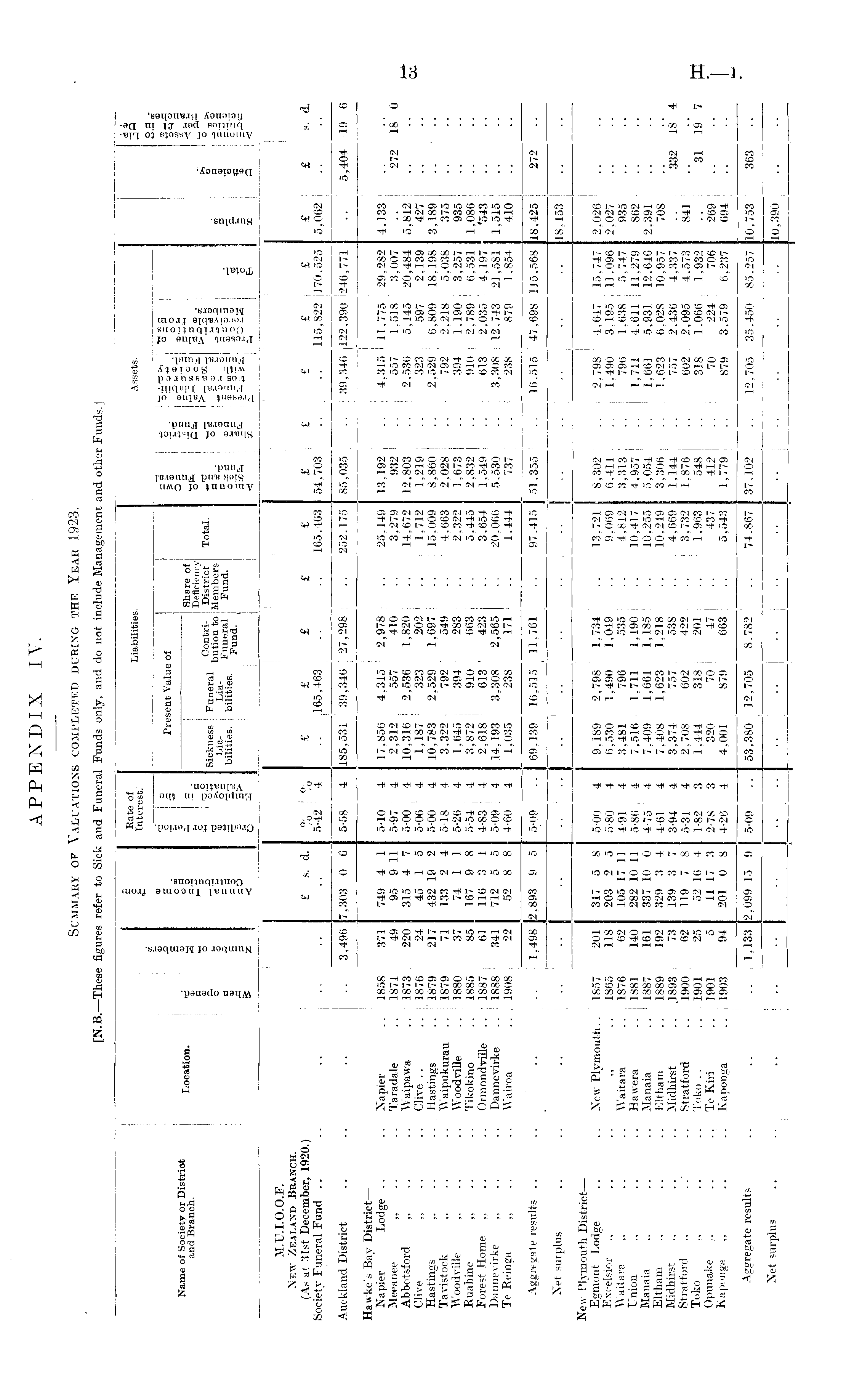 Name of Society or Distriot and Branch. Location. H o CO O CD 3 c no < Rate of Interest. id a 5 a Share of Deficieni-v Sickness | Funeral . C ?. ntri ; District' Total. Lia- Lia- b " ticm *? Members bilities. bilities. ! m *S al Fund - Present Value of Liabilities, > r- O 3 -2 5 44 [ii 44 r Q r4 P^, 5-gg £S Assets. EL Ph Assets. "5 3 ai a ai S.S a S-4J3 Or) g zz ;'3 M.U.I.O.O.F. New Zealand Branch. (As at 31st December, 1920.) Society Funeral Fund £ s. d. o/ o/ /o /o 5-42 4 £ £ 165.463 £ £ £ 165,463 £ 54,703 £ £ £ £ 115,822 170.525 5,062 £ I s. d. Auckland District .. .. 3,496 7,303 0 6 5-58 4 185,531 39,346 27,298 252.175 85.035 39,346 122,390 246,771 5,404 19 6 Hawke's Bay District — Napier Lodge .. .. Napier .. 1858 Meeanee „ .. .. Taradale .. j 1871 Abbotsford „ .. .. Waipawa .. 1873 Clive „ .. .. Clive .. .. 1876 Hastings „ .. .. ; Hastings .. ' 1879 Tavistock „ .. .. Waipukurau .. 1879 Woodville „ .. .. Woodville .. 1880 . Ruahine „ .. ... Tikokino .. j 1885 Forest Home „ .. .. i Ormondville .. j 1887 Dannevirke „ .. .. ! Dannevirke .. ! 1888 Te Reinga „ .. .. Wairoa .. I 1908 371 49 220 24 217 71 37 85 61 341 22 749 4 1 95 9 11 315 4 7 45 1 5 432 19 2 133 2 4 74 1 1 167 9 8 116 3 1 712 5 5 52 8 8 510 4 5-97 4 5-00 4 5-06 4 5-00 j 4 518 I 4 5-26 4 5-54 4 4-83 4 509 4 4-60 4 17,856 4,315 2,97S 2,312 557 410 10,316 2,536 1,820 1,187 323 202 10,783 2,529 1,697 3,322 792 549 1,645 394 283 3,872 910 663 2,618 613 423 14,193 3.308 2,565 1,035 238 171 25.149 3,279 14,672 1,712 15.009 4,663 2,322 5,445 3,654 20,066 1,444 13,192 932 12,803 1,219 8,860 2,028 1.673 2,832 1,549 5,530 737 ; 4.315 I 11,775 29,282 557 1,518 3,007 2,536 5,145 20,484 323 597 2,139 2,529 6,809 18.198 792 2,218 5,038 394 1,190 3,257 910 2,789 6,531 613 2,035 4,197 3,308 12,743 ! 21,581 238 879 1,854 4,133 5,812 427 3,189 375 935 1,086 '543 1,515 410 272 18 0 Aggregate results .. 1,498 1,498 2,893 9 5 5-09 69,139 16.515 11.761 97.415 51.355 16,515 47,698 115,568 18,425 272 r. Net surplus .. Il8,153 New Plymouth District — Egmont Lodge .. .. New Plymouth.. j 1857 Excelsior „ .. .. „ .. 1865 Waitara „ .. .. Waitara .. 1876 Union „ .. .. Hawera .. 1881 Manaia „ .. .. Manaia .. I 1887 Eltham „ .. .. Eltham .. ' 1889 Midhirst „ . .. .. Midhirst .. 1.1893 Stratford „ ..' .. Stratford .. 11900 Toko „ .. .. j Toko .. ... 1901 Opunake „ .. .. To Kiri .. i 1901 Kaponga „ .. .. Kaponga .. 1903 201 118 62 140 161 192 73 62 25 5 94 1 1 .... ._.._, 317 5 8 203 2 5 105 17 II 282 10 11 337 10 0 329 3 4 139 3 7 119 7 8 52 16 4 11 17 3 201 0 8 5-00 4 5-80 4 4-91 4 5-86 4 4-75 4 4-61 4 3-94 4 5-31 4 1-82 3 2-78 3 4-26 4 9,189 6,530 3,481 7,516 , 7.409 7,408 3,374 2,708 1,444 320 4,001 2,798 1,490 796 1,711 1,661 1,623 757 602 318 70 879 1,734 ' 1,049 535 1,190 1,185 1,218 538 422 201 47 663 13.721 9.069 4,812 10,417 10,255 10,249 4,669 3,732 1,963 437 5,543 8,302 6,411 3,313 4,957 5,054 3,306 1,144 1,876 548 412 1,779 2,798 4,647 15,747 1.490 3,195 11,096 796 1,638 5,747 1.711 4,611 11,279 1,661 ' 5,931 12,646 1,623 6,028 10,957 757 2.436 4,337 602 2,095 4,573 318 1,066 1,932 70 224 706 S79 3,579 6,237 2.026 2,027 935 862 2,391 708 332 841 31 269 694 18 4 19 7 Aggregate results 1,133 1,133 2,099 15 9 509 53,380 12,705 8.782 74,867 37,102 12,705 35,450 85,257 10,753 363 Net surplus .. 10,390 I 1 '