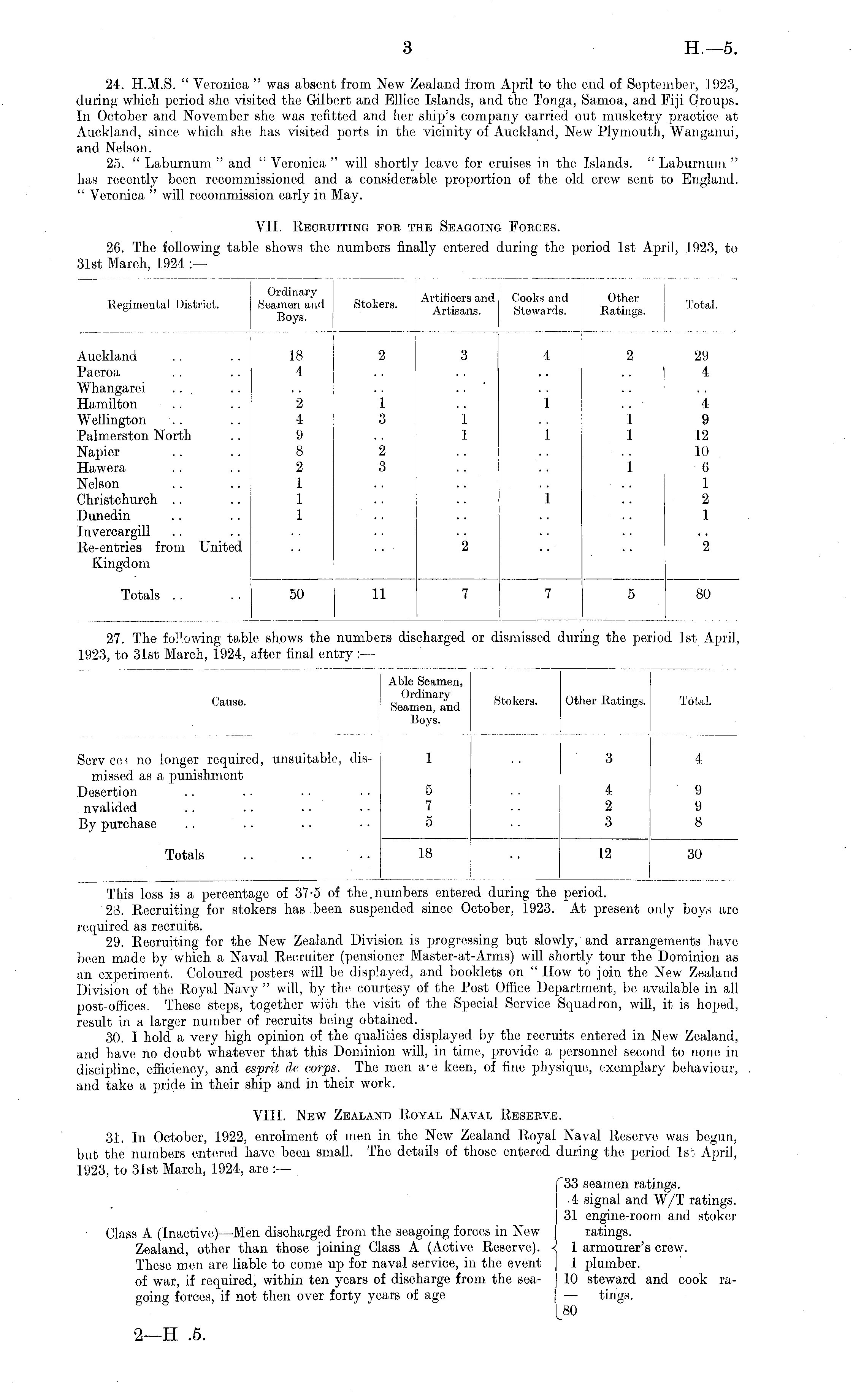 24. H.M.S. " Veronica " was absent from New Zealand from April to the end of September, 1923, during which period she visited the Gilbert and Bllice Islands, and the Tonga, Samoa, and Fiji Groups. In October and November she was refitted and her ship's company carried out musketry practice at Auckland, since which she has visited ports in the vicinity of Auckland, New Plymouth, Wanganui, and Nelson. 25. " Laburnum " and " Veronica " will shortly leave for cruises in the Islands. " Laburnum " has recently been recommissioned and a considerable proportion of the old crew sent to England. " Veronica " will rccommission early in May. VII. Recruiting for the Seagoing Forces. 26. The following table shows the, numbers finally entered during the period Ist April, 1923, to 31st March, 1924 :—