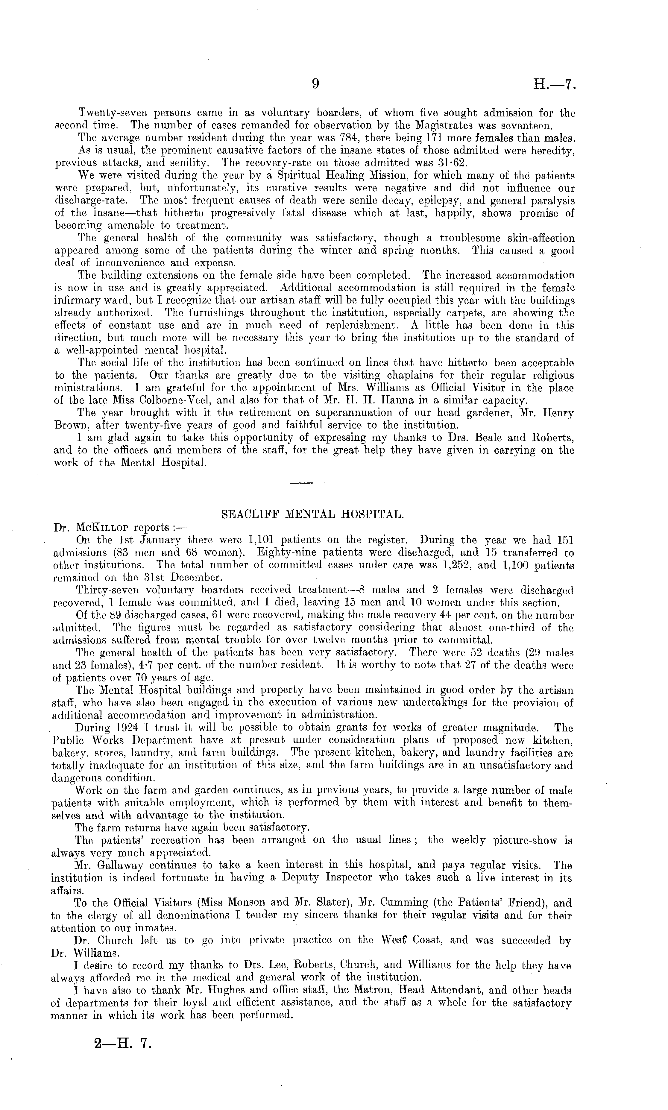 Twenty-seven persons came in as voluntary boarders, of whom five sought admission for the second time. The number of cases remanded for observation by the Magistrates was seventeen. The average number resident during the year was 784, there being 171 more females than males. As is usual, the prominent causative factors of the insane states of those admitted were heredity, previous attacks, and senility. The recovery-rate on those admitted was 31-62. We were visited during the year by a Spiritual Healing Mission, for which many of the patients were prepared, but, unfortunately, its curative results were negative and did not influence our discharge-rate. The most frequent causes of death were senile decay, epilepsy, and general paralysis of the insane—that hitherto progressively fatal disease which at last, happily, shows promise of becoming amenable to treatment. The general health of the community was satisfactory, though a troublesome skin-affection appeared among some of the patients during the winter and spring months. This caused a good deal of inconvenience and expense. The building extensions on the female side have been completed. The increased accommodation is now in use and is greatly appreciated. Additional accommodation is still required in the female infirmary ward, but I recognize that our artisan staff will be fully occupied this year with the buildings already authorized. The furnishings throughout the institution, especially carpets, are showing the effects of constant use and are in much need of replenishment. A little has been done in this direction, but much more will be necessary this year to bring the institution up to the standard of a well-appointed mental hospital. The social life of the institution has been continued on lines that have hitherto been acceptable to the patients. Our thanks are greatly due to the visiting chaplains for their regular religious ministrations. I am grateful for the appointment of Mrs. Williams as Official Visitor in the place of the late Miss Colborne-Veel, anil also for that of Mr. H. H. Hanna in a similar capacity. The year brought with it the retirement on superannuation of our head gardener, Mr. Henry Brown, after twenty-five years of good and faithful service to the institution. I am glad again to take this opportunity of expressing my thanks to Drs. Beale and Roberts, and to the officers and members of the staff, for the great help they have given in carrying on the work of the Mental Hospital. SEACLIFF MENTAL HOSPITAL. Dr. MoKillop reports :—- On the Ist January there were 1,101 patients on the register. During the year we had 151 admissions (83 men and 68 women). Eighty-nine patients were discharged, and 15 transferred to other institutions. The total number of committed cases under care was 1,252, and 1,100 patients remained on the 3lst December. Thirty-seven voluntary boarders received treatment —8 males and 2 females were discharged recovered, 1 female was committed, and I died, leaving 15 men and 10 women under this section. Of the 89 discharged cases, 61 were recovered, making the male recovery 44 per cent, on the number admitted. The figures must be regarded as satisfactory considering that almost one-third of the admissions suffered from mental trouble, for over twelve months prior to committal. The general health of the patients has been very satisfactory. There were 52 deaths (29 males and 23 females), 4-7 per cent, of the, number resident. It is worthy to note that 27 of the deaths were of patients over 70 years of age. The Mental Hospital buildings and property have been maintained in good order by the artisan staff, who have also been engaged in the execution of various new undertakings for the provision of additional accommodation and improvement in administration. During 1924 I trust it will be, possible to obtain grants for works of greater magnitude. The Public Works Department have, at present under consideration plans of proposed now kitchen, bakery, stores, laundry, and farm, buildings. The present kitchen, bakery, and laundry facilities are totally inadequate for an institution of this size, and the farm buildings are in an unsatisfactory and dangerous condition. Work on the farm and garden continues, as in previous years, to provide a large number of male patients with suitable employment, which is performed by them with interest and benefit to themselves and with advantage to the institution. The farm returns have again been satisfactory. The patients' recreation has been arranged on the usual lines ; the weekly picture-show is always very much appreciated. Mr. Gallaway continues to take a keen interest in this hospital, and pays regular visits. The institution is indeed fortunate in having a Deputy Inspector who takes such a live interest in its affairs. To the Official Visitors (Miss Monson and Mr. Slater), Mr. dimming (the Patients' Friend), and to the clergy of all denominations I tender my sincere thanks for their regular visits and for their attention to our inmates. Dr. Church left us to go into private practice on the WesfJ Coast, and was succeeded by Dr. Williams. I desire to record my thanks to Drs. Lee, Roberts, Church, and Williams for the help they have always afforded mo in the medical and general work of the institution. I have also to thank Mr. Hughes and office staff, the Matron, Head Attendant, and other heads of departments for their loyal and efficient assistance, and the staff as a whole for the satisfactory manner in which its work has been performed.