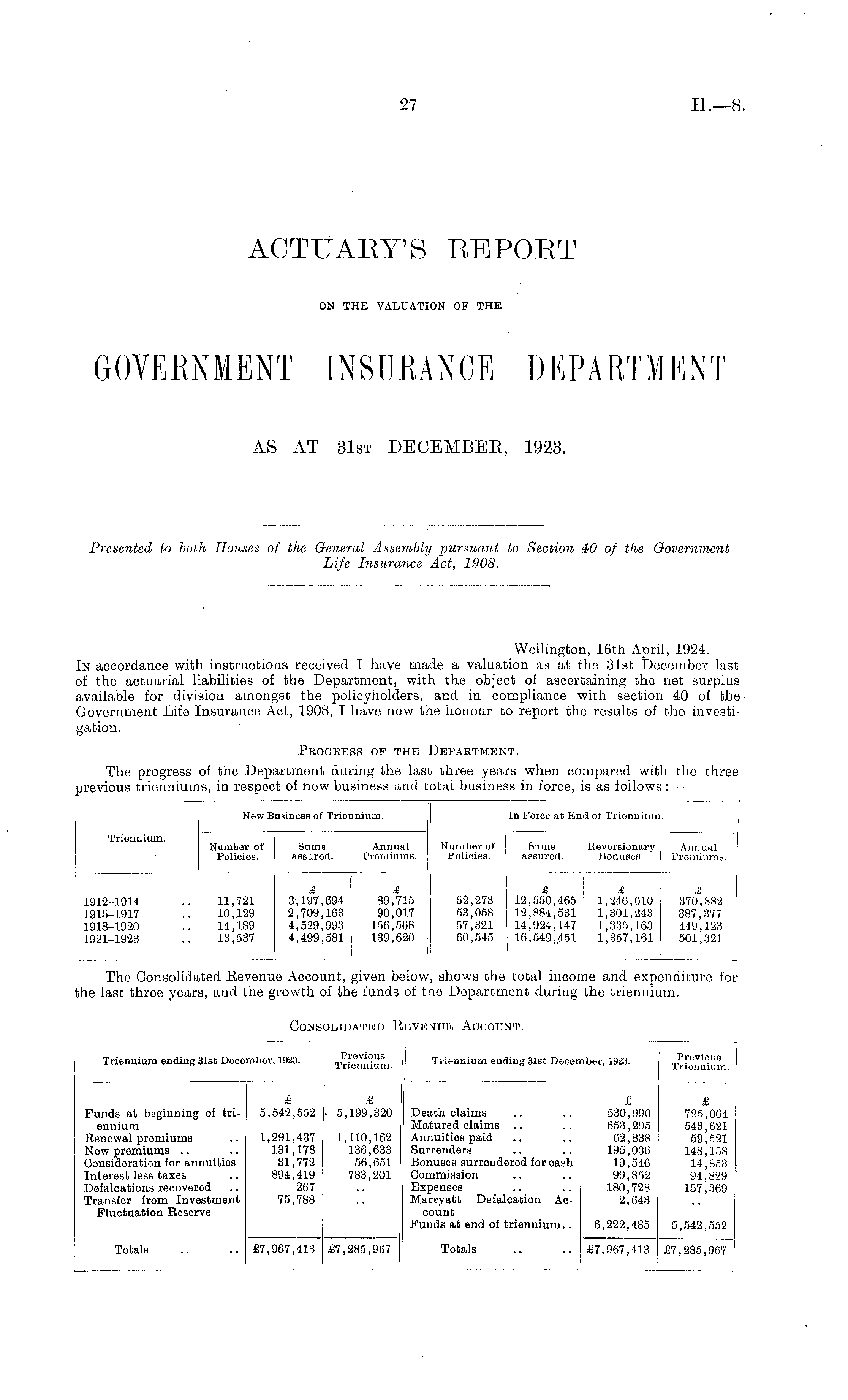 ACTUAKY'S EEPOET ON THE VALUATION OF THE GOVERNMENT INSURANCE DEPARTMENT AS AT 31st DEOEMBEB, 1923.