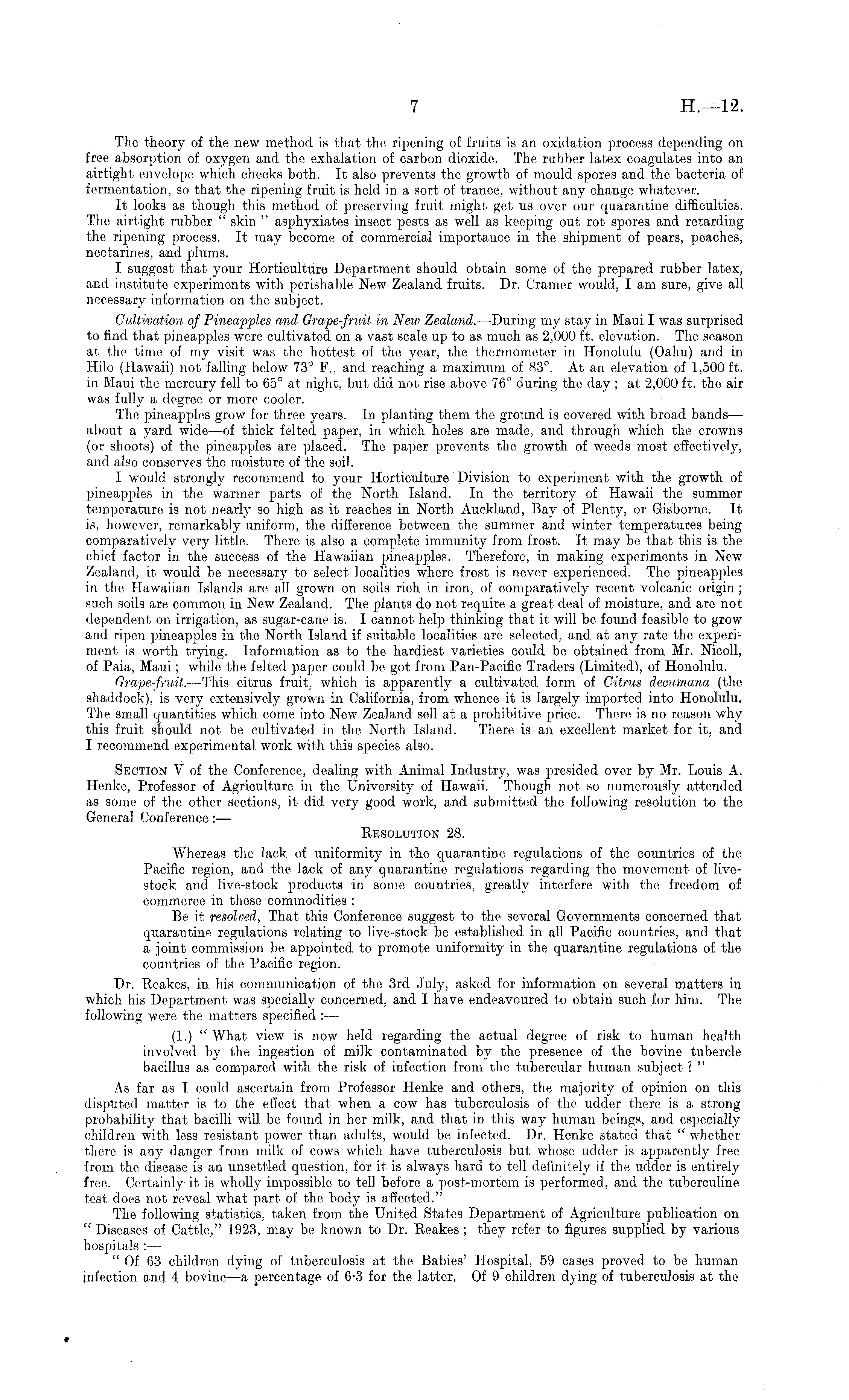 The theory of the new method is that the ripening of fruits is an oxidation process elepending on free absorption of oxygen anei the exhalation of carbon dioxide. The rubber latex coagulates into an airtight envelope which checks both. It also prevents the growth of mould spores and the bacteria of fermentation, so that the ripening fruit is held in a sort of trance, without any change whatever. It looks as though this method of preserving fruit might get us over our quarantine difficulties. The airtight rubber " skin " asphyxiates insect pests as well as keeping out rot spores and retarding the ripening process. It may become of commercial importance in the shipment of pears, peaches, nectarines, and plums. I suggest that your Horticulture Department shoulel obtain some of the prepareel rubber latex, and institute experiments with perishable New Zealand fruits. Dr. Cramer would, lam sure, give all necessary information on the subject. Cultivation of Pineapples and Grape-fruit in New Zealand. —During my stay in Maui I was surprised to find that pineapples were cultivated on a vast scale up to as much as 2,000 ft. elevation. The season at the time of my visit was the hottest of the year, the thermometer in Honolulu (Oahu) and in Hilo (Hawaii) not falling below 73° F., and reaching a maximum of 83°. At an elevation of 1,500 ft. in Maui the mercury fell to 65° at night, but did not rise above 76° during the; day ; at 2,000 ft. the air was fully a degree or more cooler. The pineapples grow for three years. In planting them the ground is covered with broatl bands — about a yard wide—of thick felted paper, in which holes are made, anei through which the crowns (or shoots) of the pineapples are placed. The paper prevents the growth of weeds most effectively, and also conserves the moisture of the soil. T would strongly recommend to your Horticulture Division to experiment with the growth of pineapples in the warmer parts of the North Island. In the territory of Hawaii the summer temperature is not nearly so high as it reaches in North Auckland, Bay of Plenty, or Gisborne. It is, however, remarkably uniform, the difference between the summer and winter temperatures being comparatively very little. There is also a complete immunity from frost. It may be that this is the chief factor in the success of the Hawaiian pineapples. Therefore, in making experiments in New Zealand, it would be necessary to select localities where frost is never experienced. The pineapples in the Hawaiian Islands are all grown on soils rich in iron, of comparatively recent volcanic origin ; such soils are common in New Zealand. The plants do not require a great elcal of moisture, and are not dependent on irrigation, as sugar-cane is. I cannot help thinking that it will be found feasible to grow and ripen pineapples in the North Island if suitable localities are selected, and at any rate the experiment is worth trying. Information as to the hardiest varieties could bo obtained from Mr. Nicoll, of Paia, Maui; while the felted paper could be got from Pan-Pacific Traders (Limited), of Honolulu. Grape-fruit. —This citrus fruit, which is apparently a cultivated form of Citrus decumana (the shaddock), is very extensively grown in California, from whence it is largely imported into Honolulu. The small quantities which come into New Zealanel sell at a prohibitive price. There is no reason why this fruit should not be cultivated in the North Island. There is an excellent market for it, and I recommend experimental, work with this species also. Section V of the Conference, dealing with Animal Inelustry, was presidcel over by Mr. Louis A. Henke, Profe:ssor of Agriculture in the University of Hawaii. Though not so numerously attended as some of the other sections, it did very good work, and submitteel the following resolution to the General Conference:— Resolution 28. Whereas the lack of uniformity in the quarantine: regulations of the countries of the Pacific region, and the lack of any quarantine regulations regarding the movement of livestock and live-stock proelucts in some countries, greatly interfere with the freedom of commerce in these commodities : Be it resolved, That this Conference suggest to the several Governments concerneel that quarantine regulations relating to live-stock be established in all Pacific countries, and that a joint commission be appointed, to promote uniformity in the quarantine regulations of the countries of the Pacific region. Dr. Reakes, in his communication of the 3rd July, asked for information on several matters in which his Department was specially concerned, and I have endeavoureel to obtain such for him. The following were the matters specified : — (].) "What vievw is now held regarding the actual degree of risk to human health involved by the ingestiem of milk contaminated by the presemce of the bovine tubercle, bacillus as compared with the risk of infection from the tubercular human subject ? " As far as I could ascertain from Professor Henke and others, the majority of opinion on this disputed matter is to the effect that when a cow has tuberculosis of the; udder there is a strong probability that bacilli will be found in her milk, and that in this way human beings, and especially children with less resistant power than adults, would be infected. Dr. Henke stated that " whether there; is any danger from milk of ce>ws which have tuberculosis but whose udder is apparently free from the disease is an unsettled question, for it is always hard to tell definitely if the udder is entirely free. Certainly it is wholly impossible to tell before a post-mortem is performed, and the tuberculine test does not reveal what part of the body is affected." The following statistics, taken from the United States Department of Agriculture publication on " Diseases of Cattle," 1923, may be known to Dr. Reakes ; they refer to figures supplied by various hospitals : — " Of 63 children dying of tub