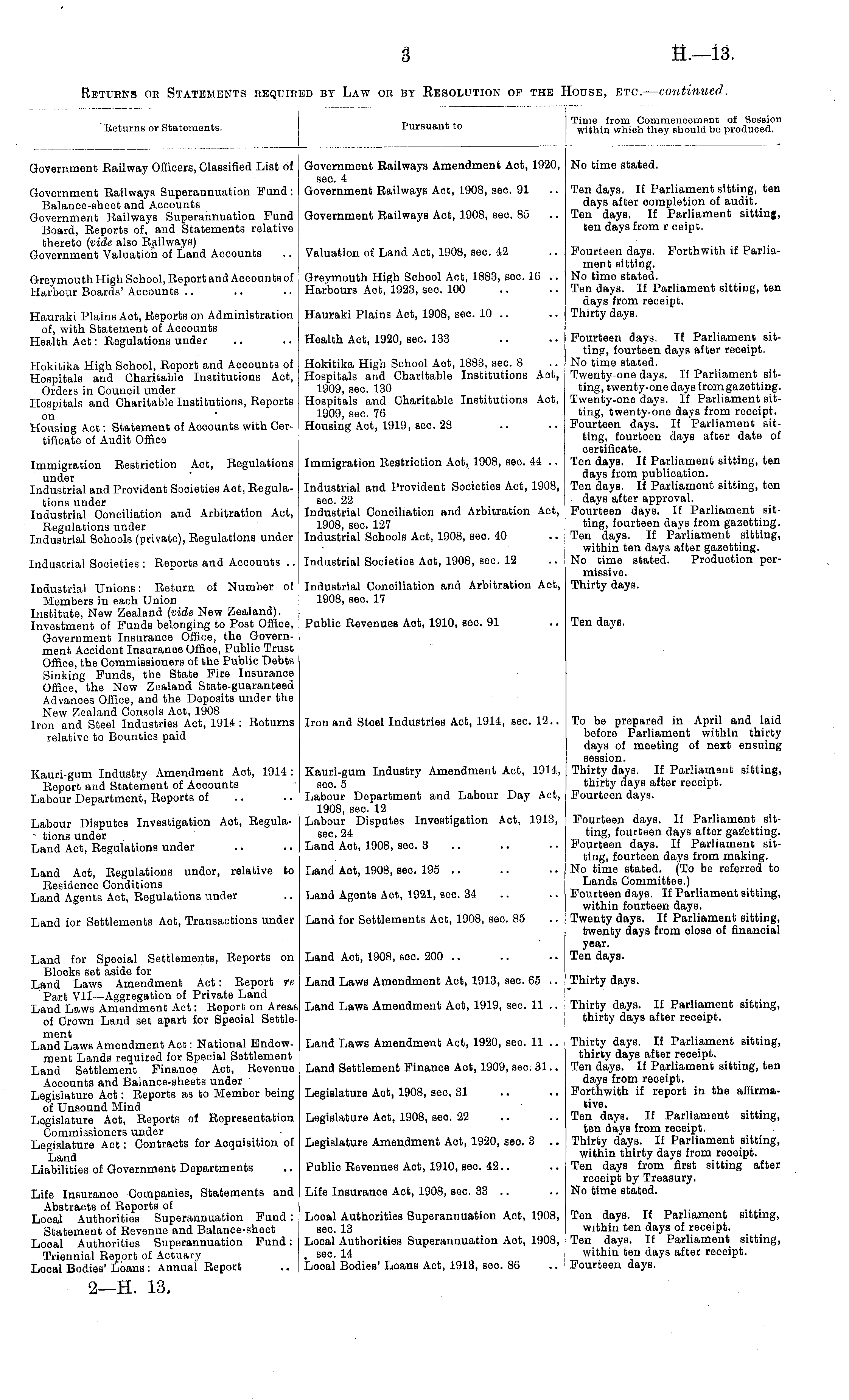 ' Returns or Statements. Pursuant to Time from Commencement of Sessioi within which they should be produced. Government Railway Officers, Classified List of Government Railways Amendment Act, 1920, sec. 4 Government Railways Aot, 1908, sec. 91 No time stated. Government Railways Superannuation Fund: Balance-sheet and Aocounts Government Railways Superannuation Fund Board, Reports of, and Statements relative thereto (vide also Railways) Government Valuation of Land Accounts Government Railways Act, 1908, sec. 85 Ten days. If Parliament sitting, ten days after completion of audit. Ten days. If Parliament sitting, ten days from r ceipt. Valuation of Land Act, 1908, sec. 42 Fourteen days. Forthwith if Parliament sitting. No time stated. Ten days. If Parliament sitting, ten days from receipt. Thirty days. Greymouth High School, Report and Aocounts of Harbour Boards' Accounts Greymouth High School Act, 1883, sec. 16 .. Harbours Act, 1923, sec. 100 Hauraki Plains Aot, Reports on Administration of, with Statement of Accounts Health Act: Regulations under Hauraki Plains Act, 1908, sec. 10 .. Hokitika High School, Report and Accounts of Hospitals and Charitable Institutions Aot, Orders in Council under Hospitals and Charitable Institutions, Reports on Housing Act: Statement of Acoounts with Certificate of Audit Offioe Immigration Restriction Act, Regulations under Industrial and Provident Societios Aot, Regulations under Industrial Conciliation and Arbitration Act, Regulations under Industrial Schools (private), Regulations under Health Act, 1920, sec. 133 Hokitika High School Aot, 1883, sec. 8 Hospitals and Charitable Institutions Aot, 1909, sec 130 Hospitals and Charitable Institutions Act, 1909, sec. 76 Housing Act, 1919, sec. 28 Immigration Restriction Act, 1908, sec 44 .. Fourteen days. If Parliament sitting, fourteen days after reoeipt. No time stated. Twenty-one days. If Parliament sitting, twenty-one days from gazetting. Twenty-one days. If Parliament sitting, twenty-one days from receipt. Fourteen days. If Parliament sitting, fourteen days after date of certificate. Ten days. If Parliament sitting, ten days from publication. Ten days. If Parliament sitting, ten days after approval. Fourteen days. If Parliament sitting, fourteen days from gazetting. Ten days. If Parliament sitting, within ten days after gazetting. No time stated. Production permissive. Thirty days. Industrial and Provident Societies Act, 1908, sec. 22 Industrial Conciliation and Arbitration Act, 1908, sec. 127 Industrial Schools Act, 1908, sec 40 Industrial Societies : Reports and Acoounts .. Industrial Societies Aot, 1908, sec. 12 Industrial Unions: Return of Number of Members in each Union Institute, New Zealand (vide New Zoaland). Investment of Funds belonging to Post Offioe, Government Insurance Offioe, the Government Accident Insurance Offioe, Public Trust Office, the Commissioners of the Public Debts Sinking Funds, the State Fire Insurance Office, the New Zealand State-guaranteed Advanoes Office, and the Deposits under the New Zealand Consols Act, 1908 Iron and Steel Industries Act, 1914 : Returns relative to Bounties paid Industrial Conciliation and Arbitration Aot, 1908, sec. 17 Public Revenues Act, 1910, Bee 91 Ten days. Iron and Steel Industries Act, 1914, sec. 12.. To be prepared in April and laid before Parliament within thirty days of meeting of next ensuing session. Thirty days. If Parliament sitting, thirty days after receipt. Fourteen days. Kauri-gum Industry Amendment Act, 1914 : Report and Statement of Aocounts Labour Department, Reports of Kauri-gum Industry Amendment Act, 1914, sec. 5 Labour Department and Labour Day Act, 1908, sec 12 Labour Disputes Investigation Act, 1913, sec 24 Land Aot, 1908, sec. 3 Labour Disputes Investigation Act, Regula- ■ tions under Land Act, Regulations under Land Aot, Regulations under, relative to Residence Conditions Land Agents Act, Regulations under Land Act, 1908, sec. 195 .. Land Agents Aot, 1921, sec. 34 Fourtoen days. If Parliament sitting, fourteen days after gazetting. Fourteon days. If Parliament sitting, fourteen days from making. No time stated. (To be referred to Lands Committee.) Fourteen days. If Parliament Bitting, within fourteen days. Twenty days. If Parliament sitting, twenty days from olose of financial year. Ten days. Land tor Settlements Aot, Transactions under Land for Settlements Aot, 1908, sec. 85 Land for Speoial Settlements, Reports on Blocks set aside for Land Laws Amendment Act: Report re Part VII—Aggregation of Private Land Land Laws Amendment Act: Report on Areas of Crown Land set apart for Speoial Settlement Land Laws Amendment Act: National Endowment Lands required for Special Settlement Land Settlement Finance Act, Revenue Accounts and Balance-sheets under Legislature Act: Reports as to Member being of Unsound Mind Legislature Act, Reports of Representation Commissioners under Legislature Aot: Contracts for Acquisition of Land Liabilities of Government Departments Land Act, 1908, sec 200 .. Land Laws Amendment Aot, 1913, sec. 65 .. Land Laws Amendment Aot, 1919, sec. 11 .. Land Laws Amendment Act, 1920, sec 11 .. Land Settlement Finance Aot, 1909, see; 31.. Thirty days. Thirty days. If Parliament sitting, thirty days after receipt. Thirty days. If Parliament sitting, thirty days after reoeipt. Ten days. If Parliament sitting, ten days from receipt. Forthwith if report in the affirmative. Ten days. If Parliament sitting, ten days from receipt. Thirty days. If Parliament sitting, within thirty days from receipt. Ten days from first sitting after reoeipt by Treasury. No time stated. Legislature Aot, 1908, sec. 31 Legislature Act, 1908, sec 22 Legislature Amendment Act, 1920, sec 3 .. Public Revenues Aot, 1910, sec 42.. Life Insurance Companies, Statements and Abstracts of Reports of Looal Authorities Superannuation Fund : Statement of Revenue and Balance-sheet Looal Authorities Superannuation Fund: Triennial Report of Actuary Local Bodies