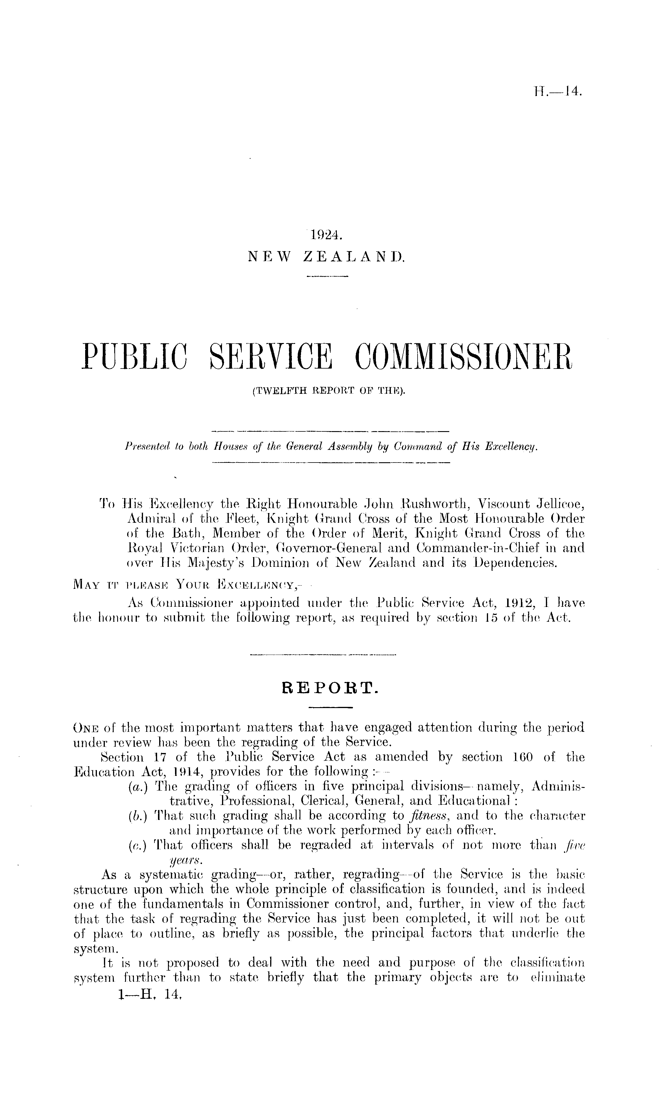 To His Excellency the Eight Honourable John Eushworth, Viscount Jellicoe, Admiral of the Fleet, Knight Grand Cross of the Most Honourable Order of the Bath, Member of the Order of Merit, Knight Grand Cross of the Royal Victorian Order, Governor-General and Commander-in-Chief in and over His Majesty's Dominion of New Zealand and its Dependencies. May it please Your Excellency,--As Commissioner appointed under the Public Service Act, 1912, I have the honour to submit the following report, as required by section 15 of the Act. REPORT. One of the most important matters that have engaged attention during the period under review has been the regrading of the Service. Section 17 of the Public Service Act as amended by section 160 of the Education Act, 1914, provides for the following :— (a.) The grading of officers in five principal divisions—namely, Administrative, Professional, Clerical, General, and Educational : (b.) That such grading shall be according to fitness, and to the character and importance of the work performed by each officer. (r:.) That officers shall be regraded at intervals of not more than five years. As a systematic grading —or, rather, regrading—of the Service is the basic structure upon which the whole principle of classification is founded, and is indeed one of the fundamentals in Commissioner control, and, further, in view of the fact that the task of regrading the Service has just been completed, it will not be out of place to outline, as briefly as possible, the principal factors that underlie the system. It is not proposed to deal with the need and purpose of the classification system further than to state briefly that the primary objects are to eliminate