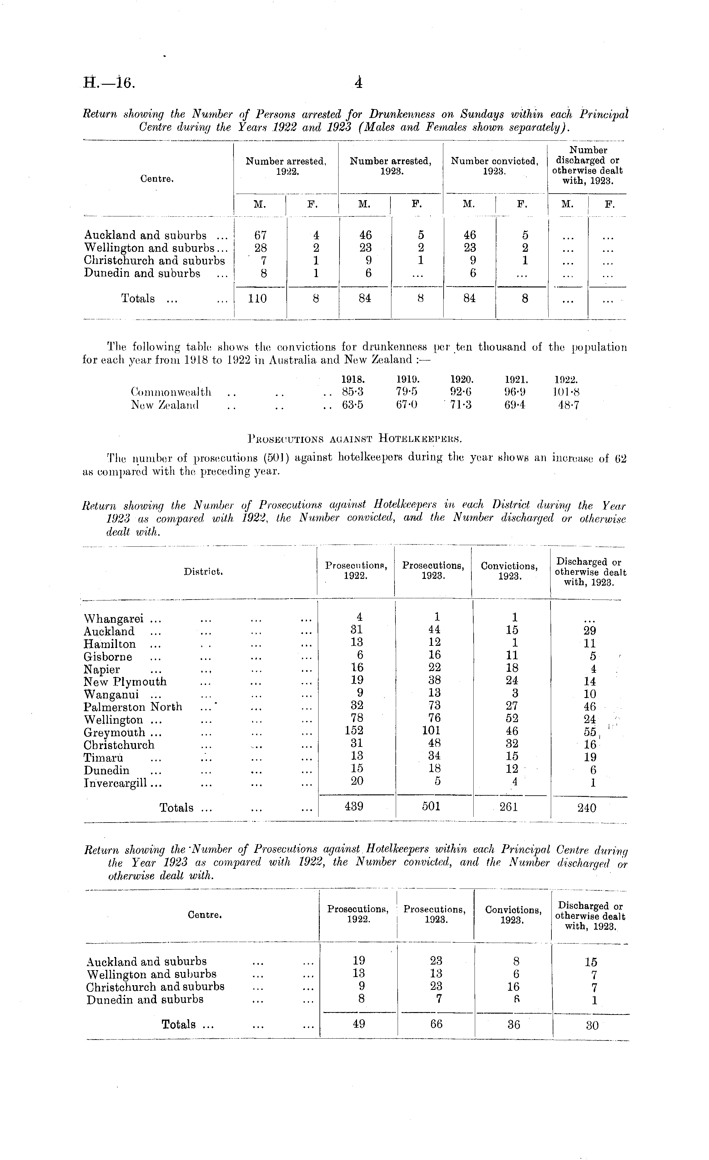 Return showing the Number Centre during the of Persons arrestee Years 1.922 and li i for Drunkenness < 123 (Males and Fen <>n Sundays within each P; nales shown separately). rincipa! Number arrested, 1922. Number arrested, 1923. Nun Numbor convicted, dischai 1923. otherwi: with, M. F. M. nber •ged or se dealt 1923. Centre. M. F. M. F. F. Auckland and suburbs ... Wellington and suburbs... Christchurch and suburbs Dunedin and suburbs 67 28 7 8 4 2 1 1 46 23 9 6 5 2 1 46 5 23 2 9 1 6 Totals ... ... 110 8 84 8 84 8 84 84 The following table shows the convictions for drunkenness per ten thousand of the population for each year from 1918 to 1922 in Australia and New Zealand : — 1918. 1919. 1920. 1921. 1922. Commonwealth .. .. .. 85-3 79-5 92-6 96-9 101-8 New Zealand .. .. .. 63-5 67-0 71-3 69-4 48-7 Prosecutions against Hotelkeepers. The number of prosecutions (501) against hotelkeepers during the year shows an increase of 62 as compared with the preceding year. Return showing the Number of Prosecutions against Hotelkeepers in each District during the Year 1923 as compared, with 1922, the Number convicted, ark the Number discharged or otherwise dealt with. r., , , . Prosecutions, Prosecutions, Convictions, Discharged or District. 2922 1923 1923 otherwise dealt with, 1923. __ , , , Whangarei ... ... ... ••• 4 1 1 Auckland ... ... ... ... 31 44 15 29 Hamilton ... . . 13 12 1 11 Gisborne ... ... ... ... 6 16 11 5 Napier 16 22 18 4 . New Plymouth ... ... ... 19 38 24 14 Wanganui ... ... ... ... 9 13 3 10 Palmerston North ... - ... ... 32 73 27 46 Wellington ... 78 76 52 24 ',- Greymouth ... ... 152 101 46 55, ' Christchurch ... .... ... 31 48 32 16 Timaru ... ... ... ••• 13 34 15 19 Dunedin 15 18 12 6 Invereargill... ... ... ... 20 5 4 1 4 31 13 6 16 19 9 32 78 152 31 13 15 20 1 44 12 16 22 38 13 73 76 101 48 34 18 5 1 15 1 11 18 24 3 27 52 46 32 15 12 4 29 11 5 4 14 10 46 24 ', 55, ' 16 19 6 1 Totals ... ... ... 439 501 261 240 439 501 , 261 240 Return showing the 'Number of Prosecutions the Year 1923 as compared with 1922 otherwise dealt with. against Hotel ', the Numbei 'eeepers within each Principal Centre during ' convicted, and the Number discharged or Centre. Prosecutions, 1922. I Prosecutions, Conviotions, or 2923 1923 otherwise dealt with, 1923. Auckland and suburbs Wellington and suburbs Christchurch and suburbs Dunedin and suburbs 19 13 9 8 23 13 23 7 8 6 L6 R 15 7 7 1 Totals ... 49 66 36 30