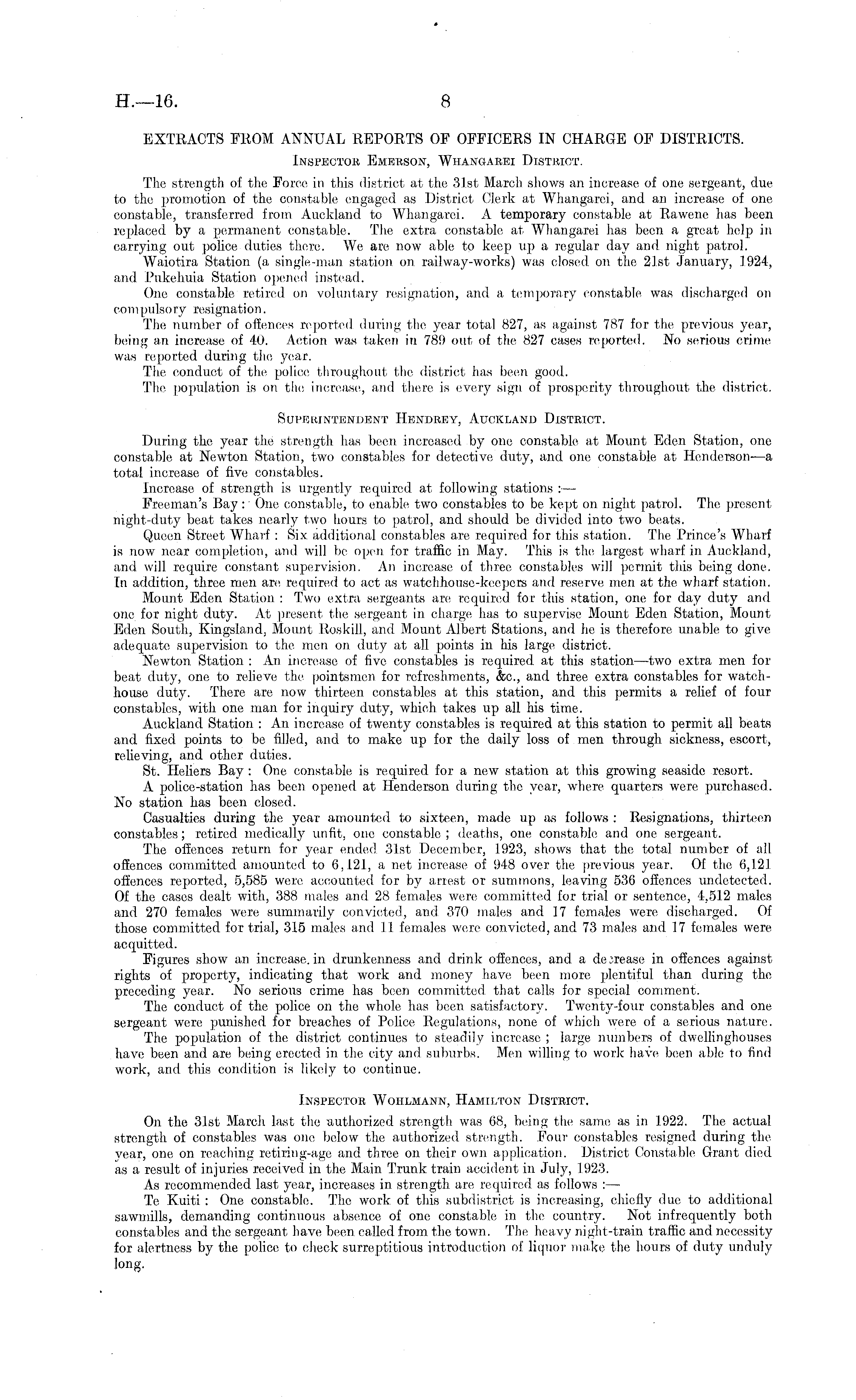 EXTRACTS FROM ANNUAL REPORTS OF OFFICERS IN CHARGE OF DISTRICTS. Inspector Emerson, Whangarei District. The strength of the Force in this district at the 31st March shows an increase of one sergeant, due to the promotion of the constable engaged as District Clerk at Whangarei, and an increase of one constable, transferred from Auckland to Whangarei. A temporary constable at Rawene has been replaced by a permanent constable. The extra constable at Whangarei has been a great help in carrying out police duties there. We are now able to keep up a regular day and night patrol. Waiotira Station (a single-man station on railway-works) was closed on the 21st January, 1924, and Pukehuia Station opened instead. One constable retired on voluntary resignation, and a, temporary constable was discharged on com pulsory resignation. The number of offences reported during the year total 827, as against 787 for the previous year, being an increase of 40. Action was taken in 789 out of the 827 cases reported. No serious crime was reported during the year. The conduct of the police throughout the district has been good. The population is on the increase, and there is every sign of prosperity throughout the district. SUPERINTENDENT HENDREY, AUCKLAND DISTRICT. During the year the strength has been increased by one constable at Mount Eden Station, one constable at Newton. Station, two constables for detective duty, and. one constable at Henderson—a total increase of five constables. Increase of strength is urgently required at following stations : — Freeman's Bay : One constable, to enable two constables to be kept on night patrol. The present night-duty beat takes nearly two hours to patrol, and should be divided into two beats. Queen Street Wharf : Six additional constables are required for this station. The Prince's Wharf is now near completion, and will be open for traffic in May. This is the largest wharf in Auckland, and will require constant supervision. An increase of three constables will permit this being done. In addition, three men are required to act as watchhouse-keepers and reserve men at the wharf station. Mount Eden Station : Two extra sergeants are required for this station, one for day duty and one for night duty. At present the sergeant in charge has to supervise Mount Eden Station, Mount Eden South, Kingsland, Mount Roskill, and Mount Albert Stations, and he is therefore unable to give adequate supervision to the men on duty at all points in his large district. Newton Station : An increase of five constables is required at this station —two extra men for beat duty, one to relieve the pointsmen for refreshments, &c, and three extra constables for watchhouse duty. There are now thirteen constables at this station, and this permits a relief of four constables, with one man for inquiry duty, which takes up all his time. Auckland Station : An increase of twenty constables is required at this station to permit all beats and fixed points to be filled, and to make up for the daily loss of men through sickness, escort, relieving, and other duties. St. Heliers Bay : One constable is required for a new station at this growing seaside resort. A police-station has been opened at Henderson during the year, where quarters were purchased. No station has been closed. Casualties during the year amounted to sixteen, made up as follows : Resignations, thirteen constables; retired medically unfit, one constable ; deaths, one constable and one sergeant. The offences return for year ended 31st December, 1923, shows that the total number of all offences committed amounted to 6,121, a net increase of 948 over the previous year. Of the 6,121 offences reported, 5,585 were accounted for by arrest or summons, leaving 536 offences undetected. Of the cases dealt with, 388 males and 28 females were committed for trial or sentence, 4.512 males and 270 females were summarily convicted, and. 370 males and 17 females were discharged. Of those committed for trial, 315 males arid 11 females wore convicted, and 73 males and. 17 females were acquitted. Figures show an increase, in drunkenness and drink offences, and a decrease in offences against rights of property, indicating that work and money have been more plentiful than during the preceding year. No serious crime has been committed that calls for special comment. The conduct of the police on the whole has been satisfactory. Twenty-four constables and one sergeant were punished for breaches of Police Regulations, none of which were of a serious nature. The population of the district continues to steadily increase ; large numbers of dwellinghouses have been and are being erected in the city and suburbs. Men willing to work have been able to find work, and this condition is likely to continue. Inspector Wohlmann, Hamilton District. On the 31st March last the authorized strength was 68, being the same as in 1922. The actual strength of constables was one below the authorized strength. Four constables resigned during the year, one on reaching retiring-age and three on their own application. District Constable Grant died as a result of injuries received in the Main Trunk train accident in July, 1923. As recommended, last year, increases in strength are required as follows : — Te Kuiti : One constable. The work of this subdistrict is increasing, chiefly due to additional sawmills, demanding continuous absence of one constable in the country. Not infrequently both constables and the sergeant have been called from the town. The heavy night-train traffic and necessity for alertness by the police to check surreptitious introduction of liquor make the hours of duty unduly long.