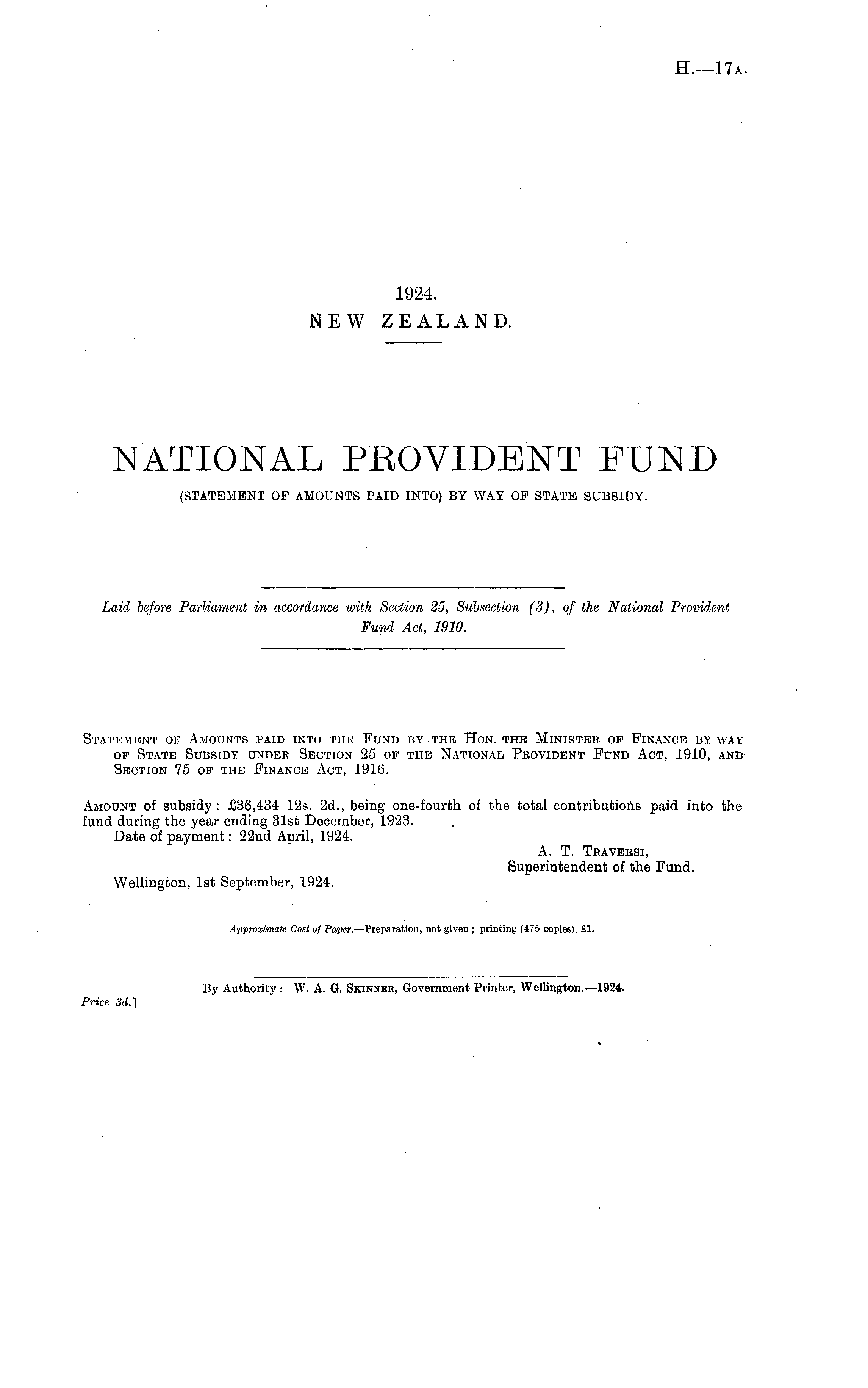 Statement of Amounts paid into the Fund by the Hon. the Minister of Finance by way of State Subsidy under Section 25 of the National Provident Fund Act, 1910, and Section 75 of the Finance Act, 1916. Amount of subsidy : £36,434 12s. 2d., being one-fourth of the total contributions paid into the fund during the year ending 31st December, 1923. Date of payment: 22nd April, 1924. A. T. Traversi, Superintendent of the Fund. Wellington, Ist September, 1924.