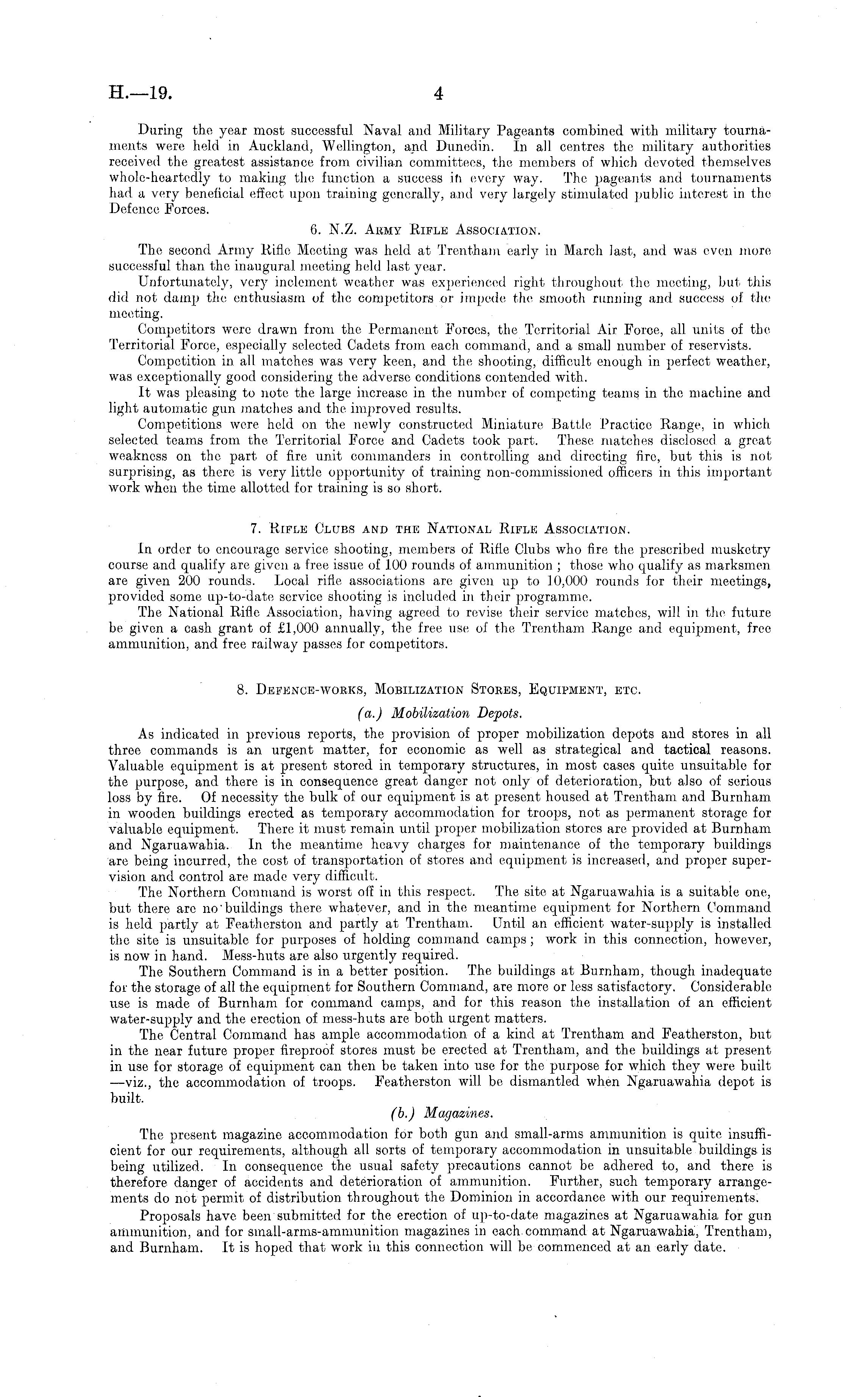 During the year most successful Naval and Military Pageants combined with military tournaments were held in Auckland, Wellington, and Dunedin. In all centres the military authorities received the greatest assistance from civilian committees, the members of which devoted themselves whole-heartedly to making the function a success in every way. The pageants and tournaments had a very beneficial effect upon training generally, and very largely stimulated public interest in the Defence Forces. 6. N.Z. Army Rifle Association. The second Army Rifle Meeting was held at Trentham early in March last, and was even more successful than the inaugural meeting held last year. Unfortunately, very inclement weather was experienced right throughout the meeting, but this did not damp the enthusiasm of the competitors or impede the smooth running and success of the meeting. Competitors were drawn from the Permanent Forces, the Territorial Air Force, all units of the Territorial Force, especially selected Cadets from each command, and a small number of reservists. Competition in all matches was very keen, and the shooting, difficult enough in perfect weather, was exceptionally good considering the adverse conditions contended with. It was pleasing to note the large increase in the number of competing teams in the machine and light automatic gun matches and the improved results. Competitions were held on the newly constructed Miniature Battle Practice Range, in which selected teams from the, Territorial Force and Cadets took part. These matches disclosed a great weakness on the part of fire unit commanders in controlling and directing fire, but this is not surprising, as there is very little opportunity of training non-commissioned officers in this important work when the time allotted for training is so short. 7. Rifle Clubs and the National Rifle Association. In order to encourage service shooting, members of Rifle Clubs who fire the prescribed musketry course and qualify are given a free issue of 100 rounds of ammunition ; those who qualify as marksmen are given 200 rounds. Local rifle associations are given up to 10,000 rounds for their meetings, provided some up-to-date service shooting is included in their programme. The National Rifle Association, having agreed to revise their service matches, will in the future be given a cash grant of £1,000 annually, the free use of the Trentham Range and equipment, free ammunition, and free railway passes for competitors. 8. Defence-works, Mobilization Stores, Equipment, etc. (a.) Mobilization Depots. As indicated in previous reports, the provision of proper mobilization depots and stores in all three commands is an urgent matter, for economic as well as strategical and tactical reasons. Valuable equipment is at present stored in temporary structures, in most cases quite unsuitable for the purpose, and there is in consequence great danger not only of deterioration, but also of serious loss by fire. Of necessity the bulk of our equipment is at present housed at Trentham and Burnham in wooden buildings erected as temporary accommodation for troops, not as permanent storage for valuable equipment. There it must remain until proper mobilization stores are provided at Burnham and Ngaruawahia. In the meantime heavy charges for maintenance of the temporary buildings are being incurred, the cost of transportation of stores and equipment is increased, and proper supervision and control are made very difficult. The Northern Command is worst off in this respect. The site at Ngaruawahia is a suitable one, but there arc no'buildings there whatever, and in the meantime equipment for Northern Command is held partly at Featherston and partly at Trentham. Until an efficient water-supply is installed the site is unsuitable for purposes of holding command camps ; work in this connection, however, is now in hand. Mess-huts are also urgently required. The Southern Command is in a better position. The buildings at Burnham, though inadequate for the storage of all the equipment for Southern Command, are more or less satisfactory. Considerable use is made of Burnham for command camps, and for this reason the installation of an efficient water-supply and the erection of mess-huts are both urgent matters. The Central Command has ample accommodation, of a kind at Trentham and Featherston, but in the near future proper fireproof stores must be erected at Trentham, and the buildings at present in use for storage of equipment can then be taken into use for the purpose for which they were built —viz., the accommodation of troops. Featherston will bo dismantled when Ngaruawahia depot is built. (b.) Magazines. The present magazine accommodation for both gun and small-arms ammunition is quite, insufficient for our requirements, although all sorts of temporary accommodation in unsuitable buildings is being utilized. In consequence the usual safety precautions cannot be adhered to, and there, is therefore danger of accidents and deterioration of ammunition. Further, such temporary arrangements do not permit of distribution throughout the Dominion in accordance with our requirements. Proposals have, been submitted for the erection of up-to-date magazines at Ngaruawahia for gun ammunition, and for small-arms-amnmnition magazines in each command at Ngaruawahia, Trentham, and Burnham. It is hoped that work in this connection will be commenced at an early date.