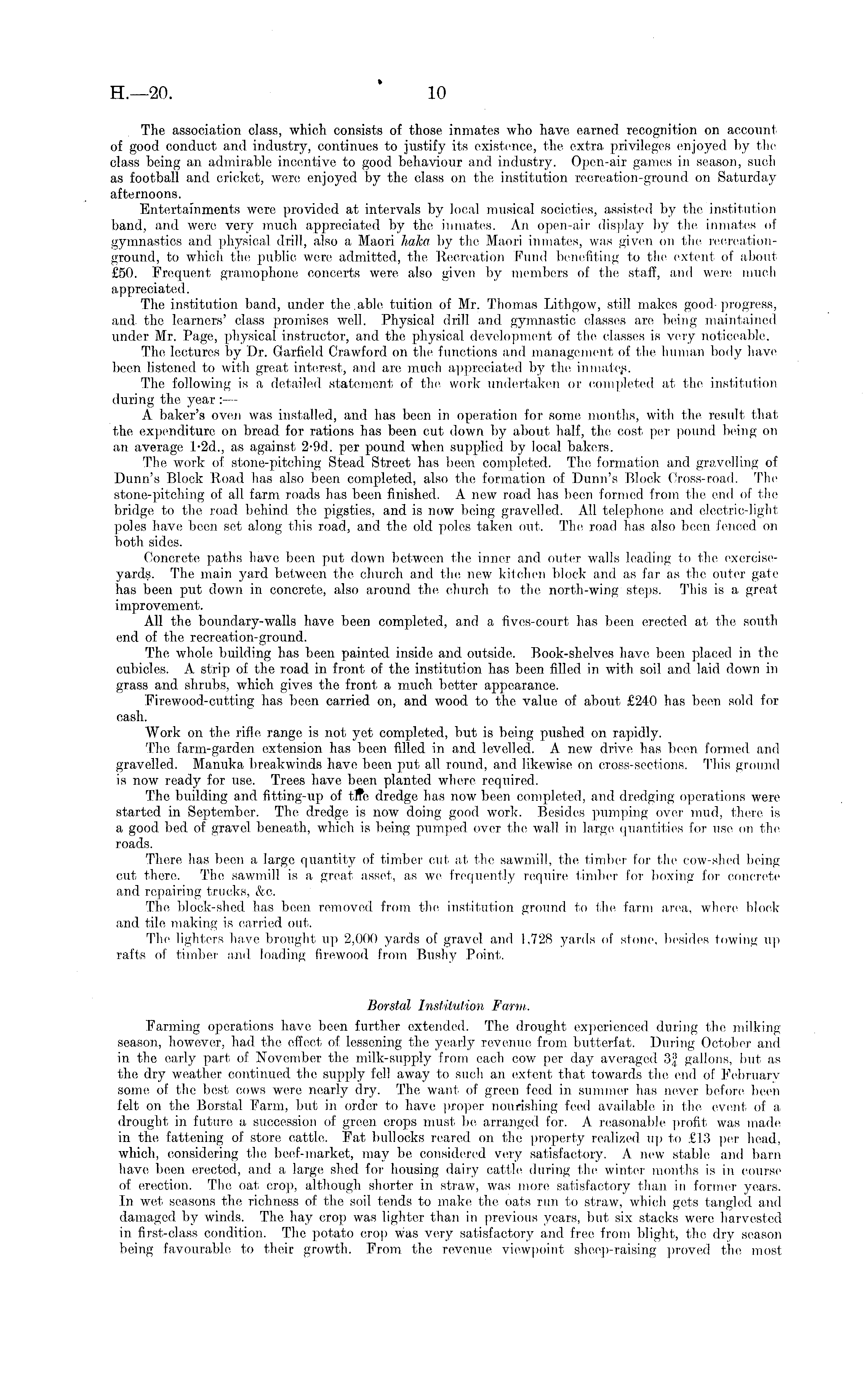 The association class, which consists of those inmates who have earned recognition on account of good conduct and industry, continues to justify its existence, the extra privileges enjoyed by the class being an admirable incentive to good behaviour and industry. Open-air games in season, such as football and cricket, were enjoyed by the class on the institution recreation-ground on Saturday afternoons. Entertainments were provided at intervals by local musical societies, assisted by the institution band, and were very much appreciated by the inmates. An open-air display by the inmates of gymnastics and physical drill, also a Maori halm by the Maori inmates, was given on the recreationground, to which the public were admitted, the Recreation Fund benefiting to the extent of about £50. Frequent gramophone concerts were also given by members of the staff, and were much appreciated. The institution band, under the.able tuition of Mr. Thomas Lithgow, still makes good-progress, and. the learners' class promises well. Physical drill and gymnastic classes are being maintained under Mr. Page, physical instructor, and the physical development of tho classes is very noticeable. The lectures by Dr. Garfield Crawford on the functions and management of the human body have been listened to with great interest, and are much appreciated by the inmate^. The following is a detailed statement of the work undertaken or completed at, the institution during the year : — A baker's oven was installed, and has been in operation for some months, with the result that the expenditure on bread for rations has been cut down by about half, the cost per pound being on an average l-2d., as against 2-9d. per pound when supplied by local bakers. The work of stone-pitching Stead Street has been completed. The formation and gravelling of Dunn's Block Road has also been completed, also the formation of Dunn's Block Cross-road. The stone-pitching of all farm roads has been finished. A new road has been formed from the end of the bridge to the road behind, the pigsties, and is now being gravelled. All telephone and electric-light poles have been set along this road, and the old poles taken out. The road has also been fenced on both sides. Concrete paths have been put down between the inner and outer walls leading to the exerciseyards. The main yard between the church and the new kitchen block and as far as the outer gate has been put down in concrete, also around the church to the north-wing steps. This is a great improvement. All the boundary-walls have been completed, and a fives-court has been erected at the south end of the recreation-ground. The whole building has been painted inside and outside. Book-shelves have been placed in the cubicles. A strip of the road in front of the institution has been filled in with soil and laid down in grass and shrubs, which gives the front a much better appearance. Firewood-cutting has been carried on, and wood to the value of about £240 has been sold, for cash. Work on the rifle range is not yet completed, but is being pushed on rapidly. The farm-garden extension has been filled, in and levelled. A new drive has been formed and gravelled. Manuka breakwinds have been put all round, and likewise on cross-sections. This ground is now ready for use. Trees have been planted where required. The building and fitting-up of trie dredge has now been completed, and dredging operations were started in September. The dredge is now doing good work. Besides pumping over mud, there is a good bed of gravel, beneath, which is being pumped over the wall in large quantities for use on the roads. There has been a large quantity of timber cut at the sawmill, the timber for the cow-shed being cut there. The sawmill is a great asset, as we frequently require timber for boxing for concrete and repairing trucks, &c. The block-shed has been removed from the institution ground to the farm area, whore block and tile making is carried out. The lighters have brought up 2,000 yards of gravel and 1,728 yards of stone, besides towing up rafts of timber and loading firewood from Bushy Point. Borstal Institution Farm. Farming operations have been further extended. The drought experienced during the milking season, however, had the effect of lessening the yearly revenue from butterfat. During October and in the early part of November the milk-supply from each cow per day averaged 3| gallons, but as the dry weather continued the supply fell away to such an extent that towards the end of February some of the best cows were nearly dry. The want of green feed in summer has never before been felt on the Borstal Farm, but in order to have proper nourishing feed available in the, event of a. drought in future a succession of green crops must be arranged for. A reasonable profit was made in the fattening of store cattle. Fat bullocks reared on the property realized up to £13 per head, which, considering the beef-market, may be considered very satisfactory. A new stable and barn have been erected, and a large shed for housing dairy cattle during the winter months is in course of erection. The oat crop, although shorter in straw, was more satisfactory than in former years. In wet seasons the richness of the soil tends to make the oats run to straw, which gets tangled and damaged by winds. The hay crop was lighter than in previous years, but six stacks were harvested in first-class condition. The potato crop was very satisfactory and free from blight, tho dry season being favourable to their growth. From the revenue viewpoint sheep-raising proved the most