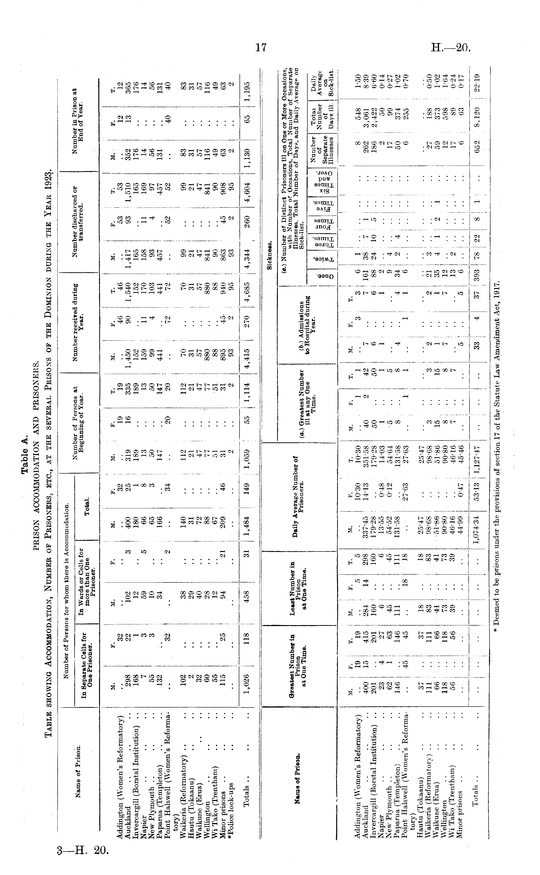 Name of Prison. In Separate Cells for In s t £L C ?J'!, for One Prisoner. "Trifoner 0 " 6 Number of Persons for whom there is Accommodation. Number of Persons at Beginning of Tear. Number received during Tear. Number discharged or transferred. Number in Prison at End of Tear. Total. T. 19 335 189 13 50 147 20 112 21 47 77 51 31 2 M. 1,450 152 159 99 441 70 31 57 880 88 895 93 F. 46 90 11 4 72 45 2 ! T. M. 46 1,540 1,417 152 165 170 158 103 93 441 457 72 70 99 31 21 57 47 880 841 88 90 940 863 95 93 F. T. 53 : 53 93 1,510 165 11 169 4 97 457 52 52 99 21 47 841 90 45 908 2 95 Addington (Women's Reformatory) Auckland lnvercargill (Borstal Institution) .. Napier New Plymouth Paparua (Templeton) Point Halswell (Women's Reformatory) Waikeria (Reformatory) Hautu (Tokaanu) Waikune (Erua) Wellington Wi Tako (Trentham) Minor prisons *Police lock-ups M. 298 168 7 55 132 F. 32 22 1 3 3 32 102 12 59 10 34 F. 3 5 M. 400 180 66 65 166 F. 32 25 1 8 3 34 M. 319 189 13 50 147 F. 19 16 20 M. 352 176 14 56 131 F. 12 13 T. 12 365 176 14 56 131 40 2 ! 40 ... 102 2 32 60 55 115 "25 38 29 40 28 12 94 21 140 31 72 88 67 209 46 112 21 47 77 51 31 2 83 31 57 116 49 63 2 83 31 57 116 49 63 2 •■ •• Totals .. 1,026 118 458 31 1,484 149 1,059 ; 55 1,114 4,415 j 270 4,685 4,344 260 4,604 1,130 65 1,195 I Sickness. Mama of Prison. Greatest Number in Prison at One Time. Least Number in Prison at One Time. Daily Average Number of Prisoners. (a.) Greatest Number ill at any One Time. (6.) Admissions to Hospital during Tear. ( o o (c.) Number of Distinct Prisoners ill on One or More Occasions, with Number of Occasions, Total Number of Separate Illnesses, Total Number of Days, and Daily Average on Sick-list. a, as * u » <» Number Total Dailv 1 ° <" § sS S3 x§-°i of Number Average S jq.S °.S £3 5.3 § * Separate of on | JH j&HrH *B r- H ® Illnesses Days ill. Sick-list. S .13.5 rv..H ccS^r Number Total Daily of Number Average Separate of on Illnesses Days ill. Sick-list. Addington (Women's Reformatory) Auckland .. lnvercargill (Borstal Institution) .. Napier New Plymouth Paparua (Templeton) Point Halswell (Women's Reformatory) Hautu (Tokaanu) Waikeria (Reformator}) Waikune (Erua) Wellington Wi Tako (Trentham) Minor prisons __ I _ M. F. T. 19 19 400 15 415 201 .. 201 23 4 27 62 1 63 146 .. 146 45 j 45 ! M - ! F - _ 5 284 14 160 6 45 111 18 18 83 73 39 T. 5 298 160 6 45 111 18 M. F. T. 1030 10-30 337-45 14-13 351-58 179-28 .. 179-28 13-55 0-48 : 14-03 54-52 0-12 | 54-64 131-58 .. 131-58 27-63 : ; 27-63 - M. F. T. 1 1 40 2 42 50 50 1 .. 1 5 5 8 .. 8 1 1 M. F. T. 3 3 7 .. 7 6 .. 6 1 i .. 1 " r i ! ! i i 6 1 161 38 7 1 .. 88 24 10 5 .. 2 9 4 34 2 4 6 8 : 548 1-50 262 3,061 8-39 186 2,422 6-60 2 50 0-14 17 99 0-27 50 374 1-02 6 255 0-70 4 .. 4 1 1 37 ..I 37 111 .. Ill 66 .. -66--118 .. 118 56 56 18 83 41 73 39 25-47 . . 25-47 98-68 .. 98-68 51-86 .-.- 51-86 90-80 .. 90-80 46-16 .. 46-16 44-99 0-47 45-46 1,074-34 5313 1,127-47 3 .. 3 15 J .. 15 8: : .. 8 7 ■ .. 7 •2 :: -2 1 .. 1 7 --'.. 7 .. .......... 21 3 .. .... 35 4 1 2 1 12 13 2 6 393 78 22 8 1 27 188 0-50 59 373 1-02 12 598 1-64 17 89 024 6 63 0-17 Totals __l 5 '.'. 5 33 4 37 ' 652 ; 8,120 22-19 .. .. •• .. .. .. .. .... .. I i I ... ! I I 1 i i i i i i ' * Deemed to be prisons under the provisions of section 17 of the Statute Law Amendment Act, 1917.