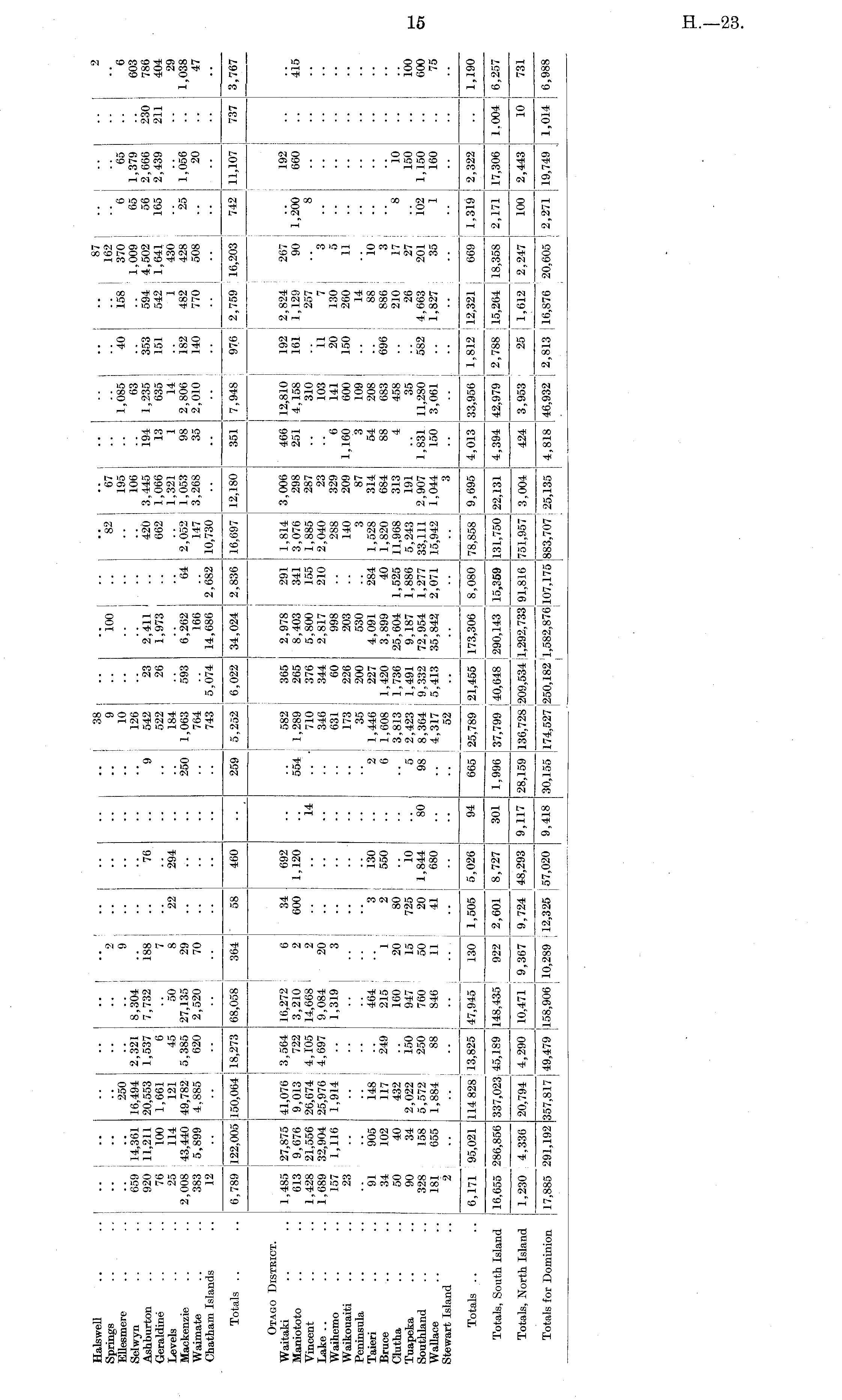 HalsweU Springs EUesmere Selwyn Ashburton Geraldine Levels Mackenzie Waimate Chatham Islands .. .. .. 659 14,361 920 11.211 76 100 25 114 2,008 43,440 383 5,899 12 250 16,494 20,553 1,661 121 49,782 4,885 2,321 1,537 6 45 5,385 620 8,304 7,732 50 27,135 2,520 "•2 9 188 7 8 29 70 22 76 294 38 9 10 126 9 542 522 184 250 1,063 764 743 23 26 100 ■• 2,411 I 1,973 I *82 420 662 67 195 106 3,445 1,066 1,321 1,053 3,268 194 13 98 35 •■ i .. 1,085 63 1.235 635 14 2,806 : 2,010 40 353 151 182 140 . Ol 162 ! 158 ! 370 j 1,009 594 j 4,502 542 1,641 1 430 482 428 ] 770 508 6 65 56 165 25 65 1,379 2,666 2,439 230 211 6 603 786 404 29 1,038 47 593 6,262 166 14,686 64 2,682 2,052 147 10,730 1,056 20 5,074 Totals 6,789 422,005 150,064 ! 18,273 68,058 364 58 460 259 5,252 6,022 34,024 2,836 16,697 12,180 351 7,948 976 2,759 16,203 742 11,107 737 3,767 Otago District. Waitaki Maniototo Vincent Lake Waihemo Waikouaiti Peninsula Taieri Bruce Clutha Tuapeka Southland Wallace Stewart Island 1,485 127,875 613 | 9,676 1,428 21,556 1,689 32,904 157 1,116 23 91 905 34 102 50 40 90 34 328 158 181 655 2 41,076 I 3,564 9,013 722 26,674 4,105 25,976 4,697 1,914 16,272 3,210 14,668 I 9,084 1,319 I 6 2 2 20 3 34 692 600 I 1,120 .. 3 130 2 550 80 725 10 20 1,844 41 680 14 554 J 2 ' 6 582 1,289 710 346 631 173 35 1,446 1,608 3,813 2,423 8,364 4,317 52 365 265 376 344 60 226 200 227 1,420 1,736 1,491 9.332 5,413 2,978 8,403 5,800 2,817 998 203 530 4,091 3,899 25,604 9,187 72,954 35,842 291 341 155 210 284 40 1,525 1,886 1,277 2,071 1,814 3,006 3,076 298 1,885 287 2,040 23 288 329 140 209 3 87 1,528 314 1,820 684 11,968 313 5,243 191 33,111 2,907 15,942 1,044 3 466 251 6 1,160 3 54 88 4 1,831 150 12,810 ! 4,158 310 103 141 600 | 109 i 208 | 683 i 458 35 11,280 3,061 192 2,824 161 1,129 257 11 7 i 20 130 150 260 ; 14 ! 696 886 : 210 26 582 4,663 1,827 267 90 1,200 8 3 5 11 10 17 \ 8 27 j .. 201 102 35 1 192 660 415 148 117 249 432 2,022 150 5,572 250 1,884 88 464 215 160 947 760 I 846 1 20 15 50 11 5 j 98 10 150 1,150 160 100 600 75 80 .. Totals 6,171 95,021 114 828 13,825 47,945 130 1,505 5,026 94 665 25,789 121,455 173,306 8,080 78,858 | 9,695 4,013 33,956 | 1,812 : 12,321 669 1,319 2,322 1,190 Totals, South Island 16,655 286,856 337,023 45,189 148,435 922 2,601 8,727 301 1,996 37,799 j 40,648 290,143 15,359 131,750 | 22,131 4,394 42,979 i 2,788 15,264 18,358 2,171 17,306 1,004 6,257 Totals, North Island 1,230 4,336 20,794 | 4,290 ! 10,471 9,367 9,724 j 48,293 9,117 28,159 136,728 |209,534 1,292,733: 91,816 751,957 i 3,004 424 3,953 25 j 1,612 j 2,247 100 2,443 10 731 Totals for Dominion 17,885 291,192 357,817 49,479 1158,906 j 10,289 12,325 j 57,020 9,418 30,155 174,527 i250,182 1,582,876 ! 107,175 883,707 25,135 4,818 146,932 j 2,813 16,876 20,605 j 2,271 j 19,749 1,014 6,988