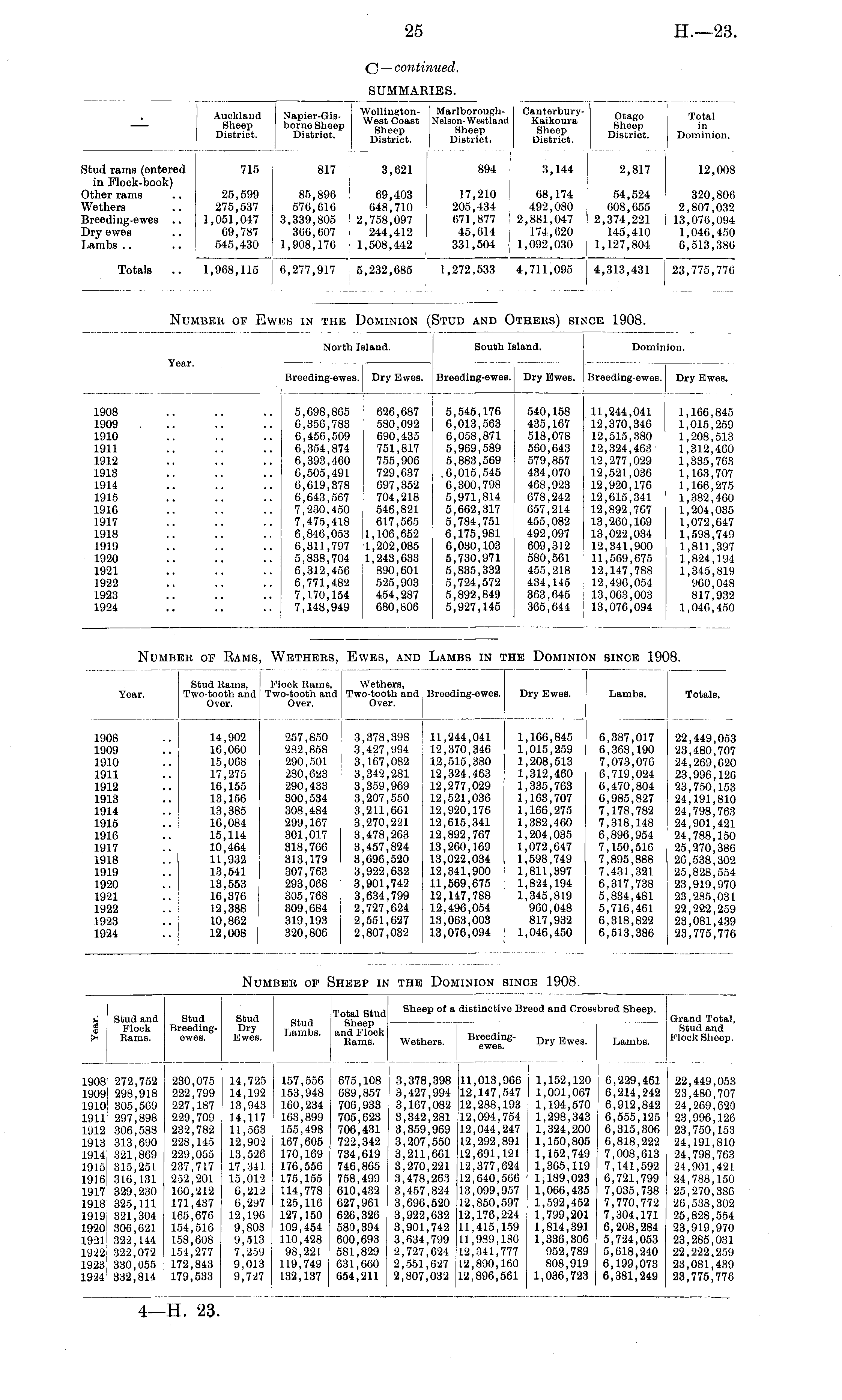 North Island. South Island. Domir don. Year. Breeding-ewes. Dry Ewes. Breeding-ewes. lg-ewes. Dry Ewes. Breeding-ewes. Dry Ewes. 1908 1909 1910 1911 1912 1913 1914 1915 1916 1917 1918 1919 1920 1921 1922 1923 1924 5,698,865 6,356,783 6,456,509 6,354,874 6,393,460 6,505,491 6,619,378 6,643,567 7,230,450 7,475,418 6,846,053 6,311,797 5,838,704 6,312,456 6,771,482 7,170,154 7,148,949 626,687 580,092 690,435 751,817 755,906 729,637 697,352 704,218 546,821 617,565 1,106,652 1,202,085 1,243,633 890,601 525,903 454,287 680,806 5,545,176 6,013,563 6,058,871 5,969,589 5,883,569 6,015,545 6,300,798 5,971,814 5,662,317 5,784,751 6,175,981 6,030,103 5,730.971 5,835,332 5,724,572 5,892,849 5,927,145 540,158 435,167 518,078 560,643 579,857 434,070 468,923 678,242 657,214 455,082 492,097 609,312 580,561 455,218 434,145 303,645 365,644 11,244,041 12,370,346 12,515,380 12,324,463 12,277,029 12,521,036 12,920,176 12,615,341 12,892,767 13,260,169 13,022,034 12,341,900 11,569,675 12,147,788 12,496,054 13,003,003 13,076,094 1,166,845 1,015,259 1,208,513 1,312,460 1,335,763 1,163,707 1,166,275 1,382,460 1,204,035 1,072,047 1,598,749 1,811,397 1,824,194 1,345,819 960,048 817,932 1,046,450