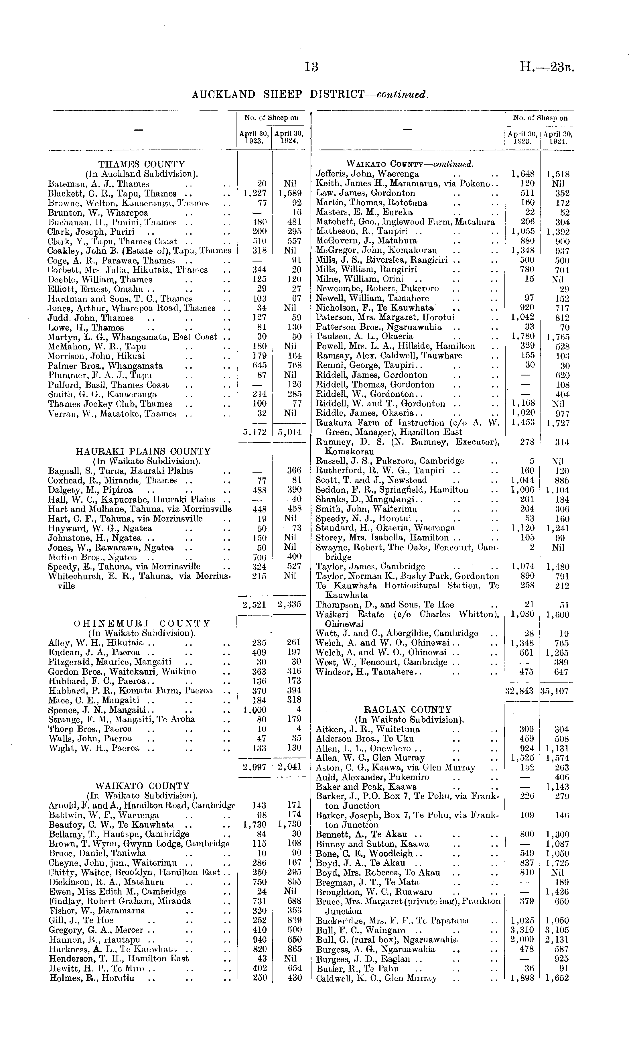 No. of Sheep ou April 80, April 30, 1923. 1924. THAMES COUNTY (In Auckland Subdivision). Bateman, A. J., Thames . . .. 20 Nil Blaokett, G. 11., Tapu, Thames .. .. 1,227 1,58!) Browne, Welton, Kauaeranga, Thames .. 77 92 Brunton, W., Wliarepoa .. .. — 16 Buchanan, 11., Punini, Thames .. .. 480 481 Clark, Joseph, Puriri .. .. .. 200 295 Clark, Y., Tapu, Thames Coast .. .. 510 557 Coakloy, John B. (Estate of), Tapu, Thames 318 Nil Coge, A. R., Parawae, Thames .. .. — 91 Corbett, Mrs. Julia, Hikutaia, Tl'.ames .. 344 20 Deeble, William, Thames .. .. 125 120 Elliott, Ernest, Omahu .. .. .. 29 27 Hardman and Sons, T. C., Thames . . 103 07 Jones, Arthur, Wharcpoa Road, Thames .. 34 Nil Judd, John, Thames .. .. .. 127 59 Lowe, H., Thames .. .. .. 81 130 Martyn, L. G., Whangainata, East Coast .. 30 50 McMahon, W. R., Tapu .. .. 180 Nil Morrison, John, Hikuai .. .. 179 164 Palmer Bros., Whangamata .. .. 645 708 Plummer, F. A. J., Tapu . . .. 87 Nil Pulford, Basil, Thames Coast .. .. — 126 Smith, G. G., Kauaeranga .. .. 244 285 Thames Jockey Club, Thames .. .. 100 77 Verran, W., Matatoke, Thames .. . . 32 Nil 5,172 5,014 HAURAKI PLAINS COUNTY (In Waikato Subdivision). Bagnall, S., Turua, Hauraki Plains .. — 366 Coxhead, R., Miranda, Thames .. .. 77 8t Dalgety, M., Pipiroa .. .. .. 488 390 Hall, W. C., Kapuorahe, Hauraki Plains . . — 40 Hart and Mulhane, Tahuna, via Morrinsvillo 448 458 Hart, C. P., Tahuna, via Morrinsville .. 19 Nil Hayward, W. G., Ngatea .. .. 50 73 Johnstone, H., Ngatea .. .. .. 150 Nil Jones, W., Rawarawa, Ngatea .. .. 50 Nil Motion Bros., Ngatea .. .. . . 700 400 Speedy, E., Tahuna, via Morrinsville .. 324 527 Whitechurch, E. R., Tahuna, via Morrins- 215 Nil ville 2,521 2,335 OHINEMURI COUNTY (In Waikato Subdivision). Alley, W. H., Hikutaia .. .. .. 235 261 Endean, J. A., Paeroa .. .. .. 409 197 Fitzgerald, Maurice, Mangaiti .. .. 30 30 Gordon Bros., Waitekauri, Waikino .. 363 316 Hubbard, F. C., Paeroa.. .. .. 136 173 Hubbard, P. R., Komata Farm, Paeroa .. 370 394 Mace, C. E., Mangaiti .. .. .. 184 318 Spence, J. N., Mangaiti.. .. .. 1,000 4 Strange, F. M., Mangaiti, To Aroha .. 80 179 Thorp Bros., Paeroa .. .. .. 10 4 Walls, John, Paeroa .. .. .. 47 35 Wight, W. H„ Paeroa .. .. .. 133 130 2,997 2,041 WAIKATO COUNTY (In Waikato Subdivision). Arnold, F. and A., Hamilton Road, Cambridge 143 171 Baldwin, W. F„ Waerenga .. .. 98 174 Beaufoy, C. W., Te Kauwhata .. .. 1,730 1,730 Bellamy, T., Haut ipu, Cambridge .. 84 30 Brown, T. Wynn, Gwynn Lodge, Cambridge 115 108 Bruce, Daniel, Taniwha .. .. 10 90 Cheyne, John, jun., Waiterinui .. .. 286 167 Chitty, Walter, Brooklyn, Hamilton East .. 250 295 Dickinson, R. A., Matahuru .. .. 750 855 liwen, Miss Edith M., Cambridge .. 24 Nil Findlay, Robert Graham, Miranda ,. 731 688 Fisher, W., Maramarua .. .. 320 356 Gill, J., Te Hos .. .. .. 252 819 Gregory, G. A., Mercer .. .. .. 410 500 Hannon, R., Hautapu .. .. .. 940 650 Harkness, A. L., Te Kauwhata .. .. 820 865 Henderson, T. H., Hamilton East .. 43 Nil Hewitt, H. 1'., Te Miro .. .. .. 402 654 Holmes, R., Horotiu .. .. .. 250 430
