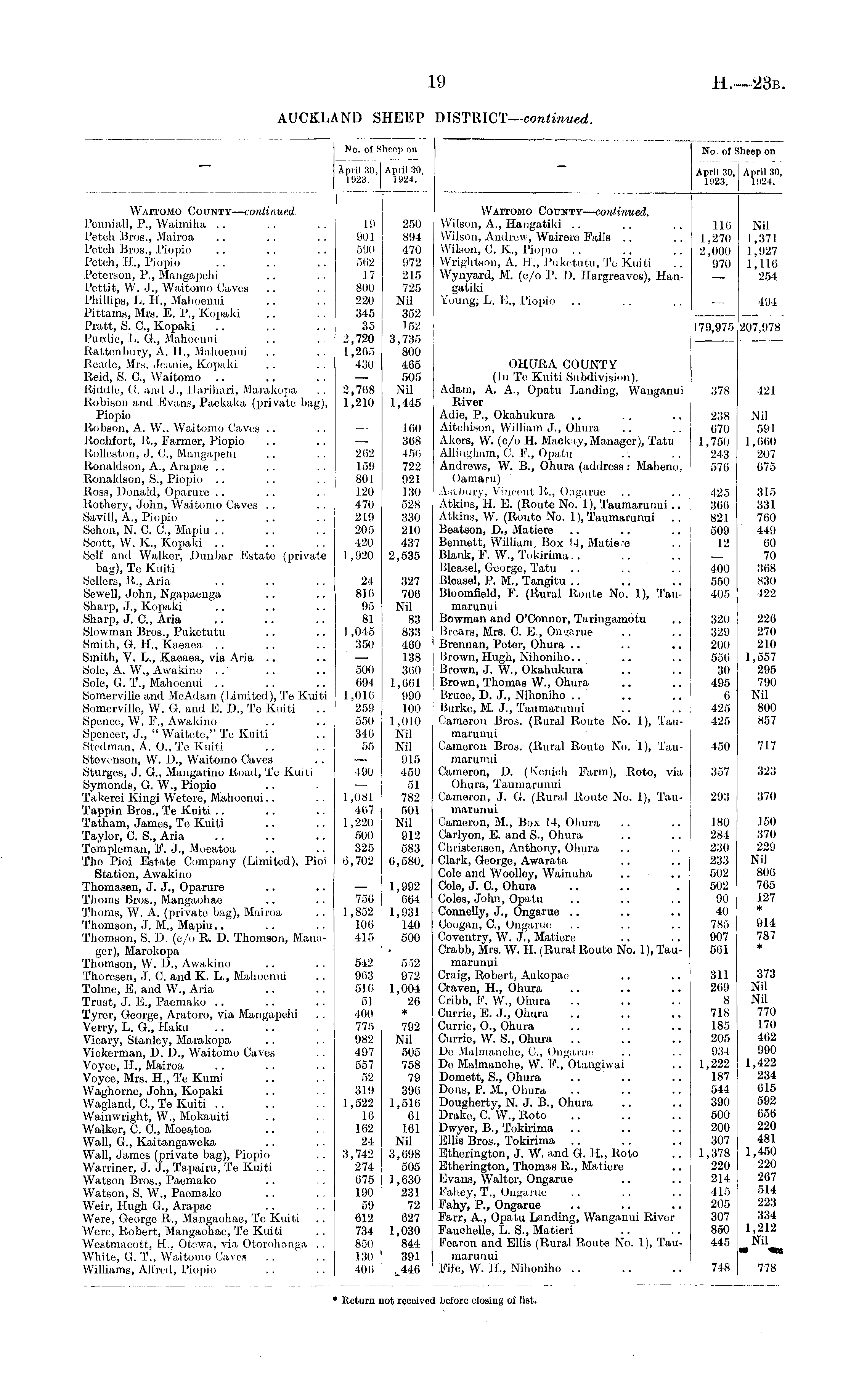 No. of Sheep on No. of Sheep on April 30, April 30, ~ Apr |l 30 Apr |i 30, 1923. 1924. 1923. 1924. Waitomo County—continued. Waitomo County—continued. Penniall, P., Waimiha .. .. .. 19 250 Wilson, A., Hangatiki .. .. .. 116 Nil Peteh Bros., Mairoa .. .. .. 90] 894 Wilson, Andrew, Wairero Falls .. .. 1,270 1,371 Petoh Bros., Piopio .. .. .. 590 470 Wilson, 0. K., Piopio .. .. .. 2,000 1,927 Petch, H., Piopio .. .. .. 502 972 Wriglitson, A. H., Puketutu, Te Kuiti .. 970 1,116 Peterson, P., Mangapehi .. .. 17 215 Wynyard, M. (c/o P. I). Hargreaves), Han- — 254 Pettit, W. J., Waitomo Caves .. .. 800 725 gatiki Phillips, L. H., Mahoenni .. .. 220 Nil Young, L. 15., Piopio .. .. .. — 494 Pittams, Mrs. E. P., Kopaki .. . . 345 352 Pratt, S. C„ Kopaki .. .. .. 35 152 179,975 207,978 Purdie, L. G., Mahoenui .. . 2,720 3,735 Rattenbury, A. H., Mahoenui .. .. 1,265 800 Reade, Mrs. Jeanie, Kopaki .. .. 430 405 OHURA COUNTY Reid, S. C., Waitomo .. .. .. — 505 (In Te Kuiti Subdivision). Riddle, G. and J., llarihari, Marakopa .. 2,708 Nil Adam, A. A., Opatu Landing, Wanganui 378 421 Robison and Evans, Paekaka (private bag), 1,210 1,445 River Piopio Adio, P., Okahukura .. .. .. 1 238 Nil Robson, A. W.. Waitomo Caves .. . . — 160 Aitchison, William J., Ohura .. .. 670 591 Rochfort, R., Farmer, Piopio .. .. — 368 Akers, W. (0/0 H. Maokay, Managor), Tatu 1,750 1,660 Rolleston, J. C., Mangapeni .. . . 262 456 Allingham, C. F., Opatu .. . . 243 207 Ronaldson, A., Arapae .. .. 159 722 Andrews, W. B., Ohura (address: Maheno, 576 675 Ronaldson, S., Piopio .. .. . . 80J 921 Oamaru) Ross, Donald, Oparure .. .. .. 120 .130 Astbury, Vinoent R., Ongarue .. .. 425 315 Rotliery, John, Waitomo Caves .. .. 470 528 Atkins, H. E. (Route No. 1), Taumarunui .. 366 331 Savill, A., Piopio .. .. .. 219 330 Atkins, W. (Routo No. 1), Taumarunui .. 821 760 Sehon, N. C. C., Mapiu .. .. .. 205 210 Beatson, 1)., Matiere .. .. .. 509 449 Scott, W. K., Kopaki .. .. .. 420 437 Bonnett, William, Box 14, Matie/o .. 12 60 Self and Walker, Dunbar Estate (private 1,920 2,535 Blank, F. W., Tokirima.. .. .. — 70 bag), Te Kuiti Bleasel, George, Tatu .. .. .. 400 368 Sellers, R., Aria .. .. .. 24 327 Bleasel, P. M., Tangitu .. .. .. 550 830 Sewell, John, Ngapaenga .. .. 816 706 Bloomfield, F. (Rural Route No. 1), Tau- 405 422 Sharp, J., Kopaki .. .. .. 95 Nil marunui Sharp, J. C., Aria .. .. .. 81 83 Bowman and O'Connor, Taringamotu .. 320 226 Slowman Bros., Puketutu .. 1,045 833 Brears, Mrs. C. E., Ongarue .. .. 329 270 Smith, G. H., Kaeaoa .. .. .. 350 460 Brennan, Peter, Ohura .. .. .. 200 210 Smith, V. L., Kaeaea, via Aria .. .. — 138 Brown, Hugh, Nihoniho.. .. .. 550 1,557 Sole, A. W., Awakino .. .. .. 500 360 Brown, J. W., Okahukura .. .. 30 295 Sole, G. T., Mahoenui .. .. .. 694 1,661 Brown, Thomas W., Ohura .. .. 495 790 Somerville and McAdam (Limited), Te Kuiti 1,016 990 Bruce, D. J., Nihoniho .. .. .. 0 Nil Somerville, W. G. and E. D., Te Kuiti .. 259 100 Burke, M. J., Taumarunui .. .. 425 800 Spence, W. F., Awakino .. .. 550 1,010 Cameron Bros. (Rural Routo No. 1), Tau- 425 857 Spencer, J., " Waitete," Te Kuiti .. 346 Nil marunui Stedman, A. O., Te Kuiti .. .. 55 Nil Cameron Bros. (Rural Route No. 1), Tau- 450 717 Stevenson, W. D., Waitomo Caves .. — 915 marunui Sturges, J. G„ Mangarino Road, Te Kuiti 490 450 Cameron, D. (Konieh Farm), Roto, via 357 323 Symonds, G. W., Piopio .. . — 51 Ohura, Taumarunui Takerei Kingi Wetere, Mahoenui.. .. 1,081 782 Cameron, J. G. (Rural Routo No. 1), Tau- 293 370 Tappin Bros., Te Kuiti .. .. .. 467 501 marunui Tatham, James, To Kuiti .. .. 1,220 Nil Cameron, M., Box 14, Ohura .. .. 180 150 Taylor, C. S., Aria .. .. .. 500 912 Carlyon, E. and S., Ohura .. .. 284 370 Templeman, F. J., Moeatoa .. .. 325 583 Cliristensen, Anthony, Ohura .. .. 230 229 The Pioi Estate Company (Limited), Pioi 6,702 6,580. Clark, George, Awarata .. .. 233 Nil Station, Awakino Cole and Woolley, Wainuha .. .. 502 806 Thomasen, J. J., Oparure .. .. — 1,992 Cole, J. C., Ohura .. .. . 502 765 Thorns Bros., Mangaohae .. .. 756 664 Coles, John, Opatu .. .. .. 90 127 Thoms, W. A. (privato bag), Mairoa .. 1,852 1,931 Connolly, J., Ongaruo .. .. .. 40 Thomson, J. M., Mapiu.. .. .. 106 140 Coogan, 0., Ongarue .. .. .. 785 914 Thomson, S. D. (0/0 R. D. Thomson, Mana- 415 500 Coventry, W. J., Matiere .. .. 907 787 gcr), Marokopa - Crabb, Mrs. W. II. (Rural Routo No. 1), Tau- 561 * Thomson, W. D., Awakino .. .. 542 552 marunui Thoresen, J. C. and K. L., Mahoenui .. 963 972 Craig, Robert, Aukopac .. .. 311 373 Tolme, E. and W„ Aria .. .. 516 1,004 Craven, H., Ohura .. .. .. 269 Nil Trust, J. E„ Paemako .. .. .. 51 26 Cribb, F. W., Ohura .. .. .. 8 Nil Tyrer, George, Aratoro, via Mangapehi .. 400 * Currie, E. J., Ohura .. .. .. 718 770 Verry, L. G„ Haku .. .. 775 792 Currie, O., Ohura .. .. .. 185 170 Vieary, Stanley, Marakopa .. . . 982 Nil Currie, W. S., Ohura .. .. .. 205 462 Viokerman, D. D., Waitomo Caves .. 497 505 De Malmanehe, C., Ongarue .. .. 934 990 Voyce, H., Mairoa .. .. .. 557 758 Do Malmanehe, W. F., Otangiwai .. 1,222 1,422 Voyce, Mrs. H., Te Kumi .. . . 52 79 Domett, S., Ohura .. .. .. 187 234 Wagliorne, John, Kopaki .. . . 319 396 Dons, P. M., Ohura .. .. .. 544 615 Wagland, C„ Te Kuiti .. .. 1,522 1,516 Dougherty, N. J. B., Ohura .. .. 390 592 Wainwright, W., Mokauiti .. . 16 61 Drake, C. W., Roto .. .. .. 500 656 Walker, C. C., Moeatoa .. 162 161 Dwyer, B., Tokirima .. .. .. 200 220 Wall, G., Kaitangaweka .. . . 24 Nil Ellis Bros., Tokirima .. .. .. 307 481 Wall, James (private bag), Piopio . . 3,742 3,698 Ethorington, J. W. and G. H., Roto .. 1,378 1,450 Warriner, J. J., Tapairu, Te Kuiti . . 274 505 Etherington, Thomas R., Matiere .. 220 220 Watson Bros., Paemako .. .. 675 1,630 Evans, Walter, Ongarue .. .. 214 267 Watson, S. W., Paemako .. . . 190 231 Fahey, T., Ongarue .. . . .. 415 514 Weir, Hugh G., Arapae .. . . 59 72 Fahy, P., Ongarue .. .. .. 205 223 Were, George R., Mangaohae