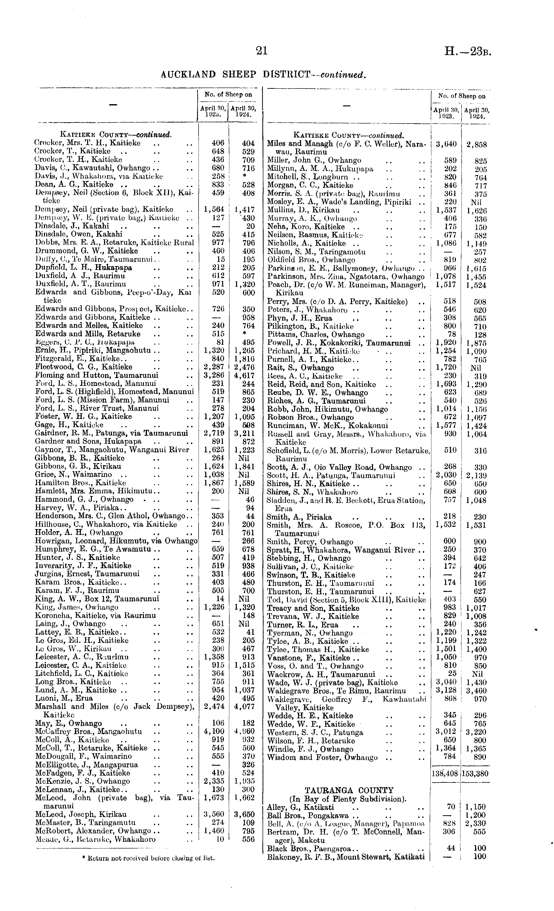 No. of Sheop on April 30, April 30, 1923. 1924. Kaitieke County—continued. Miles and Managh (c/o F. C. Weller), Nara- 3,640 2,858 wau, Raurimu Miller, John G., Owhango .. .. 58!) 825 Millynn, A. M. A., Hukupapa .. .. 202 205 Mitohell, S., Longburn .. .. ... 820 704 Morgan, C. C., Kaitieke .. .. 846 717 Morris. S. A. (private bag), Raurimu .. 361 375 Mosley, E. A., Wade's Landing, Pipiriki .. 220 Nil Mullins, IX, Kirikau .. .. .. 1,537 1,626 Murray, A. K., Owhango .. .. 406 336 Neha, Koro, Kaitieke .. .. .. 175 150 Neilsen, Rasmus, Kaitieks .. .. 677 582 Nicholls, A., Kaitieke .. .. .. 1,086 1,]49 Nilson, S. M., Taringamotu .. .. — 257 Oldfield Bros., Owhango .. .. 819 802 Parkinsjn, E. E., Ballymoney, Owhango .. 966 1,615 Parkinson, Mrs. Zina, Ngatotara, Owhango 1,078 1,455 Peach, Dr. (c/o W. M. Runeiman, Manager), 1,517 1,524 Kirikau Perry, Mrs. (o/o 1). A. Perry, Kaitieke) .. 518 508 Peters, J., Whakahoro .. .. .. 546 020 Phyn, J. H., Erua .. .. .. 308 565 Pilkington, B., Kaitieke .. .. 800 710 Pittams, Charles, Owhango .. .. 78 128 Powell, J. R., Kokakoriki, Taumarunui .. 1,920 1,875 Prichard, H. M., Kaitieke - .. .. 1,254 1,090 Purnell, A. I., Kaitieke.. .. .. 782 705 Rait, S., Owhango .. .. .. 1,720 Nil Rees, A. C., Kaitieke .. .. . . 230 319 Reid, Roid, and Son, Kaitioko .. .. 1,693 1,290 Reube, D. W. E., Owhango .. .. 623 689 Riches, A. G., Tautnarunui .. .. 540 526 Robb, John, Hikimutu, Owhango .. 1,014 1,156 Robson Bros., Owhango .. .. 672 1,097 Runeiman, W. McK., Kokakonui .. 1,577 1,424 Russell and Gray, Messrs., Whakahoro, via 930 1,064 Kaitieke Schofield, L. (o/o M. Morris), Lower Retaruke, 510 316 Raurimu Scott, A. J., Oio Valley Road, Owhango .. 268 330 Scott, H. A., Patunga, Taumarunui .. 2,030 2,139 Shires, H. N., Kaitieke .. .. .. 650 650 Shires, S. N., Whakahoro .. .. 608 600 Sladden, J., and R. E. Beckett, Erua Station, 757 1,048 Erua Smith, A., Piriaka .. .. .. 218 230 Smith, Mrs. A. Roscoe, P.O. Box 113, 1,532 1,531 Taumarunui Smith, Percy, Owhango .. .. 600 900 Spratt, H., Whakahora, Wanganui River .. 250 370 Stebbing, H., Owhango .. .. 394 642 Sullivan, J. C., Kaitieke .. .. 172 406 Swinson, T. B., Kaitieke .. .. — 247 Thurston, E. H., Taumarunui .. .. 174 166 Thurston, E. H., Taumarunui .. .. — 627 Tod, David (Section 5, Block Xill), Kaitieke 403 550 Treacy and Son, Kaitieke .. .. 983 1,017 Trevana, W. J., Kaitieke .. .. 829 1,008 Turner, R. L., Erua .. .. .. 240 356 Tyerman, N., Owhango .. .. 1,220 1,242 Tylee, A. B., Kaitieke .. .. .. 1,199 1,322 Tylee, Thomas H., Kaitieke .. .. 1,501 1,400 Vanstone, P., Kaitieke.. .. .. 1,050 ; 970 Voss, O. and T., Owhango .. .. 810 i 850 Waokrow, A. H., Taumarunui .. .. 25 j Nil Wade, W. J. (private bag), Kaitieke .. 3,040 ! 1,430 Waldegrave Bros,, Te Rimu, Raurimu .. 3,128 ; 3,460 Waldegrave, Geoffrey P., Kawhautahi 868 1 970 Valley, Kaitieke Wedde, H. E., Kaitieke .. ..[345 296 Wedde, W. E., Kaitieke .. .. 645 765 Western, S. J. C., Patunga .. .. 3,012 3,220 Wilson, P. H., Retaruke .. .. 650 800 Windle, E. J., Owhango .. .. 1,364 1,365 Wisdom and Poster, Owhango .. .. 784 890 138,408 153,380 TAURANGA COUNTY (In Bay of Plenty Subdivision). Alley, G., Katikati .. .. .. 70 1,150 Ball Bros., Pongakawa .. .. .. — 1,200 Bell, A. (o/o A. League, Manager), Papamoa 828 2,330 Bertram, Dr. H. (c/o T. McConnell, Man- 306 555 ager), Maketu Black Bros., Paengaroa.. .. .. 44 100 Blakeney, R. E. B., Mount Stewart, Katikati — 100