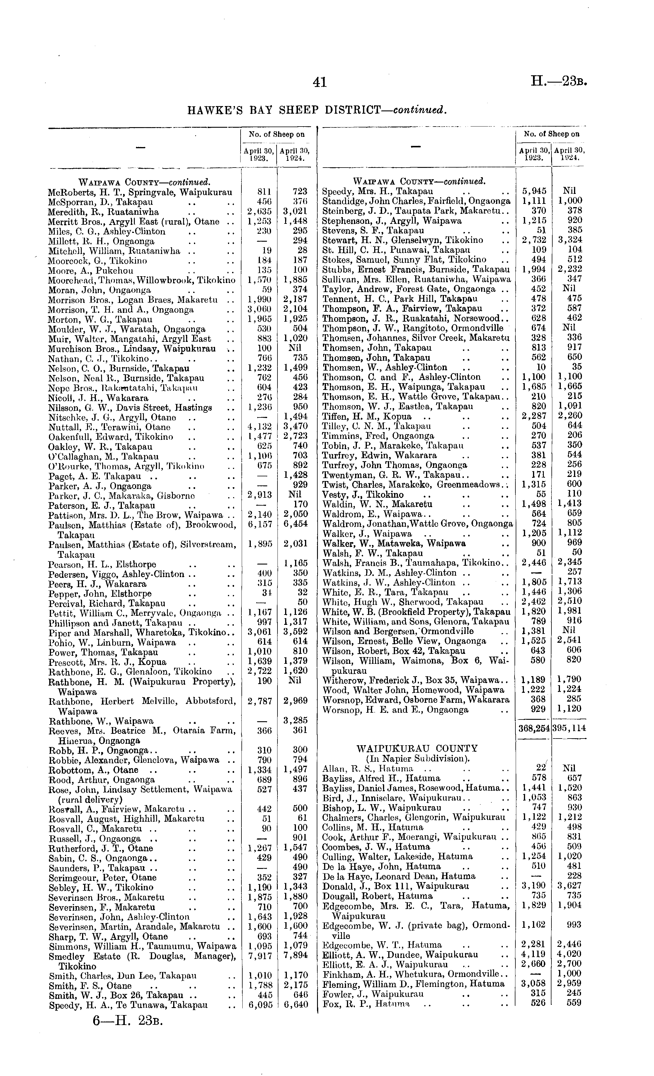 No. of Sheep on April 30, April 30, j 1923. 1924. Waipawa County—continued. MoRoberts, H. T., Springvale, Waipukurau 811 723 McSporran, D., Takapau .. .. 456 376 Meredith, R., Ruataniwha .. .. 2,635 3,021 Merritt Bros., Argyll East (rural), Otane .. 1,253 1,448 Miles, C. G., Ashley-Clinton .. .. 230 295 Millet-t, R. H., Ongaonga .. .. — 294 Mitchell, William, Ruataniwha .. .. 19 28 Moorcock, G., Tikokino .. .. 184 187 Moore, A., Pukehou .. .. 135 100 Moorehead, Thomas, Willowbrook, Tikokino 1,570 1,885 Moran, John, Ongaonga .. .. 59 374 Morrison Bros., Logan Braes, Makaretu .. 1,990 2,187 Morrison, T. H. and A., Ongaonga .. 3,060 2,104 Morton, W. G., Takapau .. .. 1,965 1,925 Moulder, W. J., Waratah, Ongaonga .. 530 504 Muir, Walter, Mangatahi, Argyll East .. 883 1,020 Murchison Bros., Lindsay, Waipukurau v. 100 Nil Nathan, C. J., Tikokino.. .. .. 766 735 Nelson, C. O., Burnside, Takapau .. 1,232 1,499 Nelson, Neal R., Burnside, Takapau .. 762 456 Nepe Bros., Rakantatahi, Takapau .. 604 423 Nicoll, J. H., Wakarara .. .. 276 284 Nilsson, G, W., Davis Street, Hastings .. 1,236 950 Nitschke, J. G., Argyll, Otane .. .. —- 1,494 Nuttall, E., Terawini, Otane .. .. 4,132 3,470 Oakenfull, Edward, Tikokino .. .. 1,477 2,723 Oakley, YV. R., Takapau .. .. 625 740 O'Callaghan, M., Takapau .. .. 1,106 703 O'Rourke, Thomas, Argyll, Tikokino .. 675 892 Paget, A. E. Takapau .. .. .. — 1,428 Parker, A. J., Ongaonga ,. .. — 929 Parker, J. C., Makaraka, Gisborne .. 2,913 Nil Paterson, E. J., Takapau .. .. —• 170 Pattison, Mrs. 1). L., The Brow, Waipawa .. 2,140 2,050 Paulsen, Matthias (Estate of), Brookwood, 6,157 6,454 Takapau Paulsen, Matthias (Estate of), Silverstream, 1,895 2,031 Takapau Pearson, H. L., Elsthorpe .. .. -— 1,165 Pedersen, Viggo, Ashley-Clinton .. .. 400 350 Peers, H. J., Wakarara .. .. 315 335 Pepper, John, Elsthorpe .. .. 31 32 Poreival, Richard, Takapau .. .. — 50 Pett.it, William C., Merry vale, Ongaonga .. 1,167 1,126 Phillipson and Janett, Takapau .. .. 997 1,317 Piper and Marshall, Wharetoka, Tikokino.. 3,061 3,592 Pohio, W., Linburn, Waipawa .. .. 614 614 Powor, Thomas, Takapau .. 1,010 810 Prescott, Mrs. R. J., Kopua .. .. 1,639 1,379 Rathbone, E. G., Glenaloon, Tikokino .. 2,722 1,620 Rathbone, H. M. (Waipukurau Property), 190 Nil Waipawa Rathbone, Herbert Melville, Abbotsford, 2,787 2,969 Waipawa Rathbone, W., Waipawa .. .. — 3,285 Reeves, Mrs. Beatrice M., Otaraia Farm, 366 361 Hinerua, Ongaonga Robb, H. P., Ongaonga.. .. .. 310 300 Robbie, Alexander, Glenelova, Waipawa .. 790 794 Robottom, A., Otane .. .. .. 1,334 1,497 Rood, Arthur, Ongaonga .. .. 689 896 Rose, John, Lindsay Settlement, Waipawa 527 437 (rural delivery) RosTall, A., Eairview, Makaretu .. .. 442 500 Iiosvall, August, Highhill, Makaretu .. 51 61 Rosvall, C., Makaretu .. .. .. 90 100 Russell, J., Ongaonga .. .. .. — 901 Rutherford, J. T., Otane .. .. 1,267 1,547 Sabin, C. S., Ongaonga.. .. .. 429 490 Saunders, P., Takapau .. .. .. — 490 Scrimgeour, Peter, Otane .. .. 352 327 Sebley, H. W., Tikokino .. .. 1,190 1,343 Severinsen Bros., Makaretu .. .. 1,875 1,880 Severinsen, E., Makaretu .. .. 710 700 Severinsen, John, Ashloy-Clinton .. 1,643 1,928 Severinsen, Martin, Arandale, Makarotu .. 1,600 1,600 Sharp, T. W., Argyll, Otane .. .. 693 744 Simmons, William H., Taumumu, Waipawa 1,095 1,079 Smedley Estate (R. Douglas, Manager), 7,917 7,894 Tikokino Smith, Charles, Dun Lee, Takapau .. 1,010 1,170 Smith, E. S., Otane .. .. .. 1,788 2,175 Smith, W. J., Box 26, Takapau .. .. 445 646 Speedy, H. A., Te Tunawa, Takapau .. 6,095 6,640