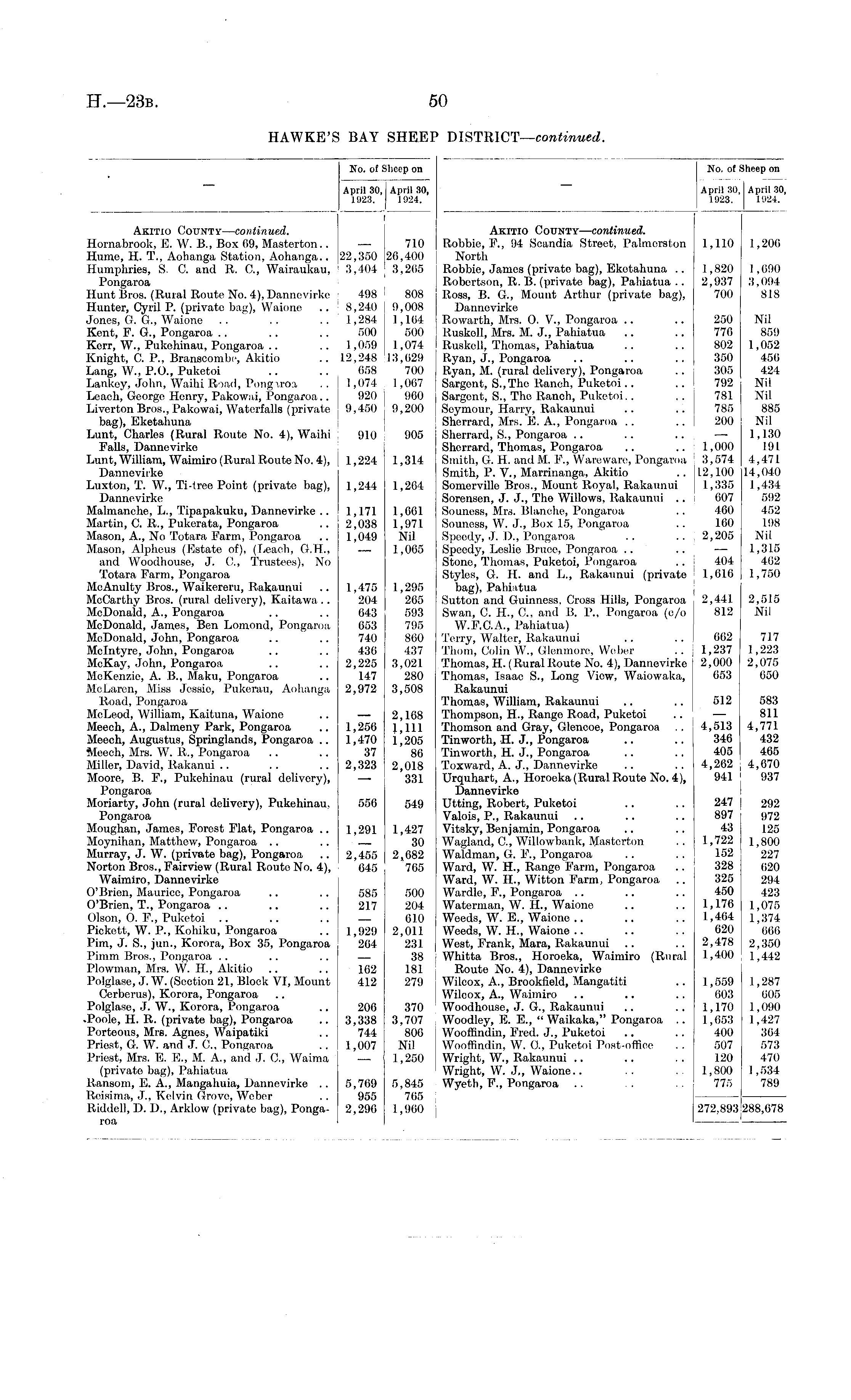 No. of Sheep on April 30, April 30, 1923. 1924. Akitio County—continued. Robbie, F., 94 Scandia Street, Palmerston 1,110 1,200 North Robbie, James (private bag), Ekotahuna .. 1,820 1,690 Robertson, R. B. (private bag), Pabiatua .. 2,937 3,094 Ross, B. 6., Mount Arthur (private bag), 700 818 Dannevirke Rowarth, Mrs. O. V., Pongaroa .. .. 250 Nil Ruskoll, Mrs. M. J., Pahiatua .. .. 770 859 Ruskell, Thomas, Pahiatua .. .. 802 1.052 Ryan, J., Pongaroa .. .. .. 350 450 Ryan, M. (rural delivery), Pongaroa .. 305 424 Sargent, S.,The Ranch, Puketoi.. .. 1 792 Nil Sargent, S., The Ranch, Puketoi.. .. 781 Nil Soymour, Harry, Rakaunui .. .785 885 Sherrard, Mrs. E. A., Pongaroa .. ..I 200 Nil Sherrard, S., Pongaroa .. .. .. —■ 1,130 Sherrard, Thomas, Pongaroa .. .. 1,000 191 Smith, G. H. and M. F., Wareware, Pongaroa 3,574 4,471 Smith, P. V., Marrinanga, Akitio .. 12,100 14,040 Somerville Bros., Mount Royal, Rakaunui ! 1,335 1,434 Sorensen, J. J., The Willows, Rakaunui .. 607 592 Souness, Mrs. Blanche, Pongaroa .. I 460 452 Souness, W. J., Box 15, Pongaroa .. 160 198 Speedy, J. D., Pongaroa .. .. 2,205 Nil Speedy, Leslie Bruce, Pongaroa .. .. — 1,315 Stone, Thomas, Puketoi, Pongaroa .. : 404 402 Styles, G. H. and L., Rakaunui (private 1,616 1,750 bag), Pahiatua Sutton and Guinness, Cross .Hills, Pongaroa 2,441 2,515 Swan, C. H., C., and B. P., Pongaroa (c/o 812 Nil W.F.C.A., Pahiatua) Terry, Walter, Rakaunui .. .. 662 717 Thom, Colin W., Glenmore, Weber .. j 1,237 1,223 Thomas, H. (Rural Route No. 4), Dannevirke 2,000 2,075 Thomas, Isaac S., Long View, Waiowaka, 653 650 Rakaunui Thomas, William, Rakaunui .. .. 512 583 Thompson, H., Range Road, Puketoi .. — 811 Thomson and Gray, Glencoe, Pongaroa . . 4,513 4,771 Tinworth, H. J., Pongaroa .. .. 340 432 Tinworth, H. J., Pongaroa .. .. 405 465 Toxward, A. J., Dannevirke .. .. 4,262 ; 4,670 Urquhart, A., Horoeka(Rural Route No. 4), 941 937 Dannevirke Utting, Robert, Puketoi .. .. 247 292 Valois, P., Rakaunui .. .. .. 897 972 Vitsky, Benjamin, Pongaroa .. .. 43 125 Wagland, C., Willowbank, Masterton .. 1,722 1,800 Waldman, G. P., Pongaroa .. .. 152 227 Ward, W. H., Range Farm, Pongaroa .. 328 (520 Ward, W. H., Witton Farm, Pongaroa .. 325 294 Wardle, F., Pongaroa .. .. .. 450 423 Waterman, W. H., Waione .. .. 1,176 1,075 Weeds, W. E., Waione .. .. .. 1,464 1,374 Weeds, W. H., Waione .. .. .. 620 666 West, Frank, Mara, Rakaunui .. .. 2,478 2,350 Whitta Bros., Horoeka, Waimiro (Rural 1,400 1,442 Route No. 4), Dannevirke Wilcox, A., Brookfield, Mangatiti .. 1,559 1,287 Wilcox, A., Waimiro .. .. .. 603 605 Woodhouse, J. G., Rakaunui .. .. 1,170 1,090 Woodley, E. E., " Waikaka," Pongaroa .. 1,653 1,427 Wooffindin, Fred. J., Puketoi .. .. 400 364 Wooffindin, W. 0., Puketoi Post-office . . 507 573 Wright, W., Rakaunui .. .. . . 120 470 Wright, W. J., Waione.. .. 1,800 1,534 Wyetb, F., Pongaroa .. . 775 789 272,893 288,078