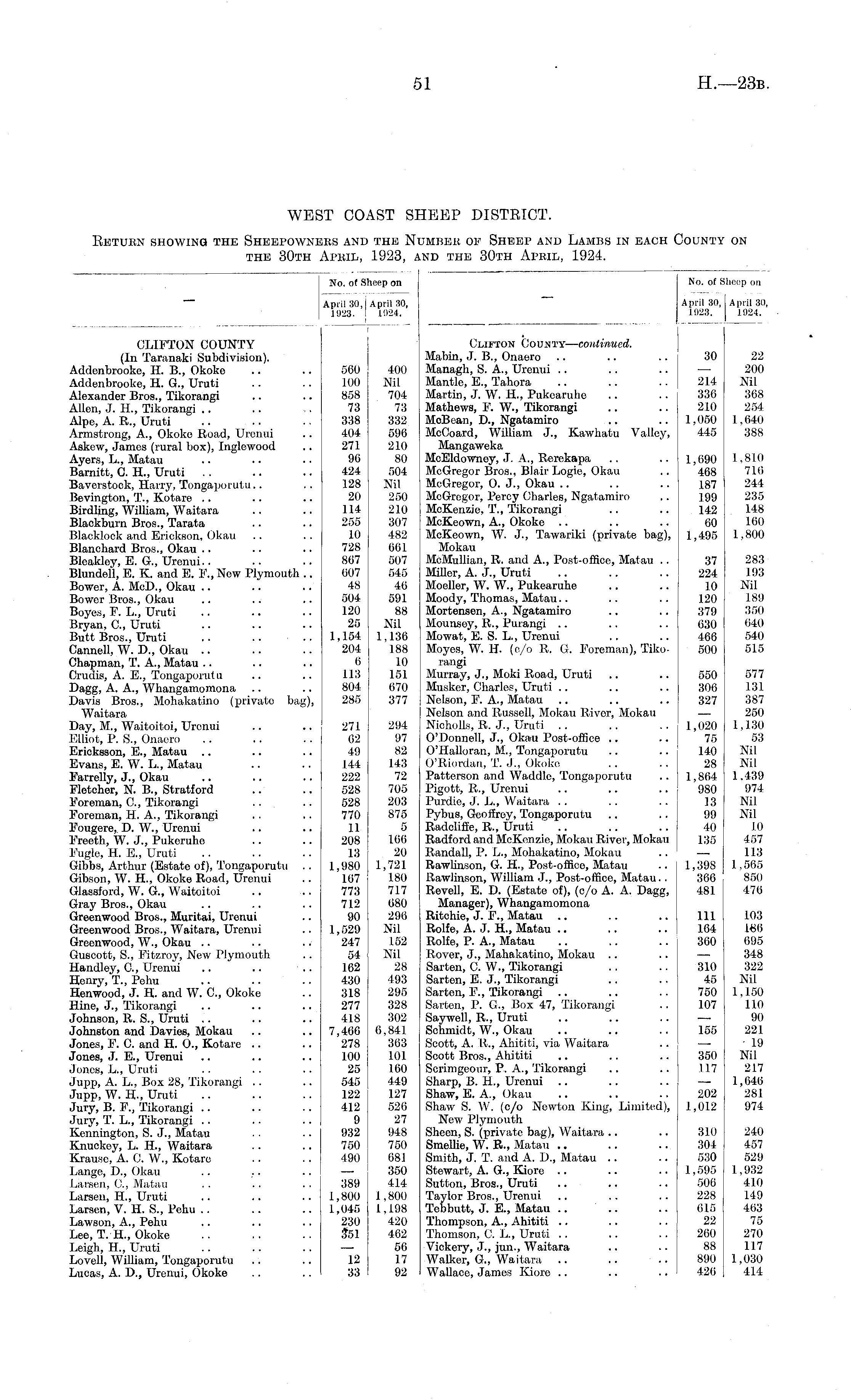 WEST COAST SHEEP DISTRICT. Return showing the Sheepowners and the Number of Sheep and Lambs in each County on the 30th April, 1923, and the 30th April, 1924.