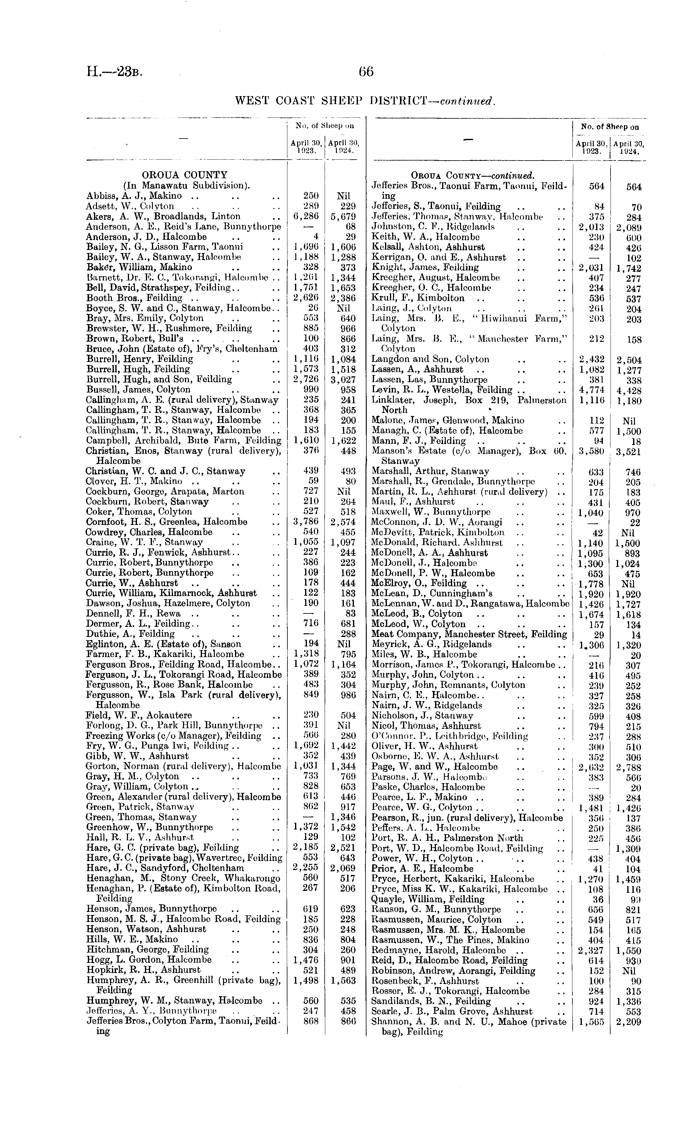No. of Sheep on — April 30, April 30, 1923. 1924. OROUA COUNTY (In Manawatu Subdivision). Abbiss, A. J., Makino .. .. .. 250 Nil Adsett, W., Colyton .. .. .. 289 229 Akers, A. W., Broadlands, Linton .. 6,286 5,679 Anderson, A. E., Reid's Lane, Bunnythorpe — 68 Anderson, J. D., Halcombe .. .. 4 29 Bailey, N. G., Lisson Farm, Taonui .. 1,696 1,606 Bailey, W. A., Stanway, Halcombe .. 1,188 1,288 Baker, William, Makino .. .. 328 373 Barnett, Dr. E. C., Tokorangi, Halcombe .. 1,261 1,344 Bell, David, Strathspey, Feilding.. .. 1,751 1,653 Booth Bros., Feilding .. .. .. 2,626 2,386 Boyce, S. W. and C., Stanway, Halcombe.. 26 Nil Bray, Mrs. Emily, Colyton .. .. 553 640 Brewster, W. H., Rushmere, Feilding .. 885 966 Brown, Robert, Bull's .. .. .. 100 866 Bruce, John (Estate of), Fry's, Cheltenham 403 312 Burrell, Henry, Feilding .. .. 1,116 1,084 Burrell, Hugh, Feilding .. .. 1,573 1,518 Burrell, Hugh, and Son, Feilding .. 2,726 3,027 Bussell, James, Colyton ,. .. 990 958 Callingham, A. E. (rural delivery), Stanway 235 241 Callingham, T. R., Stanway, Halcombe .. 368 365 Callingham, T. R., Stanway, Halcombe .. 194 200 Callingham, T. R., Stanway, Halcombe .. 183 155 Campbell, Archibald, Bute Farm, Feilding 1,610 1,622 Christian, Enos, Stanway (rural delivery), 376 448 Halcombe Christian, W. C. and J. C., Stanway .. 439 493 Clover, H. T., Makino .. .. .. 59 80 Cockburn, George, Arapata, Marton .. 727 Nil Cockburn, Robert, Stanway .. .. 210 264 Coker, Thomas, Colyton .. .. 527 518 Cornfoot, H. S., Greenlea, Halcombe .. 3,786 2,574 Cowdrey, Charles, Halcombe .. .. 540 455 Craine, W. T. F., Stanway .. 1,055 1,097 Currie, R. J., Fenwick, Ashhurst.. .. 227 244 Currie, Robert, Bunnythorpe .. .. 386 223 Currie, Robert, Bunnythorpe .. .. 109 162 Currie, W., Ashhurst .. .. .. 178 444 Currie, William, Kilmarnock, Ashhurst .. 122 183 Dawson, Joshua, Hazelmere, Colyton .. 190 161 Dennell, F. H., Rewa .. .. .. — 83 Dermer, A. L., Feilding.. .. .. 716 681 Duthie, A., Feilding .. .. .. — 288 Eglinton, A. E. (Estate of), Sanson .. 194 Nil Farmer, F. B., Kakariki, Halcombe .. 1,318 795 Ferguson Bros., Feilding Road, Halcombe.. 1,072 1,164 Ferguson, J. L., Tokorangi Road, Halcombe 389 352 Fergusson, R., Rose Bank, Halcombe .. 483 304 Fergusson, W., Isla Park (rural delivery), 849 980 Halcombe Field, W. F., Aokautere .. .. 230 504 Forlong, D. G., Park Hill, Bunnythorpe .. 391 Nil Freezing Works (c/o Manager), Feilding .. 566 280 Fry, W. G., Punga Iwi, Feilding .. .. 1,692 1,442 Gibb, W. W., Ashhurst .. .. 352 439 Gorton, Norman (rural delivery), Halcombe 1,031 1,344 Gray, H. M., Colyton .. .. .. 733 769 Gray, William, Colyton. „ .. .. 828 653 Green, Alexander (rural delivery), Halcombe 613 446 Green, Patrick, Stanway .. .. 862 917 Green, Thomas, Stanway .. .. — 1,346 Greenhow, W., Bunnythorpe .. .. 1,372 1,542 Hall, R. L. V., Ashhurst .. .. 129 102 Hare, G. C. (private bag), Feilding .. 2,185 2,521 Hare, G.C. (private bag), Wavertree, Feilding 553 643 Hare, J. C., Sandyford, Cheltenham .. 2,255 2,069 Henaghan, M., Stony Creek, Whakarongo 560 517 Henaghan, P. (Estate of), Kimbolton Road, 267 206 Feilding Henson, James, Bunnythorpe .. .. 619 623 Henson, M. S. J., Halcombe Road, Feilding 185 228 Henson, Watson, Ashhurst .. .. 250 248 Hills, W. E., Makino .. .. .. 836 804 Hitchman, George, Feilding .. .. 304 260 Hogg, L. Gordon, Halcombe .. .. 1,476 901 Hopkirk, R. H., Ashhurst .. .. 521 489 Humphrey, A. R., Greenhill (private bag), 1,498 1,563 Feilding Humphrey, W. M., Stanway, Halcombe .. 560 535 Jefferies, A. Y., Bunnythorpe .. . . 247 458 Jefferies Bros., Colyton Farm, Taonui, Feild- 868 866 ing