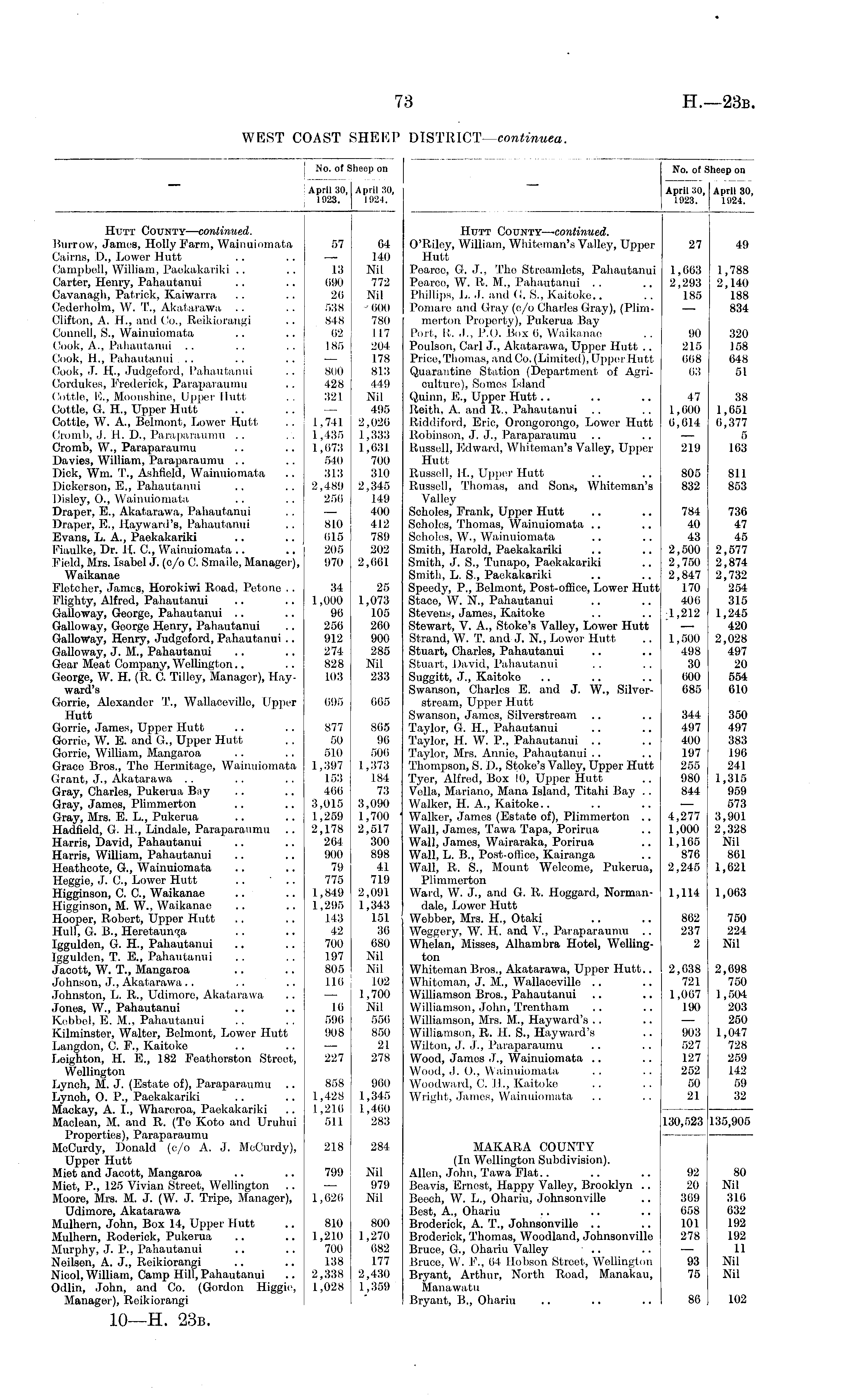 | No. of Sheep on April 30,1 April 30, j 1923. 1924. Hutt County—continued. Burrow, James, Holly Farm, Wainuiomata 57 04 Cairns, I)., Lower Hutt .. .. — 140 Campbell, William, Paekakariki .. .. 13 Nil Carter, Henry, Paluiutanui .. .. (190 772 Cavanagh, Patrick, Kaiwarra .. .. 20 Nil Cederholm, W. T., Akatarawa .. .. 538 000 Clifton, A. H., and Co., Reikiorangi .. 848 780 Oonnell, S., Wainuiomata .. .. 02 117 Cook, A., Pahautanui .. .. .. 185 204 Cook, H., Pahautanui .. .. .. — 178 Cook, J. H, Judgeford, Pahautanui .. 800 813 Cordulces, Frederick, Paraparaumu .. 428 449 Cottle, E., Moonshine, Upper Ilutt . . 321 Nil Cottle, G. H., IJpper Hutt .. .. — 495 Cottle, W. A., Belmont, Lower Hutt .. 1,741 2,020 Cromb, J. H. D., Paraparaumu .. 1,435 1,333 Cromb, W., Paraparaumu .. .. 1,073 1,631 Davies, William, Paraparaumu .. .. 540 700 Hick, Wm. T., Ashfield, Wainuiomata .. 313 310 Diokerson, E., Pahautanui .. .. 2,489 2,345 Disley, O., Wainuiomata .. .. 250 149 Draper, E., Akatarawa, Pahautanui .. — 400 Draper, E., Hayward's, Pahautanui .. 810 412 Evans, L. A., Paekakariki .. .. 015 789 Fiaulke, Dr. H. C., Wainuiomata .. .. 205 202 Field, Mrs. Isabel J. (o/o C. Smaile, Manager), 970 2,001 Waikanac Fletcher, James, Horokiwi Road, Petone .. 34 25 Flighty, Alfred, Pahautanui .. .. 1,000 1,073 Galloway, George, Pahautanui .. .. 90 105 Galloway, George Henry, Pahautanui .. 250 200 Galloway, Henry, Judgeford, Pahautanui .. 912 900 Galloway, J. M., Pahautanui .. .. 274 285 Gear Meat Company, Wellington.. .. 828 Nil George, W. H. (R. C. Tilley, Manager), Hay- 103 233 ward's Gorrie, Alexander T., Wallaceville, Upper 095 005 Hutt Gorrie, James, Upper Hutfc .. .. 877 805 Gorrie, W. E. and G., Upper Hutt .. 50 90 Gorrie, William, Mangaroa .. .. 510 506 Grace Bros., The Hermitage, Wainuiomata 1,397 1,373 Grant, J., Akatarawa .. .. .. 153 184 Gray, Charles, Pukerua Bay .. .. 466 73 Gray, James, Plimmerton .. .. 3,015 3,090 Gray, Mrs. E. L., Pukerua .. .. 1,259 1,700 Hadfield, G. H., Lindale, Paraparaumu .. 2,178 2,517 Harris, David, Pahautanui .. .. 264 300 Harris, William, Pahautanui .. .. 900 898 Heathcote, G., Wainuiomata .. .. 79 41 Heggie, J. C., Lower Hutt .. .. 775 719 Higginson, C. C., Waikanae .. .. 1,849 2,091 Higginson, M. W., Waikanae .. .. 1,295 1,343 Hooper, Robert, Upper Hutt .. .. 143 151 Hull, G. B., .. .. 42 36 Iggulden, G. H., Pahautanui .. .. 700 680 Igguldcn, T. E., Pahautanui .. .. 197 Nil Jacott, W. T., Mangaroa .. .. 805 Nil Johnson, J., Akatarawa.. .. .. 110 j 102 Johnston, L. R., Udimore, Akatarawa .. — 1,700 Jones, W., Pahautanui .. .. 10 Nil Kebbel, E. M., Pahautanui .. .. 596 556 Kilminster, Walter, Belmont, Lower Hutt 908 850 Langdon, C. F., Kaitoke .. .. — 21 Leighton, H. E., 182 Featherston Street, 227 278 Wellington Lynch, M. J. (Estate of), Paraparaumu .. 858 960 Lynoh, O. P., Paekakariki .. .. 1,428 1,345 Mackay, A. I., Whareroa, Paekakariki .. 1,216 1,460 Maclean, M. and R. (Te Koto and Uruhui 511 283 Properties), Paraparaumu McCurdy, Donald (o/o A. J. MeCurdy), 218 284 Upper Hutt Miet and Jacott, Mangaroa .. .. 799 Nil Miet, P., 125 Vivian Street, Wellington .. — 979 Moore, Mrs. M. J. (W. J. Tripe, Manager), 1,620 Nil Udimore, Akatarawa Mulhern, John, Box 14, Upper Hutt .. 810 800 Mulhern, Roderick, Pukerua .. .. 1,210 1,270 Murphy, J. P., Pahautanui .. .. 700 082 Neilsen, A. J., Reikiorangi .. .. 138 177 Nicol, William, Camp Hill, Pahautanui .. 2,338 2,430 Odlin, John, and Co. (Gordon Higgic, 1,028 1,359 Manager), Reikiorangi