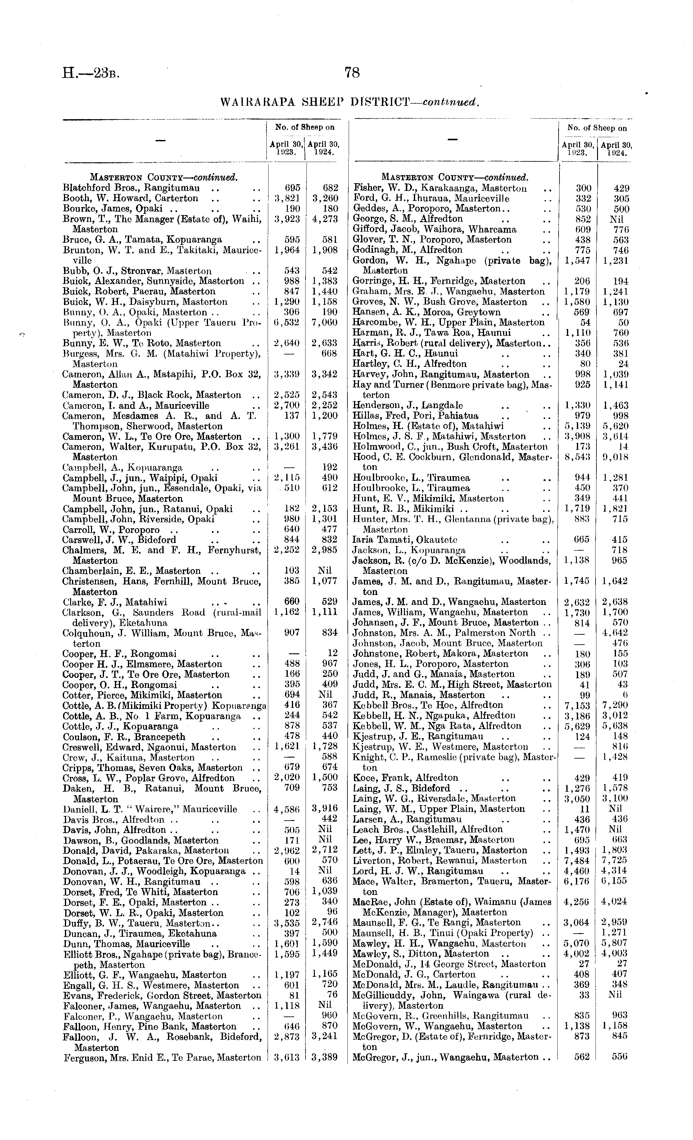 No. of Sheep on April 30, April 30, 1923. 1924. Masterton County—continued. Fisher, W. I)., Karakaanga, Masterton .. 300 429 Ford, G. H., Ihuraua, Mauriceville .. 332 305 Geddes, A., Poroporo, Masterton.. .. 530 500 George, S. M., Alfredton .. .. 852 Nil Gilford, Jacob, Waihora, Whareama .. 009 776 Glover, T. N., Poroporo, Mastorton .. 438 563 Godinagh, M., Alfredton .. .. 775 746 Gordon, W. H., Ngahape (private bag), 1,547 1,231 Masterton Gorringe, H. H., Fernridge, Masterton .. 206 194 Graham, Mrs. E .T., Wangaehu, Masterton 1,179 1,241 Groves, N. W., Bush Grove, Masterton .. 1,580 1,130 Hansen, A. K., Moroa, Grey town .. 569 697 Harcombe, W. H., Upper Plain, Masterton 54 50 Harman, R. J., Tawa Roa, Haunui .. 1,110 760 Harris, Robert (rural delivery), Masterton.. 356 536 Hart, G. H. C., Haunui .. .. 340 381 Hartley, C. H., Alfredton .. .. 80 24 Harvey, John, Rangitumau, Masterton .. 998 1,039 Hay and Turner (Bemnore private bag), Mas- 925 1,141 terton Henderson, J., Langdale .. .. 1,330 1,463 Hillas, Fred, Pori, Pahiatua .. .. 979 998 Holmes, H. (Estate of), Matahiwi .. 5,139 5,620 Holmes, J. S. P., Matahiwi, Masterton .. 3,908 3,61.4 Holmwood, C., jun., Bush Croft, Masterton 173 14 Hood, C. E. Cockburn, Glondonald, Master- 8,543 9,018 ton Houlbrooke, L., Tiraumea .. .. 944 1,281 Houlbrooke, L., Tiraumea .. .. 450 370 Hunt, E. V., Mikimiki. Masterton .. 349 441 Hunt, R. B., Mikimiki .. .. .. 1,719 1,821 Hunter, Mrs. T. H., Glentanna (private bag), 883 715 Masterton Iaria Tamati, Okautete .. .. 665 415 Jackson, L., Kopuaranga .. .. — 718 Jackson, R. (c/o D. MeKenzie), Woodlands, 1,138 965 Masterton James, J. M. and D., Rangitumau, Master- 1,745 1,642 ton James, J. M. and D., Wangaehu, Mastorton 2,632 2,638 James, William, Wangaehu, Masterton .. 1,730 1,700 Johansen, J. F., Mount Bruce, Masterton . . 814 570 Johnston, Mrs. A. M., Palmerston North .. — 4,642 Johnston, Jacob, Mount Bruce, Masterton — 476 Johnstone, Robert, Makora, Masterton .. 180 155 Jones, H. L., Poroporo, Masterton .. 306 103 Judd, J. and G., Manaia, Masterton .. 189 507 Judd, Mrs. E. C. M., High Street, Masterton 41 43 Judd, R., Manaia, Masterton .. .. 99 6 Kebbell Bros., Te Hoe, Alfredton .. 7,153 7,290 Kebbell, H. N., Ngapuka, Alfredton .. 3,186 3,012 Kebbell, W. M., Nga Rata, Alfredton .. 5,629 5,638 Kjestrup, J. E., Rangitumau .. .. 124 148 Kjestrup, W. E., Westmere, Masterton . . — 816 Knight, C. P., Rameslie (private bag), Master- — 1,428 ton Koce, Fra-nk, Alfredton .. .. 429 419 Laing, J. S., Bideford .. .. .. 1,276 1,578 Laing, W. G., Riversdale, Masterton .. 3,050 3,100 Laing, W. M., Upper Plain, Masterton .. 11 Nil Larson, A., Rangitumau .. .. 436 436 Leach Bros , CaBtlehill, Alfredton .. 1,470 Nil Lee, Harry W., Braemar, Masterton .. 695 663 Lett, J. P., Elmley, Taueru, Masterton .. 1,493 1,803 Liverton, Robert, Rewanui, Masterton .. 7,484 7,725 Lord, H. J. W., Rangitumau .. .. 4,460 4,314 Mace, Walter, Bramerton, Taueru, Master- 6,176 6,155 ton MacRae, John (Estate of), Waimanu (James 4,256 4,024 McKenzie, Manager), Masterton Maunsell, F. G., Te Rangi, Masterton .. 3,064 2,959 Maunsell, H. B., Tinui (Opaki Property) .. — 1,271 Mawley, H. H., Wangaehu, Masterton .. 5,070 5,807 Mawley, S., Ditton, Masterton .. .. 4,002 4,003 McDonald, J., 14 George Street, Masterton 27 27 McDonald, J. G., Carterton .. .. 408 407 McDonald, Mrs. M., Laudle, Rangitumau .. 369 348 McGilliouddy, John, Waingawa (rural de- 33 Nil livery), Masterton McGovem, R., Greenhills, Rangitumau . . 835 963 MeGovern, W., Wangaehu, Masterton .. 1,138 1,158 McGregor, D. (Estate of), Fernridge, Master- 873 845 ton McGregor, J., jun., Wangaehu, Masterton .. 562 556