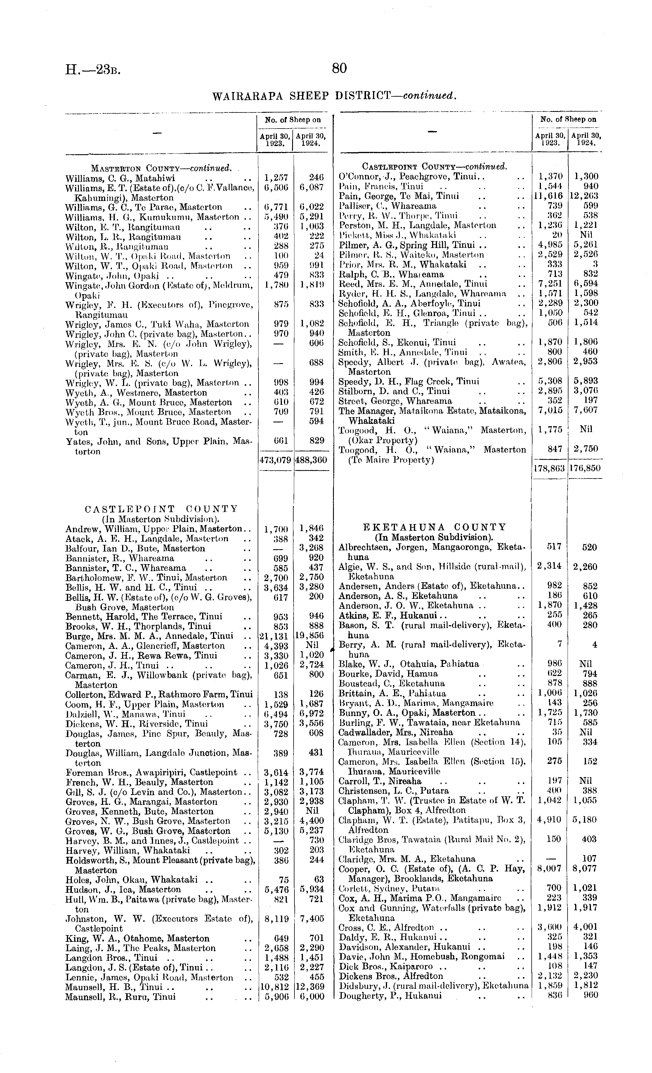 No. of Sheep on April 30, April 30, 1923. 1924. Castlepoint County—continued. O'Connor, J., Peachgrove, Tinui.. .. 1,370 1,300 Pain, Francis, Tinui .. .. .. 1,544 940 Pain, George, Te Mai, Tinui .. .. 11,016 12,203 Palliser, C., Whareama .. .. 739 599 L'erry, R. W., Thorpe, Tinui .. .. 302 538 Perston, M. H., Langdale, Masterton .. 1,230 1,221 Pickett, Miss J., Whakataki .. .. 20 Nil Pilmer, A. G., Spring Hill, Tinui .. .. 4,985 5,201 Pilmer, K. S., Waiteko, Masterton .. 2,529 2,520 Prior, Mrs. R. M., Whakataki .. . . 333 3 Ralph, C.'B., Whaieama .. .. 713 832 Reed, Mrs. E. M., Annedale, Tinui .. 7,251 0,594 Ryder, H. H- S., Langdale, Whareama .. 1,571 1,598 Schofiold, A. A., Aberfoyle, Tinui .. 2,289 2,300 Schofield, E. H., Glcnroa, Tinui .. .. 1,050 542 Schofiold, E. H., Triangle (private bag), 500 1,514 Masterton Schofield, S., Ekenui, Tinui .. .. 1,870 1,800 Smith, E. H., Annedale, Tinui .. .. 800 400 Speedy, Albert J. (private bag), Awatea, 2,806 2,953 Masterton Speedy, D. H., Flag Creek, Tinui .. 5,308 5,893 Stilborn, D. and C., Tinui .. .. 2,895 3,070 Street, George, Whareama .. .. 352 197 The Manager, Mataikona Estate, Mataikona, 7,015 7,607 Whakataki Toogood, H. O., " Waiana," Masterton, 1,775 Nil (Okar Property) - Toogood, H. O., "Waiana," Masterton 847 2,750 (Te Maire Property) 178,803 170,850 EKETAHUNA COUNTY (In Masterton Subdivision). Albrechtsen, Jorgen, Mangaoronga, Eketa- 517 520 huna Algie, W. S., and Son, Hillside (rural-mail), 2,314 2,260 Eketahuna Andersen, Anders (Estate of), Eketahuna.. 982 852 Anderson, A. S., Eketahuna .. .. 180 010 Anderson, ,1. 0. W., Eketahuna .. .. 1,870 1,428 Atkins, E. F., Hukanui.. .. .. 255 265 Bason, S. T. (rural mail-delivery), Eketa- 400 280 huna Berry, A. M. (rural mail-delivery), Eketa- 7 4 huna Blake, W. J., Otahuia, Pahiatua .. 986 Nil Bourke, David, Hamua .. .. 022 794 Boustead, C., Eketahuna .. .. 878 888 Brittain, A. E., Pahiatua .. .. 1,006 1,026 Bryant, A. D., Marima, Mangamaire .. 143 250 Bunny, O. A., Opaki, Masterton .. .. 1,725 1,730 Burling, F. W., Tawataia, near Eketahuna 715 585 Cadwallader, Mrs., Nireaha .. .. 35 Nil Cameron, Mrs. Isabella Ellen (Section 14), 105 334 Ihuraua, Mauriceville Cameron, Mrs. Isabella Ellen (Section 15), 275 152 Ihuraua, Mauriceville Carroll, T., Nireaha .. .. .. 197 Nil Christensen, L. C., Putara .. .. 400 388 Clapham, T. W. (Trustee in Estate of W- T. 1,042 1,055 Clapham), Box 4, Alfredton Clapham, W. T. (Estate), Patitapu, Box 3, 4,910 5,180 Alfredton Claridge Bros, Tawataia (Rural Mail No. 2), 150 403 Eketahuna Claridge, Mrs. M. A., Eketahuna .. — 107 Cooper, O. C. (Estate of), (A. C. P. Hay, 8,007 8,077 Managor), Brooklands, Eketahuna Corlett, Sydney, Putara .. .. 700 1,021 Cox, A. H., Marima P.O., Mangamaire .. 223 339 Cox and Gunning, Waterfalls (private bag), 1,912 1,917 Eketahuna Cross, C. E., Alfredton .. .. .. 3,600 4,001 Daldy, E. R., Hukanui .. .. .. 325 321 Davidson, Alexander, Hukanui .. .. 198 140 Davie, John M., Homebush, Rongomai .. 1,448 1,353 Dick Bros., Kaiparoro .. .. .. 108 147 Dickens Bros., Alfredton .. .. 2,132 2,230 Didsbury, J. (rural mail-delivery), Eketahuna 1,859 1,812 Dougherty, P., Hukanui .. .. 830 900