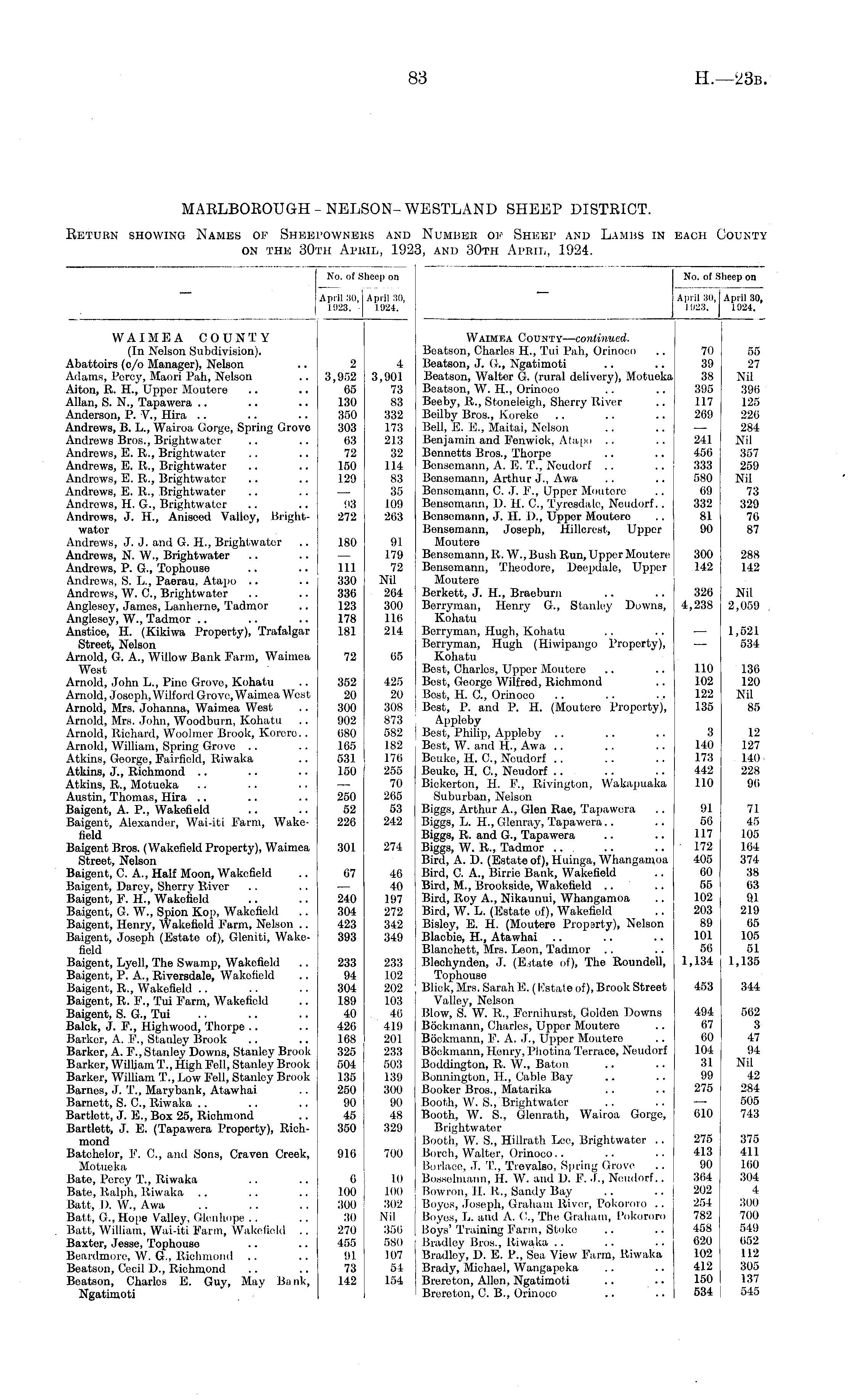 MARLBOROUGH-NELSON-WESTLAND SHEEP DISTRICT. Return showing Names of Sheepowners and Number of Sheep and Lambs in each County on the 30th April, 1923, and 30th April, 1924.