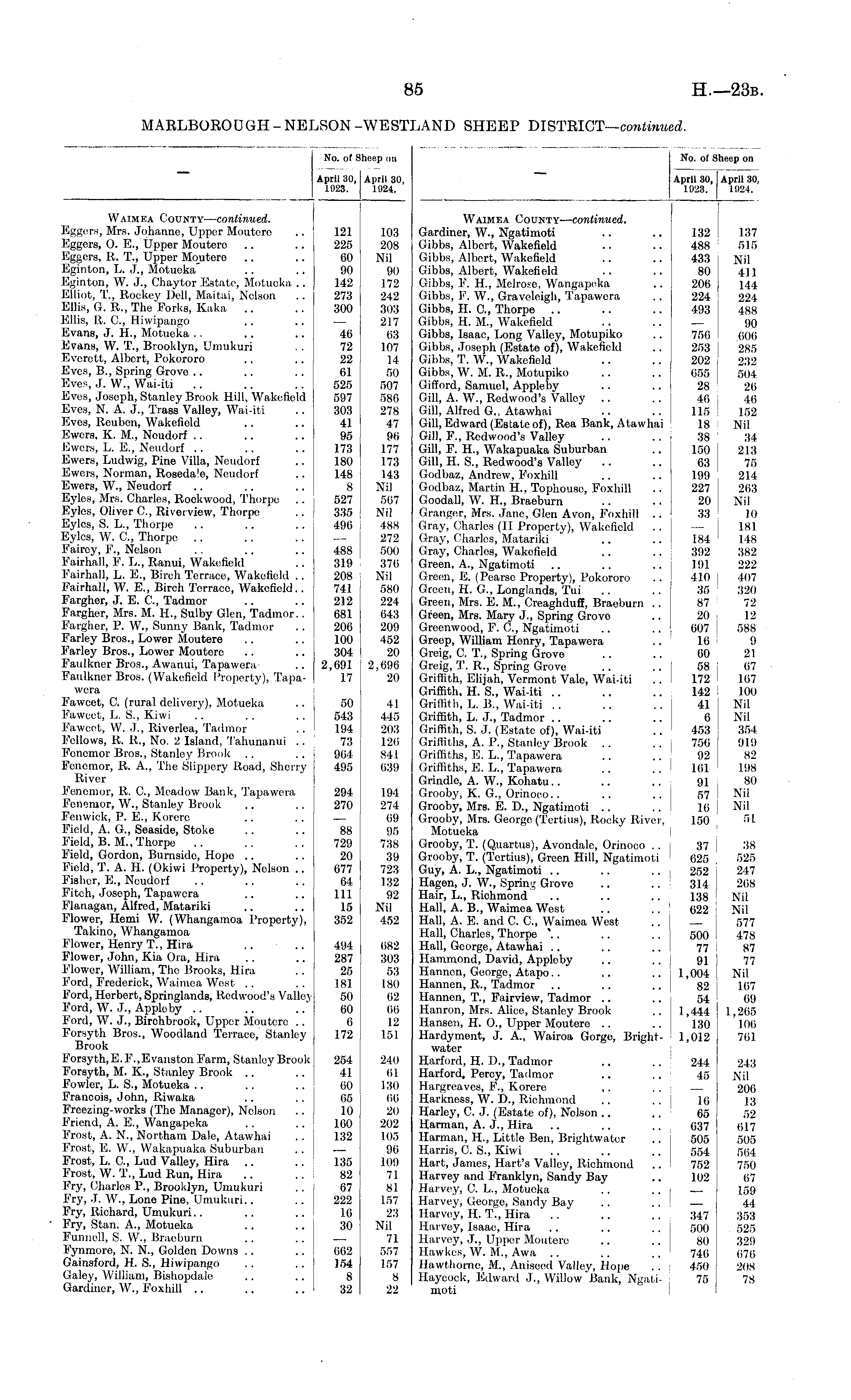 No. of Sheep on April 30, April 30, 1923. 1924. Waimea County—continued. Gardiner, W., Ngatimoti .. .. 132 137 Gibbs, Albert, Wakefield .. .. 488 515 Gibbs, Albert, Wakefield .. .. 433 Nil Gibbs, Albert, Wakefield .. .. 80 411 Gibbs, F. H., Melrose, Wangapeka .. 206 144 Gibbs, F. W., Graveleigh, Tapawera .. 224 224 Gibbs, H. C., Thorpe .. .. .. 493 488 Gibbs, H. M., Wakefield .. .. — 90 Gibbs, Isaac, Long Valley, Motupiko .. 756 606 Gibbs, Joseph (Estate of), Wakefield .. 253 285 Gibbs, T. W., Wakefield .. .. 202 232 Gibbs, W. M. R., Motupiko .. .. 655 504 Gifford, Samuel, Appleby .. .. 28 26 Gill, A. W., Redwood's Valley .. .. 46 46 Gill, Alfred G., Atawhai .. .. 115 152 Gill, Edward (Estate of), Rea Bank, Atawhai 18 Nil Gill, F., Redwood's Valley .. .. 38 34 Gill, F. H., Wakapuaka Suburban .. 150 213 Gill, H. S., Redwood's Valley .. .. 63 75 Godbaz, Andrew, Foxhill .. .. 199 214 Godbaz, Martin H., Tophouso, Foxhill .. 227 263 Goodall, W. H., Braeburn .. .. 20 Nil Granger, Mrs. Jane, Glen Avon, Foxhill .. 33 10 Gray, Charles (II Property), Wakefield .. •— 181 Gray, Charles, Matariki .. .. 184 148 Gray, Charles, Wakefield .. .. 392 382 Green, A., Ngatimoti .. .. .. 191 222 Green, E. (Pearse Property), Pokororo .. 410 407 Green, H. G., Longlands, Tui .. .. 35 320 Green, Mrs. E. M., Creaghduff, Braeburn .. 87 72 Green, Mrs. Mary J., Spring Grove .. 20 12 Greenwood, F. C., Ngatimoti .. .. 607 588 Greep, William Henry, Tapawera .. 16 9 Greig, C. T., Spring Grove .. .. 60 21 Greig, T. R., Spring Grove .. .. 58 67 Griffith, Elijah, Vermont Vale, Wai-iti .. 172 167 Grifiith, H. S., Wai-iti .. .. .. 142 100 Griffith, L. B., Wai-iti .. .. .. 41 Nil Griffith, L. J., Tadmor .. .. .. ; 6 Nil Griffith, S. J. (Estate of), Wai-iti .. 453 354 Griffitlis, A. P., Stanley Brook .. .. j 756 919 Griffiths, E. L., Tapawera .. .. 92 82 Griffiths, E. L., Tapawera .. .. 161 198 Grindle, A. W., Kohatu.. .. .. 91 80 Grooby, K. G., Orinoco.. .. .. 57 Nil Grooby, Mrs. E. D., Ngatimoti .. .. 16 Nil Grooby, Mrs. George (Tertius), Rocky River, 150 51 Motueka Grooby, T. (Quartus), Avondale, Orinoco .. 37 38 Grooby, T. (Tertius), Green Hill, Ngatimoti 625 525 Guy, A. L., Ngatimoti .. .. .. 252 247 Hagen, J. W., Spring Grove .. .. 314 268 Hair, L., Richmond .. .. .. 138 Nil Hall, A. B., Waimea West .. .. 622 Nil Hall, A. E. and C. C., Waimea West .. — 577 Hall, Charles, Thorpe \ . .. . . 500 478 Hall, George, Atawhai .. .. .. 77 87 Hammond, David, Appleby .. .. 91 77 Hannen, George, Atapo.. .. .. 1,004 Nil Hannen, R., Tadmor .. .. .. 82 167 Hannen, T., Fairview, Tadmor .. .. 54 69 Hanron, Mrs. Alice, Stanley Brook .. 1,444 1,265 Hansen, H. O., Upper Moutere .. .. 130 106 Hardyment, J. A., Wairoa Gorge, Bright- 1,012 761 water Harford, H. D., Tadmor .. .. 244 243 Harford, Percy, Tadmor .. .. 45 Nil Hargreaves, F., Korere .. — 206 Harkness, W. D., Richmond .. .. 16 13 Harley, C. J. (Estate of), Nelson .. .. 65 52 Harman, A. J., Hira .. .. .. 637 617 Harman, H, Little Ben, Brightwater .. 505 505 Harris, C. S., Kiwi .. .. .. 554 5(34 Hart, James, Hart's Valley, Richmond .. 752 750 Harvey and Franklyn, Sandy Bay .. 102 67 Harvey, C. L., Motueka .. .. — 159 Harvey, George, Sandy Bay .. .. — 44 Harvey, H. T., Hira .. .. .. 347 353 Harvey, Isaac, Hira .. .. .. 500 525 Harvey, J., Upper Moutere .. .. 80 329 Hawkes, W. M., Awa .. .. .. 746 676 Hawthorne, M., Aniseed Valley, Hope .. 450 208 Haycock, Edward J., Willow Bank, Ngati- 75 78 moti
