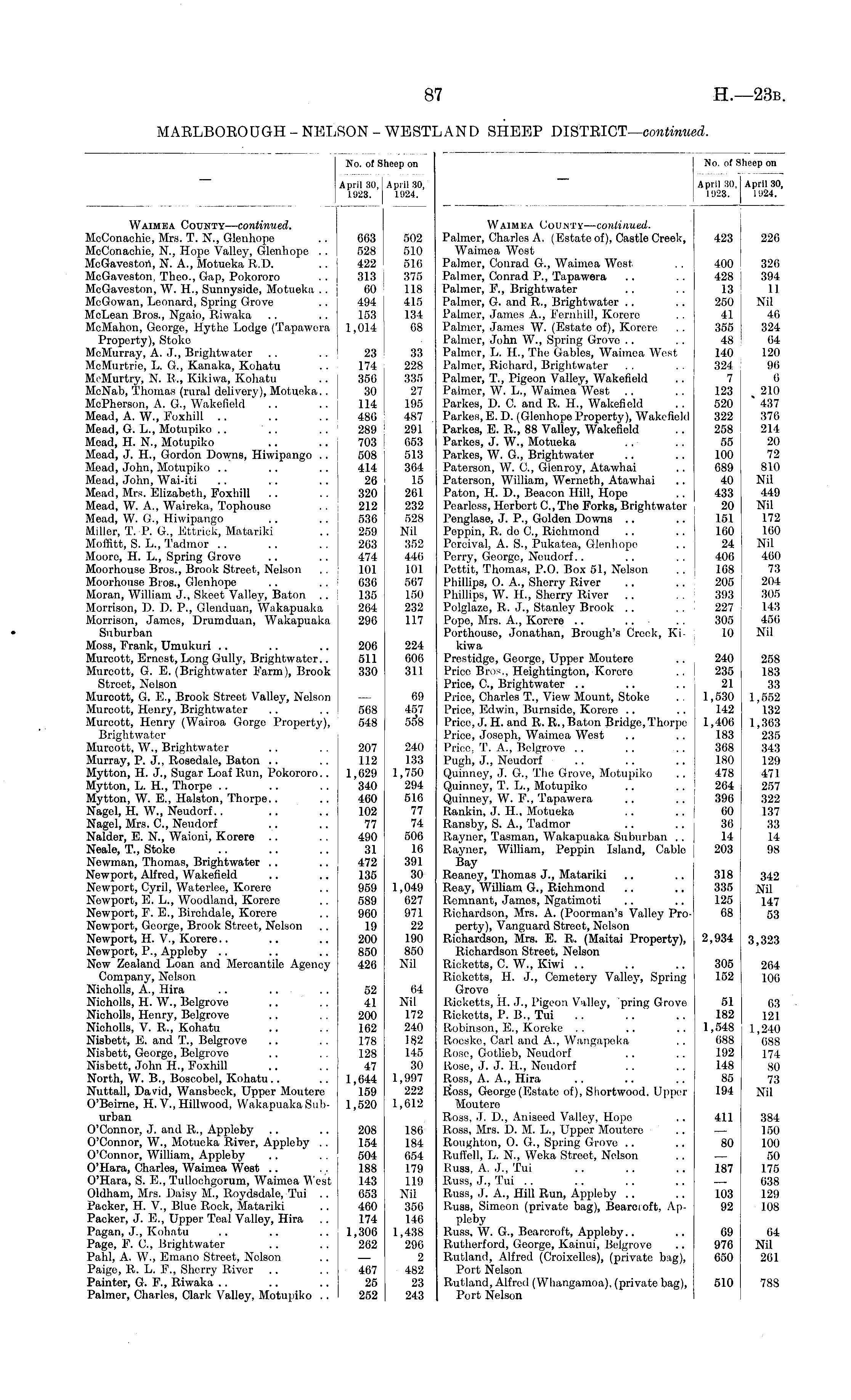 No. of Sheep on April 30,1 April 30, 1923. 1924. Waimea County—continued. McConachie, Mrs. T. N., Glenhope .. 003 502 McConachie, N., Hope Valley, Glenhope . . 528 510 McGavestori, N. A., Motueka R.D. .. 422 510 McGaveston, Theo., Gap, Pokororo .. 313 375 McGaveston, W. H., Sunnyside, Motueka .. 00 118 McGowan, Leonard, Spring Grove .. 494 415 McLean Bros., Ngaio, Riwaka .. .. 153 134 McMahon, George, Hythe Lodge (Tapawera 1,014 08 Property), Stoke McMurray, A. J., Brightwater .. .. 23 33 MeMurtrie, L. G., Kanaka, Kohatu .. 174 228 MeMurtry, N. R., Kikiwa, Kohatu .. 350 335 MeNab, Thomas (rural delivery), Motueka.. 30 27 McPherson, A. G., Wakefield .. .. 114 195 Mead, A. W., Foxhill .. .. .. 480 487 Mead, G. L., Motupiko .. .. . . 289 291 Mead, H. N., Motupiko .. .. 703 653 Mead, J. H., Gordon Downs, Hiwipango .. 508 513 Mead, John, Motupiko .. .. .. 414 364 Mead, John, Wai-iti .. ... .. 20 15 Mead, Mrs. Elizabeth, Foxhill .. .. 320 261 Mead, W. A., Waireka, Tophouse . . 212 232 Mead, W. G., Hiwipango .. .. 536 528 Miller, T. P. G., Ettrick, Matariki .. 259 Nil Moffitt, S. L., Tadmor . . .. . . 263 352 Mooro, H. L., Spring Grove .. .. 474 440 Moorhouse Bros., Brook Street, Nelson . . 101 101 Moorhonse Bros., Glenhope .. .. 030 507 Moran, William J., Skeet Valley, Baton .. 135 150 Morrison, 1). D. P., Glenduan, Wakapuaka 204 232 Morrison, James, Drumduan, Wakapuaka 290 117 Suburban Moss, Erank, Umukuri .. .. .. 200 224 Murcott, Ernest, Long Gully, Brightwater.. 511 006 Mureott, G. E. (Brightwater Earm), Brook 330 311 Street, Nelson Murcott, G. E., Brook Street Valley, Nelson — 09 Murcott, Henry, Brightwater .. .. 5G8 457 Murcott, Henry (Wairoa Gorge Property), 548 5f>8 Brightwater Murcott, W., Brightwater .. . . 207 240 Murray, P. J., Rosedale, Baton .. .. 112 133 Mytton, H. J., Sugar Loaf Run, Pokororo.. 1,029 1,750 Mytton, L. H., Thorpe .. .. .. 340 294 Mytton, W. E., Halston, Thorpe.. .. 460 510 Nagel, H. W., Neudorf.. .. . . 102 77 Nagel, Mrs. C., Neudorf .. .. 77 74 Nalder, E. N., Waioni, Korere .. . . 490 500 Neale, T., Stoke .. .. .. 31 10 Nowman, Thomas, Brightwater .. .. 472 391 Newport, Alfred, Wakefield .. .. 135 30 Newport, Cyril, Waterlee, Korere .. 959 1,049 Newport, E. L., Woodland, Korere .. 589 627 Newport, E. E., Birchdale, Korere .. 900 971 Newport, George, Brook Street, Nelson .. 19 22 Newport, H. V., Korere.. .. .. 200 190 Newport, P., Appleby .. .. .. 850 850 Now Zealand Loan and Mercantile Agency 420 Nil Company, Nelson Nicholls, A., Hira .. .. . . 52 04 Nicholls, H. W., Belgrove .. .. 41 Nil Nicholls, Henry, Belgrove .. 200 172 Nicholls, V. R., Kohatu .. .. 102 240 Nisbett, E. and T., Belgrove .. . . 178 182 Nisbett, George, Belgrove .. . . 128 145 Nisbett, John H., Eoxhill .. . . 47 30 North, W. B., Boscobel, Kohatu.. .. 1,044 1,997 Nuttall, David, Wansbeck, Upper Moutere 159 222 O'Beirne, H. V., Ilillwood, Wakapuaka Sub- 1,520 1,612 urban O'Connor, J. and R., Appleby .. .. 208 186 O'Connor, W., Motueka River, Appleby . . 154 184 O'Connor, William, Appleby .. . . 504 054 O'Hara, Charles, Waimea West .. 188 179 O'Hara, S. E., Tulloehgorum, Waimea West 143 119 Oldham, Mis. Daisy M., Roydsdale, Tui .. 053 Nil Packer, II. V., Blue Rock, Matariki .. 460 356 Packer, J. E., Upper Teal Valley, Hira .. 174 146 Pagan, J., Kohatu .. .. .. 1,306 1,438 Page, E. C., Brightwater .. . . 262 290 Pahl, A. W., Emano Street, Nolson .. — 2 Paige, R. L. F., Sherry River .. . . 467 482 Painter, G. F., Riwaka .. .. .. 25 23 Palmer, Charles, Clark Valley, Motupiko .. 252 243