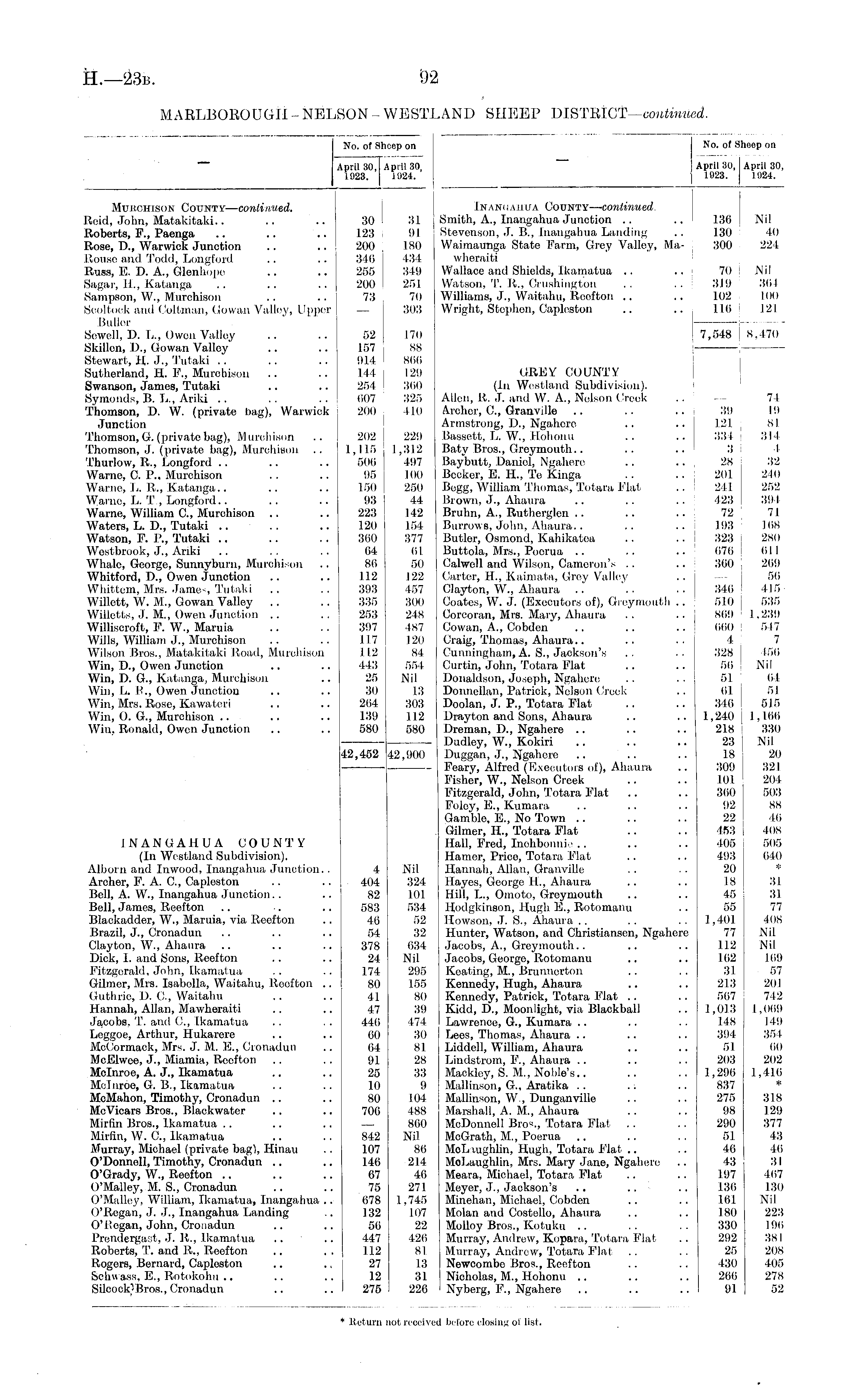 No. of Sheep on April 30,1 April 30, 1023. 1924. Inangahua County—continued. | Smith, A., Inangahua Junction .. .. 1 136 Nil Stevenson, J. B., Inangahua Landing .. 130 40 Waimaunga State Farm, Grey Valley, Ma- 300 224 wheraiti Wallace and Shields, Ikamatua .. .. 70 Nil Watson, T. R., Crushington .. .. 319 364 Williams, J., Waitahu, Roofton .. .. 102 100 Wright, Stephen, Caploston .. .. 116 121 I 7,548 8,470 GREY COUNTY (In Westlancl Subdivision). Allen, R. J. and W. A., Nelson Creek .. — 74 Archer, C., Granville .. .. .. 3D 19 Armstrong, D., Ngahcro .. .. 121 ! 81 Bassett, L. W., Hohonu .. .. 334 314 Batv Bros., Greymouth.. .. .. 3 1 4 Baybutt, Daniel, Ngaliere .. .. 28 32 Becker, E. H., Te Kinga .. .. 201 240 Begg, William Thomas, Totara Flat .. 241 252 Brown, J., Ahaura .. .. .. 423 394 Bruhn, A., Rutherglen .. .. .. 72 71 Burrows, John, Aliaura.. .. .. 193 168 Butler, Osmond, Kahikatoa .. .. 323 \ 280 Buttola, Mrs., Poerua .. .. .. 076 (ill Calwell and Wilson, Cameron's .. .. 360 269 Carter, H., Kaimata, Grey Valley .. j — I 56 Clayton, W., Ahaura .. .. .. 346 | 415 Coates, W. J. (Executors of), Greymouth .. | 510 I 535 Corcoran, Mrs. Mary, Ahaura .. .. 869 ' 1,239 Cowan, A., Cobden .. .. .. 660 j 547 Craig, Thomas, Ahaura.. .. . . 4 7 Cunningham, A. S., Jackson's .. .. 328 | 450 Curtin, John, Totara Flat .. .. 56 Nil Donaldson, Joseph, Ngahcre .. . . 51 64 Donnellan, Patrick, Nelson Creek .. 01 i 51 Doolan, J. P., Totara Flat .. .. 346 ' 515 Drayton and Sons, Aliaura .. .. 1,240 \ 1,166 Dreman, D., Ngahere .. .. .. 218 ' 330 Dudley, W., Kokiri .. .. .. 23 Nil Duggan, J., Ngahere .. .. .. 18 20 Fcary, Alfred (Executors of), Ahaura .. 309 321 Fisher, W„ Nelson Creek .. .. 101 204 Fitzgerald, John, Totara Flat .. .. 360 503 Foley, E., Kumara .. .. .. 92 88 Gamble, E., No Town .. .. .. 22 46 Gilmer, H., Totara Flat .. .. 453 408 Hall, Fred, Inohbonnie .. .. .. 405 505 Hamer, Price, Totara Flat .. .. 493 640 Hannah, Allan, Granville . . . . 20 * Hayes, George H., Ahaura .. .. 18 31 Hill, L., Omoto, Greymouth .. .. 45 31 Hodglcinson, Hugh E., Rotomanu .. 55 77 Howson, J. S., Ahaura .. .. . . 1,401 408 Hunter, Watson, and Christiansen, Ngahere 77 Nil Jacobs, A., Greymouth.. .. .. 112 Nil Jacobs, George, Rotomanu .. .. 162 169 Keating, M., Brunnerton .. . . 31 57 Kennedy, Hugh, Ahaura .. .. 213 201 Kennedy, Patrick, Totara Flat .. .. 567 742 Kidd, D., Moonlight, via Blackball .. 1,013 1,069 Lawrence, G., Kumara .. .. .. 148 149 Lees, Thomas, Ahaura .. .. .. 394 354 Liddell, William, Ahaura .. .. 51 60 Lindstrom, F., Ahaura .. .. .. 203 202 Mackley, S. M., Noble's.. .. .. 1,296 1,416 Mallinson, G., Aratika .. .. .. 837 * Mallinson, W , Dunganville .. .. 275 318 Marshall, A. M., Ahaura .. .. 98 129 McDonnell Bros., Totara Flat .. .. 290 377 MoGrath, M., Poerua .. .. . . 51 43 McLaughlin, Hugh, Totara Flat .. .. 46 46 MoLaughlin, Mrs. Mary Jane, Ngahere .. 43 31 Meara, Michael, Totara Flat .. .. 197 467 Meyer, J., Jackson's .. .. .. 136 130 Minehan, Michael, Cobden . . .. 161 Nil Molan and Costello, Ahaura .. .. 180 223 Molloy Bros., Kotuku .. . . 330 196 Murray, Andrew, Kopara, Totara Flat .. 292 381 Murray, Andrew, Totara Flat .. . . 25 208 Newcombe Bros., Reefton .. .. 430 405 Nicholas, M., Hohonu .. .. .. 266 278 Nyberg, F., Ngahere .. .. .. 91 52 ed before closing of list.