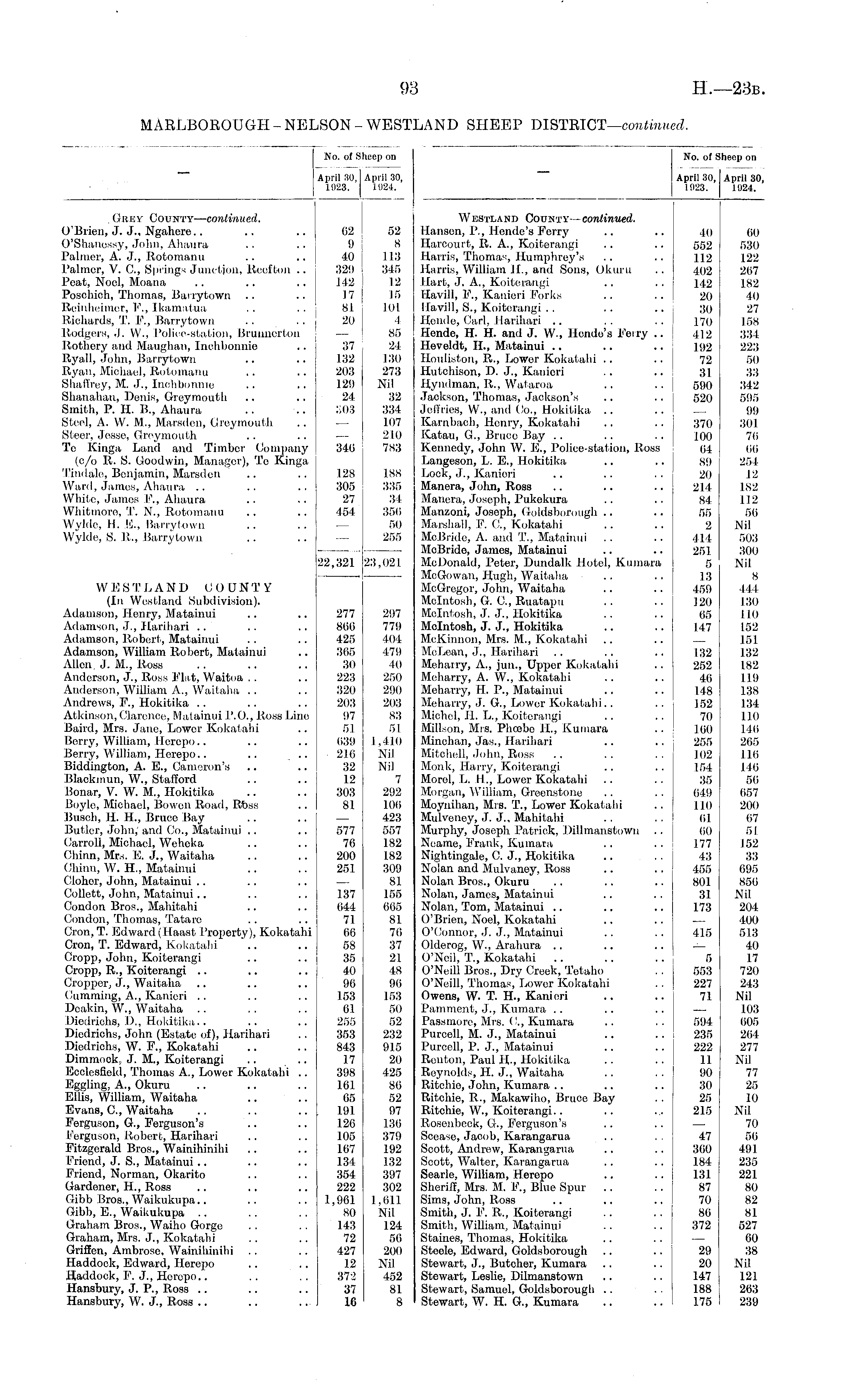 No. of Sheep on April 30, April 30, 1023. 1024. Westland County— continued. Hansen, P., Hende's Ferry .. .. 40 60 Harcourt, R. A., Koiterangi .. .. 552 530 Harris, Thomas, Humphrey's .. .. 112 122 Harris, William J and Sons, Okuru .. 402 207 Hart, J. A., Koiterangi .. .. 142 182 Havili, F., Kanieri Forks .. .. 20 40 llavill, S., Koiterangi . . .. .. 30 27 Hende, Carl, Harihari .. . . .. 170 158 Hende, H. H. and J. W-, Hende's Ferry .. 412 334 Heveldt, H., Matainui .. .. .. 192 223 Houliston, R., Lower Kokatahi .. .. 72 50 Hutchison, !). J., Kanieri .. .. 31 33 Hyndman, R., Wataroa .. .. 500 342 Jackson, Thomas, Jackson's .. .. 520 595 Jeffries, W., and Co., Hokitika .. .. — 99 Kambaoh, Henry, Kokatahi .. .. 370 301 Katau, G., Bruce Bay . . .. .. 100 70 Kennedy, John W. 15., Police-station, Ross 64 60 Langeson, L. E., Hokitika .. .. 89 254Lock, J., Kanieri .. .. .. 20 12 Manera, John, Ross .. .. .. 214 182 Manera, Joseph, Pukekura .. .. 84 112 Manzoni, Joseph, Goldsborough .. .. 55 50 Marshall, F. C., Kokatahi .. .. 2 Nil MoBride, A. and T., Matainui .. .. 414 503 McBride, James, Matainui .. .. 251 300 McDonald, Peter, Dundalk Hotel, Kuinara 5 Nil McGowan, Hugh, Waitaha .. .. 13 8 McGregor, John, Waitaha .. .. 459 444 Mcintosh, G. 0., Ruatapu .. .. 120 130 Mcintosh, J. J., Hokitika .. .. 05 110 Mcintosh, J. J., Hokitika .. .. 147 152 McKinnoa, Mrs. M., Kokatahi .. .. — 151 McLean, J., Harihari .. .. .. 132 132 Meharry, A., jun., Upper Kokatahi .. 252 182 Moharry, A. W., Kokatahi .. .. 40 119 Meharry, H. P., Matainui .. .. 148 138 Meharry, J. G., Lower Kokatahi.. .. 152 134 Michol, H. L., Koiterangi .. .. 70 110 Millson, Mrs. Phoebo H., Kumara .. 100 140 Minchan, Jas., Harihari .. .. 255 205 Mitchell, John, Ross .. .. .. 102 110 Monk, Harry, Koiterangi .. .. 154 140 Morel, L. H., Lower Kokatahi .. .. 35 50 Morgan, William, Greenstone .. .. 649 057 Moynihan, Mrs. T., Lower Kokatahi .. 110 200 Mulveney, J. J., Mahitahi .. .. 01 67 Murphy, Joseph Patrick, Dillmanstown .. 60 51 Neame, Frank, Kuinara .. .. 177 152 Nightingale, C. J., Hokitika .. .. 43 33 Nolan and Mulvaney, Ross .. .. 455 095 Nolan Bros., Okuru .. .. .. 801 856 Nolan, James, Matainui .. . . 31 Nil Nolan, Tom, Matainui .. .. .. 173 204 O'Brien, Noel, Kokatahi .. .. — 400 O'Connor, J. J., Matainui .. .. 415 513 Olderog, W., Arahura .. .. .. — 40 O'Neil, T., Kokatahi .. .. .. 5 17 O'Neill Bros., Dry Creek, Tetaho . . 553 720 O'Neill, Thomas, Lower Kokatahi .. 227 243 Owens, W. T. H., Kanieri .. .. 71 Nil Pamment, J., Kumara .. .. .. — 103 Passmore, Mrs. C., Kumara .. . . 594 605 Purcell, M. J., Matainui .. .. 235 204 Purcell, P. J., Matainui .. .. 222 277 Ronton, Paul IL, Hokitika .. .. 11 Nil Reynolds, H. J., Waitaha .. . . 90 77 Ritchie, John, Kumara .. .. .. 30 25 Ritchie, R., Makawiho, Bruce Bay . . 25 10 Ritchie, W., Koiterangi.. .. .. 215 Nil Rosenbeck, G., Ferguson's .. .. ■— 70 Scease, Jacob, Karangarua .. . . 47 50 Scott, Andrew, Karangarua .. .. 300 491 Scott, Walter, Karangarua .. .. 184 235 Searle, William, Herepo .. .. 131 221 Sheriff, Mrs. M. F., Blue Spur .. .. 87 80 Sims, John, Ross .. .. .. 70 82 Smith, J. F. R., Koiterangi .. .. 80 81 Smith, William, Matainui .. .. 372 527 Staines, Thomas, Hokitika .. . . — 00 Steele, Edward, Goldsborough .. .. 29 38 Stewart, J., Butcher, Kumara .. .. 20 Nil Stewart, Leslie, Dilmanstown .. .. 147 121 Stewart, Samuel, Goldsborough .. ■ . 188 263 Stewart, W. H. G., Kumara .. .. 175 239