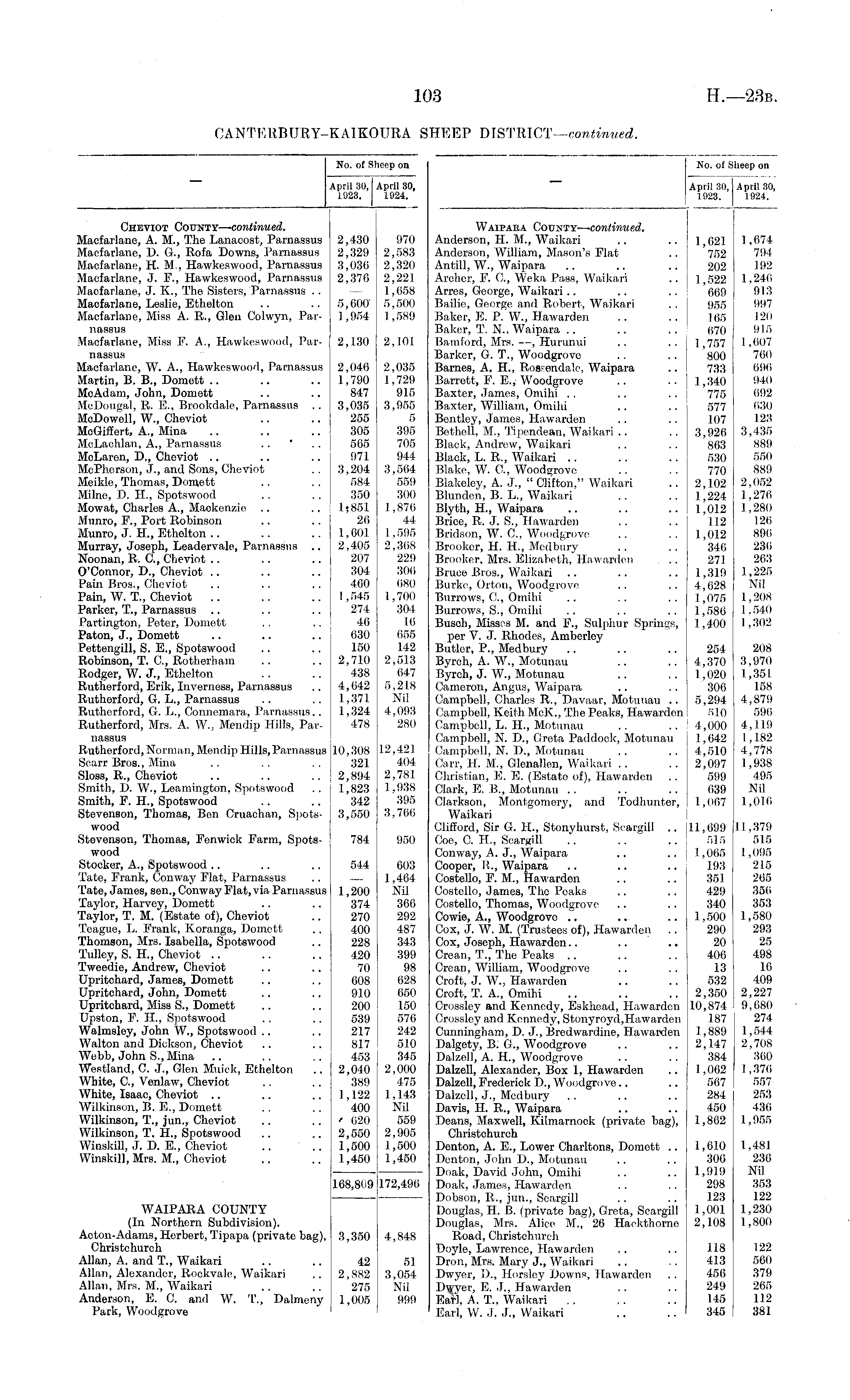 No. of Sheep on April 30, April 30, 1923. 1924. Chisviot County—continued. Macfarlane, A. M., The Lanacost, Parnassus 2,430 970 Macfarlane, 1). G., Rofa Downs, Parnassus 2,329 2,583 Macfarlane, H. M., Hawkeswood, Parnassus 3,036 2,320 Macfarlane, J. F., Hawkeswood, Parnassus 2,376 2,221 Macfarlane, J. K., The Sisters, Parnassus .. 1,658 Macfarlane, Leslie, Ethelton .. .. 5,600 5,500 Macfarlane, Miss A. R., Glen Colwyn, Par- 1,954 1,589 nassus Macfarlane, Miss F. A., Hawkeswood, Par- 2,130 2,101 nassus Macfarlane, W. A., Hawkeswood, Parnassus 2,046 2,035 Martin, B. B., Domett .. .. .. 1,790 1,729 MoAdam, John, Domett .. .. 847 915 McDougal, R. E., Brookdale, Parnassus .. 3,035 3,955 McDowell, W., Cheviot .. .. 255 5 McGiflert, A., Mina .. .. .. 305 395 McLachlan, A., Parnassus . . ' . . 565 705 McLaren, D., Cheviot .. .. .. 971 944 McPherson, J., and Sons, Cheviot .. 3,204 3,564 Meilde, Thomas, Domett .. . . 584 559 Milne, D. H., Spotswood .. .. 350 300 Mowat, Charles A., Maokenzio .. .. 1 5 851 1,876 Munro, F., Port Robinson .. .. 26 44 Munro, J. II., Ethelton .. .. .. 1,601 1,595 Murray, Joseph, Leadervale, Parnassus .. 2,405 2,368 Noonan, R. C., Cheviot .. .. .. 207 229 O'Connor, D., Cheviot .. .. .. 304 306 Pain Bros., Cheviot .. .. .. 460 080 Pain, W. T., Cheviot .. .. .. 1,545 1,700 Parker, T., Parnassus .. .. .. 274 304 Partington, Peter, Domett .. ,. 46 16 Paton, J., Domett .. .. .. 630 655 Pettengill, S. E., Spotswood .. .. 150 142 Robinson, T. C., Rotherham .. .. 2,710 2,513 Rodger, W. J., Ethelton . . .. 438 647 Ruthorford, Erik, Inverness, Parnassus .. 4,642 5,218 Rutherford, G. L., Parnassus .. .. 1,371 Nil Rutherford, G. L., Connemara, Parnassus.. 1,324 4,093 Rutherford, Mrs. A. W., Mendip Hills, Par- 478 280 nassus Rutherford,Norman, Mendip Hills,Parnassus 10,308 12,421 Scarr Bros., Mina . . . . .. 321 404 Sloss, R., Cheviot .. .. .. 2,894 2,781 Smith, D. W., Leamington, Spotswood .. 1,823 1,938 Smith, F. H., Spotswood .. .. 342 395 Stevenson, Thomas, Bon Cruachan, Spots- 3,550 3,766 wood Stevenson, Thomas, Fenwick Farm, Spots- 784 950 wood Stocker, A., Spotswood .. .. .. 544 603 Tate, Frank, Conway Flat, Parnassus .. 1,464 Tate, James, sen., Conway Flat, via Parnassus 1,200 Nil Taylor, Harvey, Domett .. .. 374 366 Taylor, T. M. (Estate of), Cheviot .. 270 292 Teague, L. Frank, Koranga, Domett- .. 400 487 Thomson, Mrs. Isabella, Spotswood .. 228 343 Tulley, S. H., Cheviot .. .. .. 420 399 Tweedie, Andrew, Cheviot .. .. 70 98 Upritchard, James, Domett .. .. 608 628 Upritehard, John, Domett .. .. 910 650 Upritchard, Miss S., Domett .. .. 200 150 Upston, F. H., Spotswood . . .. 539 576 Walmsley, John W., Spotswood .. .. 217 242 Walton and Dickson, Cheviot .. .. 817 510 Webb, John S., Mina .. .. .. 453 345 Westland, C. J., Glen Muick, Ethelton .. 2,040 2,000 White, C., Venlaw, Cheviot .. .. 389 475 White, Isaac, Cheviot .. .. 1,122 1,143 Wilkinson, B. E., Domett . . . . 400 Nil Wilkinson, T., jun., Cheviot .. .. ' 620 559 Wilkinson, T. H., Spotswood .. .. 2,550 2,905 Witiskill, J. D. E., Cheviot .. .. 1,500 1,500 Winskill, Mrs. M., Cheviot .. .. 1,450 1,450 168,809 172,496 WAIPARA COUNTY (In Northern Subdivision). Acton-Adams, Herbert, Tipapa (private bag), 3,350 4,848 Chris tchurch Allan, A. and T., Waikari .. .. 42 51 Allan, Alexander, Rockvale, Waikari .. 2,882 3,054 Allan, Mrs. M., Waikari .. .. 275 Nil Anderson, E. C. and W. T., Dalmeny 1,005 999 Park, Woodgrove