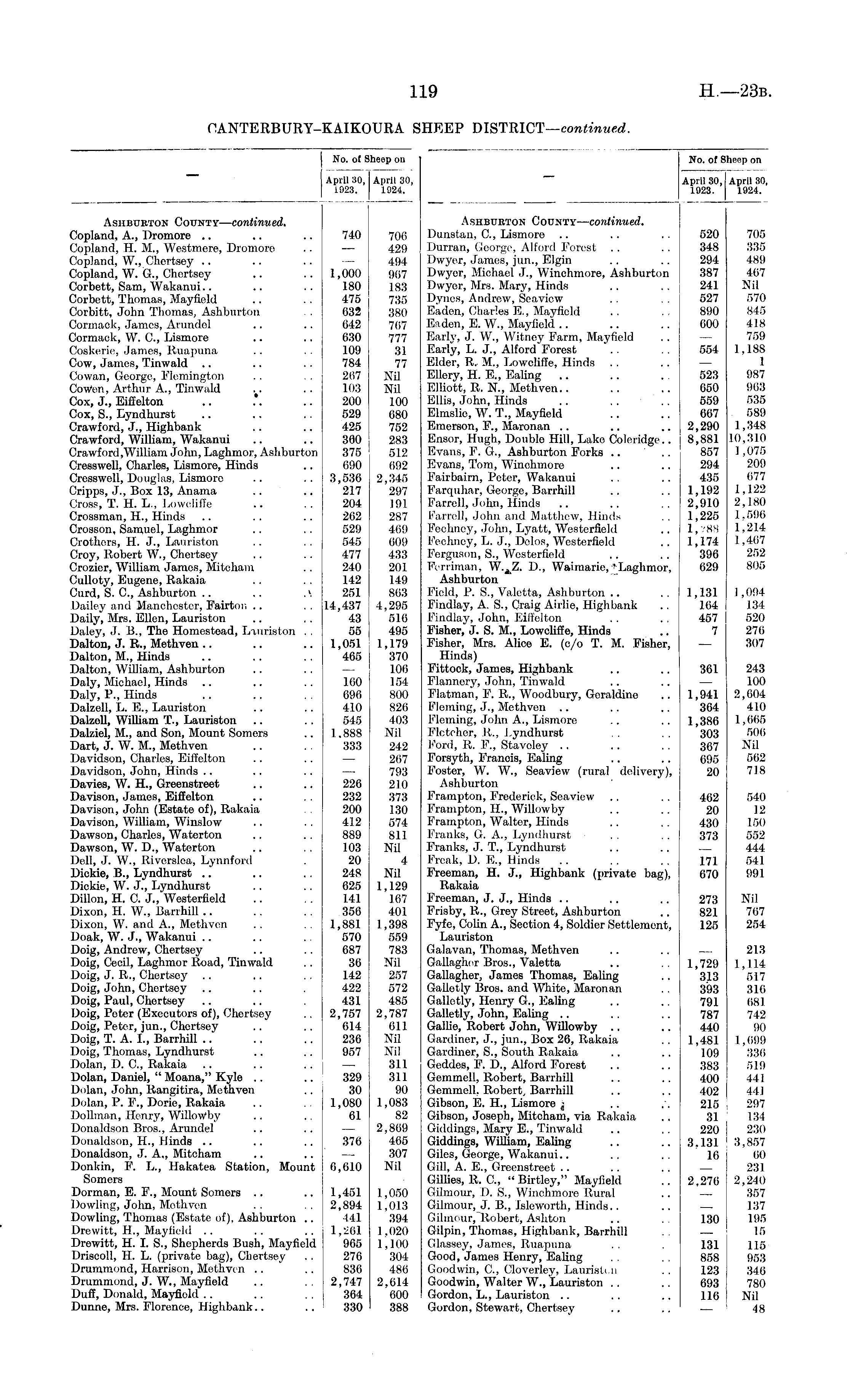 No. of Sheep on April 30, April 30, 1823. 1924. Ashbtjeton County—continued. Dunstan, C., Lismore .. .. . . 520 705 Durran, George, Alford Forest . . . . 348 335 Dwyer, James, jun., Elgin .. .. 294 489 Dwyer, Michael J., Winchmore, Ashburton 387 407 Dwyer, Mrs. Mary, Hinds .. .. 241 Nil Dynes, Andrew, Seaview . . 527 570 Eaden, Ohar'.es E., Mayfield . . 890 845 Eaden, E. W., Mayfield.. .. .. 000 418 Early, J. W., Witney Farm, Mayfield .. — 759 Early, L. J., Alford Forest . . 554 1,18S Elder, R, M., Lowcliffe, Hinds .. .. — 1 Ellery, H. E„ Ealing .. .. . 523 987 Elliott, II. N., Methven.. . . .. 050 903 Ellis, John, Hinds .. . . . . 559 535 Elmslie, W. T., Mayfield .. .. 607 589 Emerson, F., Maronan .. .. .. 2,290 1,348 Ensor, Hugh, Doublo Hill, Lake Coleridge.. 8,881 10,310 Evans, F. G., Ashburton Forks .. .. 857 1,075 Evans, Tom, Winchmore .. .. 294 209 Fairbairn, Peter, Wakanui . . .. 435 077 Farquhar, George, Barrhill .. .. 1,192 1,122 Farrell, John, Hinds .. .. .. 2,910 2,180 Farrell, John and Matthew, Hinds 1,225 1,596 Feohnoy, John, Lyatt, Westerfield .. 1, 88 1,214 B'echney, L. J., Delos, Westerfield .. 1,174 1,467 Ferguson, S., Westerfield .. .. 396 252 Ferriman, Z. D., Waimarie, ' Laghmor, 629 805 Ashburton Field, P. S., Valetta, Ashburton .. . . 1,131 1,094 Findlay, A. S., Craig Airlie, Highbank .. 104 134 Findlay, John, Eiffelton .. . . 457 520 Fisher, j. S. M., Lowcliffe, Hinds .. 7 270 Fisher, Mrs. Alice E. (c/o T. M. Fisher, — 307 Hinds) Fittock, James, Highbank .. .. 361 243 Flannery, John, Tinwakl .. .. — 100 Flatman, F. R., Woodbury, Goraldine .. 1,941 2,604 Fleming, J., Methven .. .. .. 364 410 Fleming, John A., Lismore .. .. 1,386 1,665 Fletcher, R., Lyndhurst 303 506 Ford, R. F., Stavoley .. .. . . 307 Nil Forsyth, Franois, Ealing .. .. 695 562 Foster, W. W., Seaview (rural delivery), 20 718 Ashburton Frampton, Frederick, Seaview .. . . 462 540 Frampton, H., Willowby .. .. 20 12 Frampton, Walter, Hinds .. . . 430 150 Franks, G. A., Lyndhurst . . . . 373 552 Franks, J. T., Lyndhurst .. .. — 444 Freak, D. E., Hinds .. . . . . 171 541 Freeman, H. J., Highbank (private bag), 670 991 Rakaia Freeman, J. J., Hinds .. .. .. 273 Nil Frisby, R., Grey Street, Ashburton .. 821 767 Fyfe, Colin A., Section 4, Soldier Settlement, 125 254 Lauriston Galavan, Thomas, Methven .. .. — 213 Gallagher Bros., Valetta .. 1,729 1,114 Gallagher, James Thomas, Ealing .. 3,13 517 Galletly Bros, and White, Maronan .. 393 310 Galletly, Henry G., Ealing .. .. 791 681 Galletly, John, Ealing .. . . .. 787 742 Gallic, Robert John, Willowby .. .. 440 90 Gardiner, J., jun., Box 26, Rakaia .. 1,481 1,609 Gardiner, S., South Rakaia .. .. 109 336 Geddes, F. D., Alford Forest .. . . 383 519 Gemmell, Robert, Barrhill . . .. 400 441 Gemmell, Robert, Barrhill .. .. 402 441 Gibson, E. H., Lismore j .. .. 215 297 Gibson, Joseph, Mitcham, via Rakaia .. 31 134 Giddings, Mary E., Tinwald .. . . 220 i 230 Giddings, William, Ealing .. .. 3,131 3,857 Giles, George, Wakanui.. .. .. 16 60 Gill, A. E., Greenstreet .. .. .. — 231 Gillies, R. C., " Birtley," Mayfield .. 2,276 2,240 Gilmour, D. S., Winchmore Rural .. — 357 Gilmour, J. B., Isleworth, Hinds.. .. — 137 Gilmour, Robert, Ashton .. 130 195 Gilpin, Thomas, Highbank, Barrhill — 15 Glassey, James, Ruapuna . . 131 115 Good, James Henry, Ealing . . .. 858 953 Goodwin, C., Cloverley, Lauristi.il . . 123 340 Goodwin, Walter W., Lauriston .. .. 693 780 Gordon, L., Lauriston .. .. .. 116 Nil Gordon, Stewart, Chertsey .. .. — 48