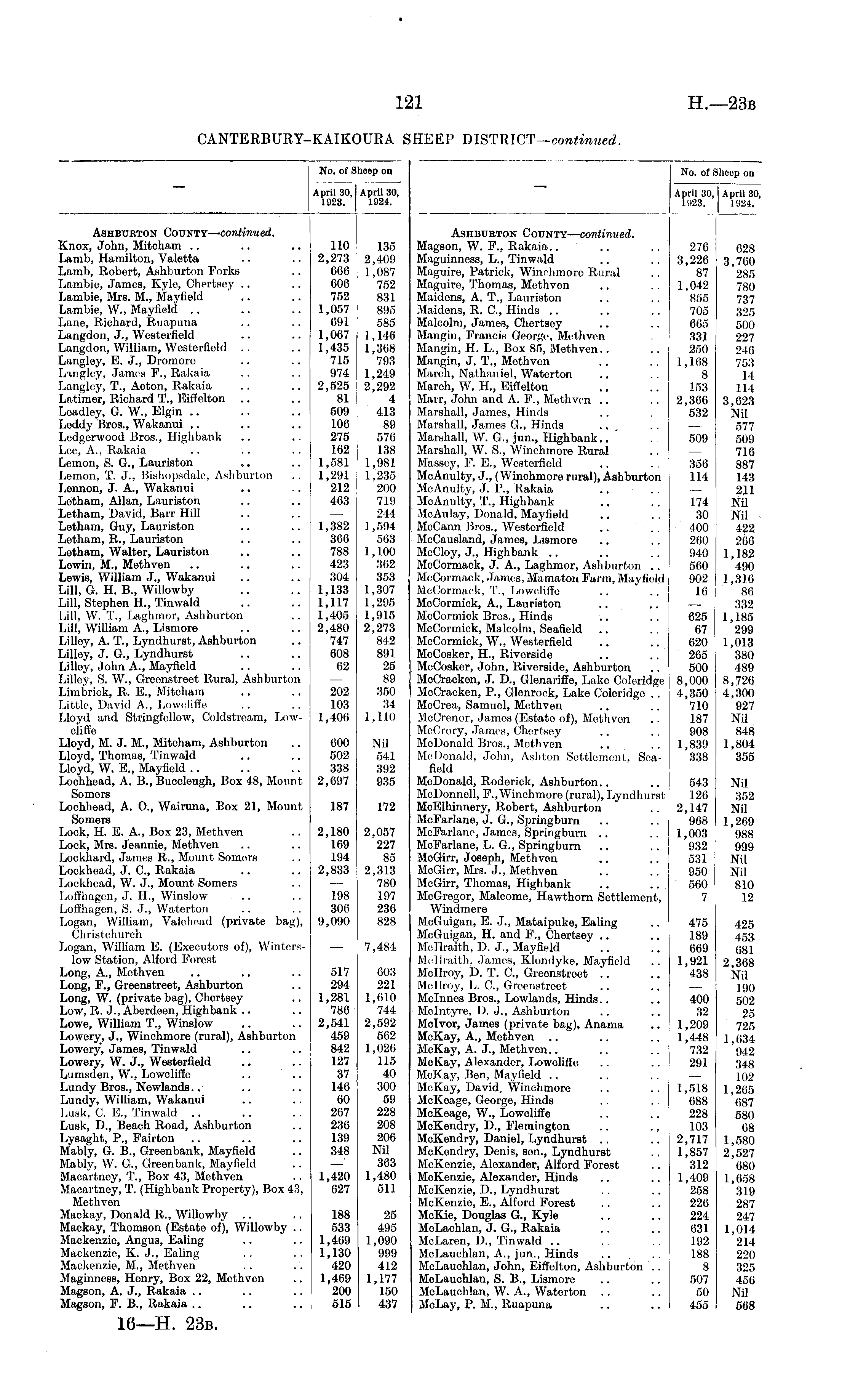 No. of Sheop on April 30,1 April 30, 1923. 1924, Ashburton County—continued. Magson, W. J?., Rakaia.. .. .. 276 628 Maguinness, L., Tinwald .. .. 3,226 3,760 Maguire, Patrick, Winchmore Rural . . 87 285 Maguire, Thomas, Methven .. .. 1,042 780 Maidens, A. T., Lauriston .. .. 855 737 Maidens, R. C., Hinds .. .. .. 705 325 Malcolm, James, Chertsey .. .. 665 500 Mangin, Francis George, Methven . j 331 227 Mangin, H. L., Box 85, Methven.. .. j 250 246 Mangin, J. T., Methven .. .. 1,168 753 March, Nathaniel, Watcrton .. 8 14 March, W. H., EifEelton .. 153 114 Mair, John and A. F., Methven .. .. 2,366 3,623 Marshall, James, Hinds .. 532 Nil Marshall, James G., Hinds ... .. — 577 Marshall, W. G., jun., Highbank.. 509 509 Marshall, W. S., Winchmore Rural .. — 716 Massey, F. E., Westerfield .. . . 356 887 McAnulty, J., (Winchmore rural), Ashburton 114 143 McAnulty, J. P., Rakaia .. .. — 211 McAnulty, T., Highbank .. ., 174 Nil MeAulay, Donald, Mayfield .. .. 30 Nil McCann Bros., Westerfield .. . . 400 422 McCausland, James, Lismore .. .. 260 266 McCloy, J., Highbank .. .. .. 940 1,182 McCormack, J. A., Laghmor, Ashburton .. 560 490 McCormack, James, Mamaton Farm, Mayfield 902 1,316 McCormack, T., Lowcliffe .. .. 16 86 McCormiok, A., Lauriston .. .. — 332 McCormick Bros., Hinds .. .. 625 1,185 McCormick, Malcolm, Seafield .. .. 67 299 McCormick, W., Westerfield .. ... 620 1,013 McCosker, H., Riversido .. .. 265 380 McCosker, John, Riversido, Ashburton .. 500 489 McCracken, J. D., Glenarifie, Lake Coleridge 8,000 8,726 McCracken, P., Glenrock, Lake Coleridge .. 4,350 4,300 McCrea, Samuol, Mothvon .. .. 710 927 McCrenor, Jamos (Estate of), Methven .. 187 Nil McCrory, James, Chortsey .. .. 908 848 McDonald Bros., Methven .. .. 1,839 1,804 McDonald, John, Ashton Settlement, Sea- 338 355 field McDonald, Roderick, Ashburton.. .. 543 Nil McDonnell, F., Winchmore (rural), Lyndhurst 126 352 McElhinnery, Robert, Ashburton .. 2,147 Nil McFarlane, J. G., Springburn .. .. 968 1,269 McFarlane, James, Springburn .. .. 1,003 988 McFarlane, L. G., Springburn .. .. 932 999 MeGirr, Joseph, Methven .. .. 531 Nil McGirr, Mrs. J., Methven .. .. 950 Nil MeGirr, Thomas, Highbank .. .. 560 810 McGregor, Malcome, Hawthorn Settlement, 7 12 Windmere McGuigan, E. J., Mataipuke, Ealing .. 475 425 McGuigan, H. and F., Chertsey .. .. 189 453 Mcllraith, D. J., Mayfield .. .. 669 681 Mellraith, James, Klondyke, Mayfield .. 1,921 2,368 Mcllroy, D. T. C., Greonstroet .. .. 438 NU Mcllroy, L. C., Greenstreet .. .. — ]90 Mclnnes Bros., Lowlands, Hinds.. .. 400 502 Mclntyre, D. J., Ashburton .. ,. 32 25 Melvor, James (private bag), Anama .. 1,209 725 McKay, A., Methven .. .. .. 1,448 1,634 McKay, A. J., Methven.. .. .. 732 '942 McKay, Alexander, Lowcliffe .. .. 291 348 McKay, Ben, Mayfield .. .. .. — 102 McKay, David, Winchmore .. .. 1,518 1,265 McKeage, George, Hinds . . .. 688 687 McKeage, W., Lowcliffe .. .. 228 580 McKendry, D., Flemington .. ., 103 68 McKendry, Daniel, Lyndhurst .. .. 2,717 1,580 McKendry, Denis, sen., Lyndhurst .. 1,857 2,527 McKenzie, Alexander, Alford Forest .. 312 680 McKenzie, Alexander, Hinds .. .. 1,409 1,658 McKenzie, D., Lyndhurst .. .. 258 319 McKenzie, E., Alford Forest .. .. 226 287 MoKie, Douglas G., Kyle .. .. 224 247 McLachlan, J. G., Rakaia .. .. 631 1,014 McLaren, D., Tinwald .. . . . . 192 214 McLauchlan, A., jun., Hinds .. . , 188 220 McLauchlan, John, Eiffelton, Ashburton .. 8 325 McLauchlan, S. B., Lismore .. .. 507 456 McLauchlan, W. A., Waterton .. .. 50 Nil McLay, P. M, Ruapuna .. .. 455 568