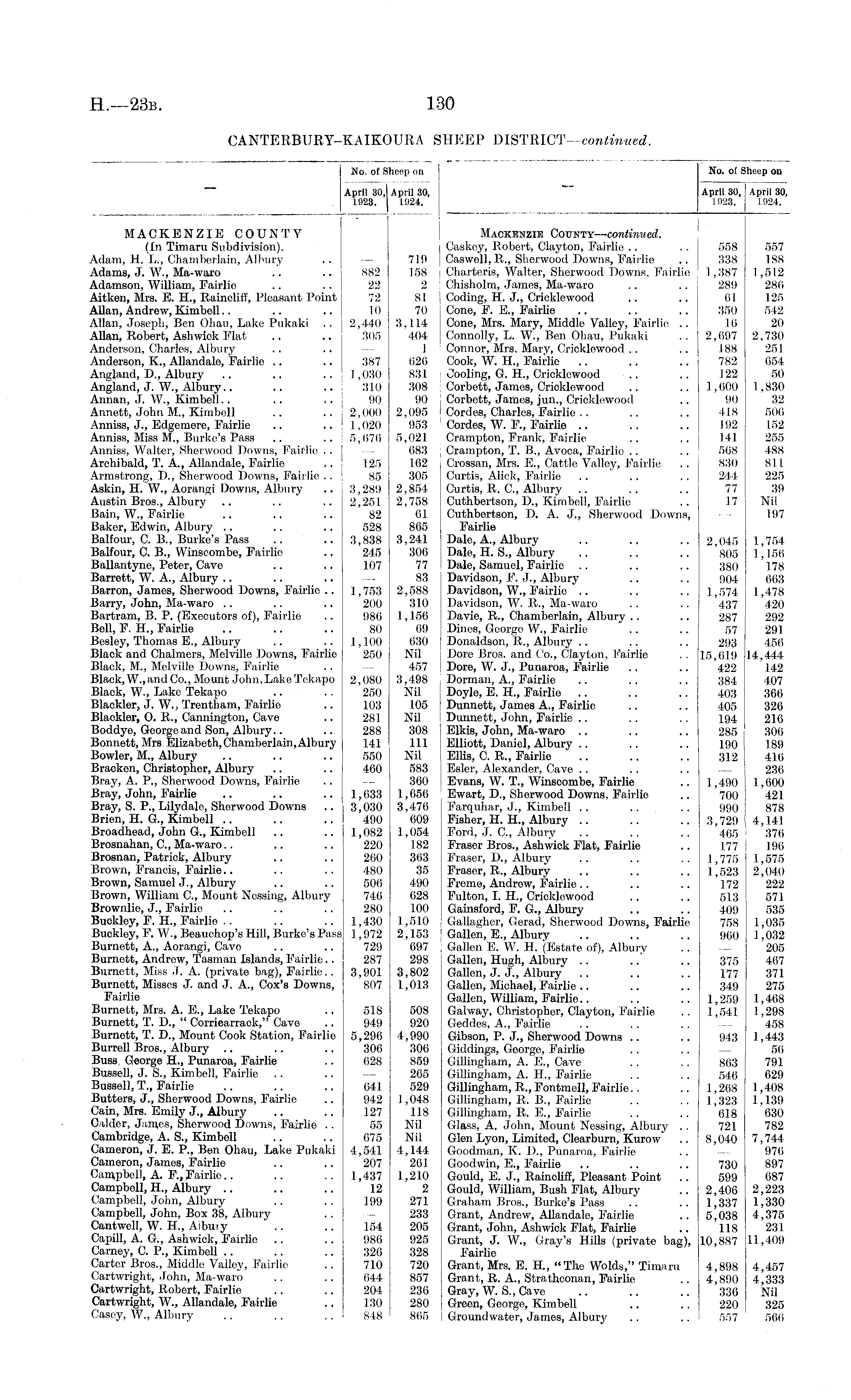 No. of Sheep on April 30, April 30, 1923. 1924. Mackenzie County—continued. Caskoy, Robert, Clayton, Fairlie .. .. 558 557 Caswell, R., Sherwood Downs, Fail-lie .. 338 188 Charteris, Walter, Sherwood Downs, Fairlie 1,387 1,512 Chisholm, James, Ma-waro .. .. 289 280 Coding, H. J., Cricklewood .. .. 61 125 Cone, F. E., Fairlie .. .. .. 350 542 Cone, Mrs. Mary, Middle. Valley, Fairlie .. 10 20 Connolly, L. W., Ben Ohau, Pukaki . . 2,097 2,730 Connor, Mrs. Mary, Cricklewood .. .. .188 251 Cook, W. H., Fairlie .. .. .. 782 054 Cooling, G. H., Cricklewood .. .. 122 50 Corbett, James, Cricklewood .. .. 1,000 1,830 Corbett, James, jun., Cricklewood .. 90 32 Cordes, Charles, Fairlie .. .. .. 418 500 Cordes, W. F., Fairlie .. .. .. 192 152 Crampton, Frank, Fairlie .. .. 141 255 Crampton, T. B., Avoca, Fairlie .. .. 568 488 Crossan, Mrs. E., Cattle Valley, Fairlie . . 830 811 Curtis, Alick, Fairlie .. .. .. 244 225 Curtis, R. C., Albury .. .. .. 77 39 Cuthbertson, D., Kim bell, Fairlie .. .17 Nil Cuthbertson, D. A. J., Sherwood Downs, 197 Fairlie Dale, A., Albury .. .. .. 2,045 1,754 Dale, H. S„ Albury .. .. .. 805 1,156 Dale, Samuel, Fairlie .. .. .. 380 178 Davidson, F. J., Albury .. .. 904 063 Davidson, W., Fairlie .. .. .. 1,574 1,478 Davidson, W. R., Ma-waro .. .. 437 420 Davie, R., Chamberlain, Albury .. .. 287 292 Dines, George W., Fairlie .. .. 57 291 Donaldson, R., Albury .. .. .. 293 456 Dore Bros, and Co., Clayton, Fairlie .. 15,619 14,444 Dore, W. J., Punaroa, Fairlie .. .. 422 142 Dorman, A., Fairlie .. .. .. 384 407 Doyle, E. H., Fairlie .. .. .. 403 360 Dunnett, James A., Fairlie .. .. 405 320 Dunnett, John, Fairlie .. .. . . 194 216 Elkis, John, Ma-waro .. .. .. 285 300 Elliott, Daniel, Albury .. .. . . 190 189 Ellis, C. R., Fairlie .. .. .. 312 410 Esler, Alexander, Cave .. .. .. — 236 Evans, W. T., Winscombe, Fairlie .. 1,490 1,600 Ewart, D., Sherwood Downs, Fairlie ,. 700 421 Farquhar, J., Kimbell .. .. .. 990 878 Fisher, H. H., Albury .. .. .. 3,729 4,141 Ford, J. C., Albury .. .. .. 465 370 Fraser Bros., Ash wick Flat, Fairlie .. 177 J 90 Fraser, D., Albury .. .. .. 1,775 1,575 Fraser, R., Albury .. .. .. 1,523 2,040 Freme, Andrew, Fairlie.. .. .. 172 222 Fulton, I. H., Cricklewood .. .. 513 571 Gainsford, F. G., Albury .. .. 409 535 Gallagher, Gerad, Sherwood Downs, Fairlie 758 1,035 Gallen, E., Albury .. .. .. 900 1,032 Gallen E. W. H. (Estate of), Albury .. — 205 Gallen, Hugh, Albury .. .. .. 375 467 Gallen, J. J., Albury .. .. .. 177 371 Gallen, Michael, Fairlie.. .. .. 349 275 Gallen, William, Fairlie.. .. .. 1,259 1,468 Galway, Christopher, Clayton, Fairlie .. 1,541 1,298 Geddes, A., Fairlie .. . . . . — 458 Gibson, P. J., Sherwood Downs .. .. 943 1,443 Giddings, George, Fairlie . . .. — 50 Gillingham, A. E., Cave .. .. 803 791 Gillingham, A. H., Fairlie . . .. 540 029 Gillingham, R., Fontmell, Fairlie. . .. 1,208 1,408 Gillingham, R. B., Fairlie .. .. 1,323 1,139 Gillingham, R. E., Fairlie .. .. 618 630 Glass, A. John, Mount Nessing, Albury .. 721 782 Glen Lyon, Limited, Clearburn, Kurow .. 8,040 7,744 Goodman, K. D., Punaroa, Fairlie .. 976 Goodwin, E., Fairlie .. .. .. 730 897 Gould, E. J., Raincliff, Pleasant Point .. 599 087 Gould, William, Bush Flat, Albury .. 2,400 2,223 Graham Bros., Burke's Pass .. .. 1,337 1,330 Grant, Andrew, Allandale, Fairlie .. 5,038 4,375 Grant, John, Ashwiek Flat, Fairlie .. 118 231 Grant, J. W., Gray's Hills (private bag), 10,887 11,409 Fairlie Grant, Mrs. E. H., "The Wolds," Tima.ru 4,898 4,457 Grant, R. A., Strathconan, Fairlie .. 4,890 4,333 Gray, W. S., Cave .. .. .. 336 Nil Green, George, Kimbell .. . . 220 325 Groundwater, James, Albury .. .. 557 560