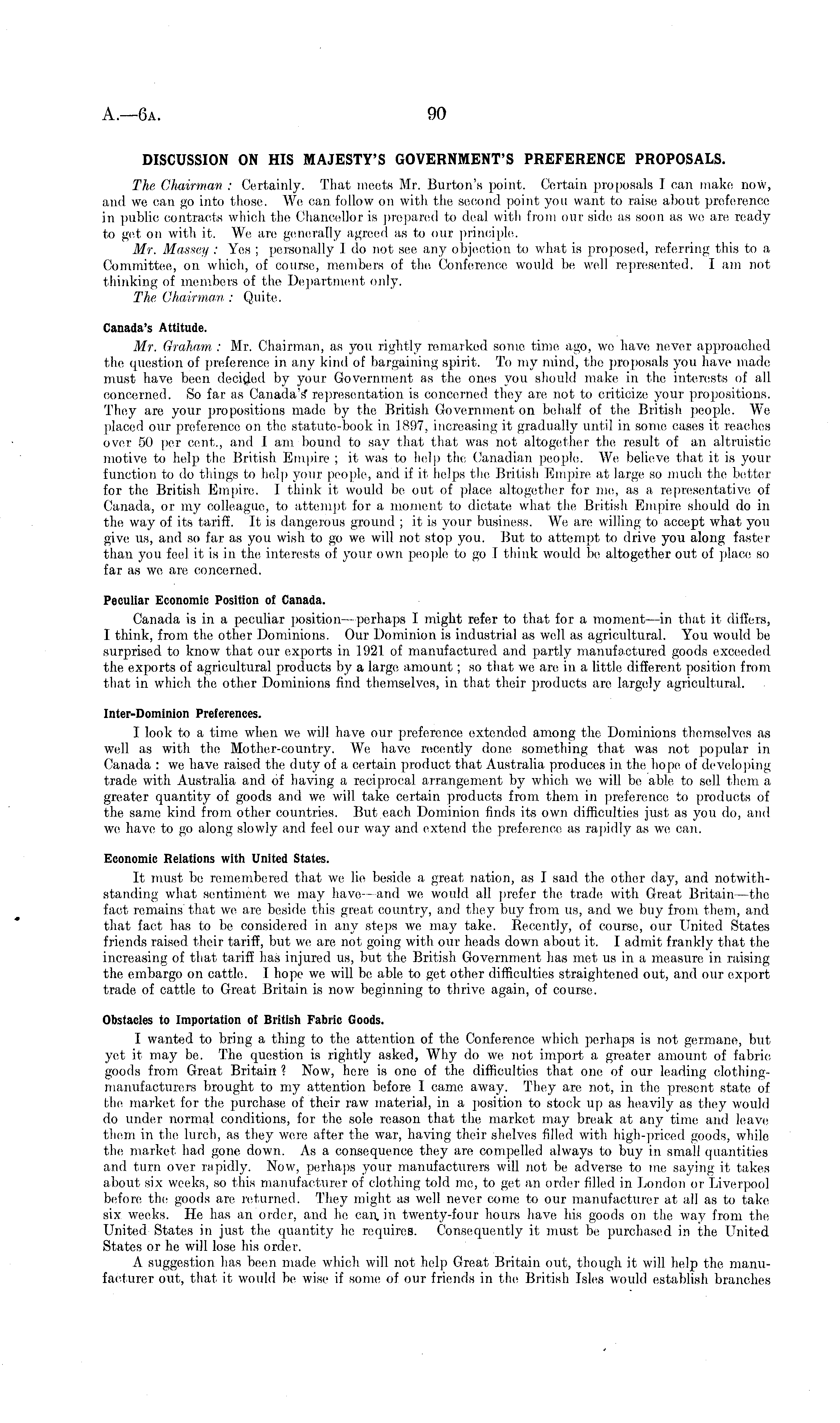 DISCUSSION ON HIS MAJESTY'S GOVERNMENT'S PREFERENCE PROPOSALS. The Chairman : Certainly. That meets Mr. Burton's point. Certain proposals I can make now, and we can go into those. We can follow on with the second point you want to raise about preference; in public contracts which the Chancellor is prepared to deal with from our side as soon as we are, ready to get on with it. We arc generally agreed as to eiur principle. Mr. Massey : Yes ; personally I do not see any objection to what is proposeel, referring this to a Committee, on which, of course, members of the Conference woulel be well represented. I am not thinking of members of the Department only. The Chairman : Quite. Canada's Attitude. Mr. Graham : Mr. Chairman, as you rightly remarked some, time ago, we have; never approached the question of preference in any kind of bargaining spirit. Tei my mind, the proposals you have made must have been decided by your Government as the ones you shoulel make in the interests of all cone;erned. So far as Canada's" representation is concerned they are not to criticize your propositions. They are your propositions made by the British Government on behalf of the British people. We placed our preference on the statute-book in 1897, increasing it gradually until in some cases it reaches over 50 per cent., and I am bound to say that that was not altogether the result of an altruistic motive to help the British Empire ; it was to help the; Canadian people. We, believe that it is your function to elo things to help your people, and if it helps the British Empire at large so much the better for the British Empire. I think it would be out of place altogether for me, as a representative of Canaela, or my colleague, to attempt for a moment to dictate what the British Empire should do in the way of its tariff. It is dangerous ground ;it is your business. We are willing to accept what you give us, and so far as you wish to go we will not stop you. But to attempt to drive you along faster than you feel it is in the interests of your eiwn people to go I think would be altogether out of place so far as we are concerned. Peculiar Economic Position of Canada. Canada is in a peculiar position —perhaps I might refer to that for a moment —in that it differs, I think, from the other Dominions. Our Dominion is industrial as well as agricultural. You would be surprised to know that our exports in 1921 of manufactured and partly manufactured goods exceedeel the exports of agricultural products by a largo amount; so that we are in a little different position from that in which the; other Dominions find themselves, in that their products are largely agricultural. Inter-Dominion Preferences. I look to a time when we; will have our preference extended among the Dominions themselves as well as with the; Mother-country. We have recently done something that was not popular in Canada : we have raised the duty of a certain product that Australia produces in the hope of developing trade with Australia and of having a reciprocal arrangement by which we will be able to sell them a greater quantity of goods anel we will take certain products from them in preference, to products of the same kind from other countries. But each Dominion finds its own difficulties just as you do, and we have to go along slowly and feel our way and extend the preference as rapidly as we can. Economic Relations with United States. It must be remembered that we lie beside a great nation, as I said the other day, and notwithstanding what sentiment we may hay we would all prefer the trade with Great Britain—the fact remains that we are beside this great country, and they buy from us, and we buy from them, and that fact has to be considereel in any steps we may take. Recently, of course, our United States friends raised their tariff, but we are not going with our heads down about it. I admit frankly that the increasing of that tariff has injured us, but the British Government has met us in a measure in raising the embargo on cattle. 1 hope we will be able to get other difficulties straightened out, and our export trade of cattle to Great Britain is now beginning to thrive again, of course. Obstacles to Importation of British Fabric Goods. I wanted to bring a thing to the attention of the Conference which perhaps is not germane, but yet it may be. The question is rightly asked, Why elo we not import a, greater amount of fabric goods from Great Britain 1 Now, here is one of the elifficulties that one of our leading clothingmanufacturers brought to my attention before I came away. They are not, in the present state of the market for the purchase of their raw materia], in a position to stock up as heavily as they would elo under normal conditions, for the solo reason that the market may break at any time and leave them in the lurch, as they were after the war, having their shelves filled with high-priced goods, while the market, had gone down. As a consequence they are compelled always to buy in small quantities and turn over rapidly. Now, perhaps your manufacturers will not be adverse to me saying it takes about six weeks, so this manufacturer of clothing told me, to get an order filled in London or Liverpool before the gooels are returned. They might as well never come to our manufacturer at all as to take six. weeks. He has an order, and he can in twenty-four hours have his goods on the way from the, United States in just the quantity he requires. Consequently it must be purchased in the United States or he will lose his order. A suggestion has been made which will not help Great Britain out, though it will help the manufacturer out, that, it would be wise if some of our friends in the British Isles would establish branches