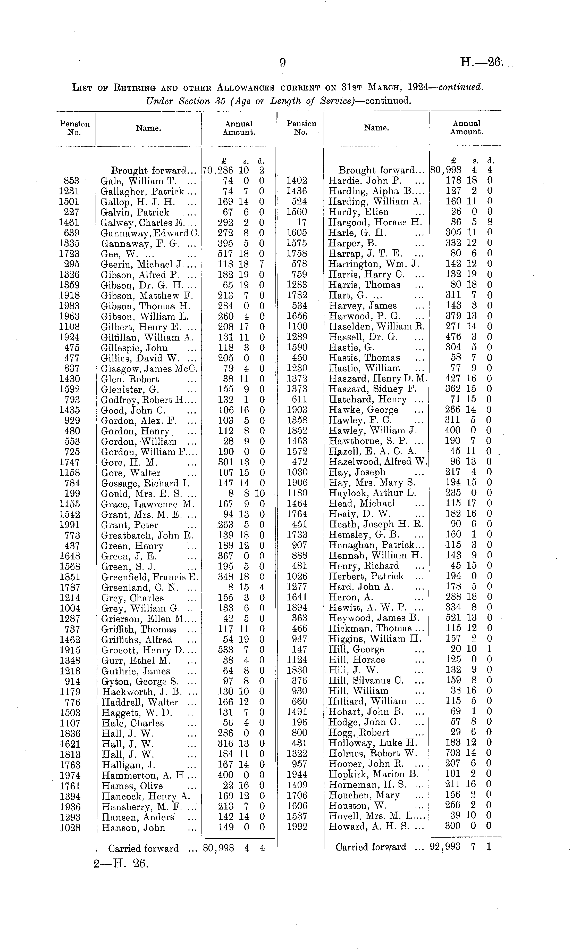 Pension No. Name. Annual Amount. Pension No. Name. Annual Amount. 853 1231 1501 227 1461 639 1335 1723 295 1326 1359 1918 1983 1963 1108 1924 475 477 837 1430 1592 793 1435 929 480 553 725 1747 1158 784 199 1155 1542 1991 773 437 1648 1568 1851 1787 1214 1004 1287 737 1462 1915 1348 1218 914 1179 776 1503 1107 1836 1621 1813 1763 1974 1761 1394 1936 1293 1028 Brought forward... Gale, William T. ... Gallagher, Patrick ... Gallop, H. J. H. ... Garvin, Patrick Galwey, Charles E.... Gannaway, Edward (J, Gannaway, F. G. ... Gee, W. ... Geerin, Michael J. ... Gibson, Alfred P. ... Gibson, Dr. G. II. ... Gibson, Matthew F. Gibson, Thomas H. Gibson, William L. Gilbert, Henry E. ... Gilfillan, William A. Gillespie, John Gillies, David W. ... Glasgow, James McC. ; Glen, Robert j Glenister, G. ! Godfrey, Robert II.... Good, John C. j Gordon, Alex. F. ... Gordon, Henry Gordon, William Gordon, William F.... Gore, H. M. Gore, Walter Gossage, Richard I. Gould, Mrs. E. S. ... Grace, Lawrence M. Grant, Mrs. M. E. ... Grant, Peter Greatbatch, John R. Green, Henry Green, J. E. ! Green, S. J. Greenfield, Francis E. Greenland, C. N. ... Grey, Charles Grey, William G. ... Grierson, Ellen M.... Griffith, Thomas Griffiths, Alfred ... Grocott, Henry D. ... Gurr, Ethel M, Guthrie, James Gyton, George S. ... Hackworth, J. B. ... Haddrell, Walter ... Haggett, W. D. .. Hale, Charles Hall, J. W. Hall, J. W. Hall, J. W. Halligan, J. Hammerton, A. H,... Hames, Olive Hancock, Henry A. Hansberry, M. F. ... Hansen, Anders Hanson, John £ s. d. 70,286 10 2 74 0 0 74 7 0 169 14 0 67 6 0 292 2 0 272 8 0 395 5 0 517 18 0 118 18 7 182 19 0 65 19 0 213 7 0 284 0 0 260 4 0 208 17 0 131 11 0 118 3 0 205 0 0 79 4 0 38 11 0 155 9 0 132 1 0 106 16 0 103 5 0 112 8 0 28 9 0 190 0 0 301 13 0 107 15 0 147 14 0 8 8 10 167 9 0 94 13 0 363 5 0 139 18 0 189 12 0 367 0 0 195 5 0 348 18 0 8 15 4 155 3 0 133 6 0 42 5 0 117 11 0 54 19 0 533 7 0 38 4 0 64 8 0 97 8 0 130 10 0 166 12 0 131 7 0 56 4 0 286 0 0 316 13 0 184 11 0 167 14 0 400 0 0 22 16 0 169 12 0 213 7 0 142 14 0 149 0 0 1402 1436 524 1560 17 1605 1575 1758 578 759 1283 1782 534 1656 1100 1289 1590 450 1230 1372 1373 611 1903 1358 1852 1463 1572 472 1030 1906 1180 1464 1764 451 1733 907 888 481 1026 1277 1641 1894 363 466 947 147 1124 1830 376 930 660 1491 196 800 431 1322 957 1944 1409 1706 1606 1537 1992 Brought forward... Hardie, John P. Harding, Alpha B.... Harding, William A. Hardy, Ellen Hargood, Horace II. Harle, G. H. Harper, B. Harrap, J. T. E. ... Harrington, Wm. J. Harris, Harry C. ... Harris, Thomas Hart, G. ... Harvey, James Harwood, P. G. Haselden, William R. Hassell, Dr. G. Hastie, G. Hastie, Thomas Hastie, William Haszard, Henry D. M. Haszard, Sidney F. Hatchard, Henry ... Hawke, George Hawley, F. C. Hawley, William J. Hawthorne, S. P. ... Hazell, E. A. C. A. Hazelwood, Alfred W. Hay, Joseph Hay, Mrs. Mary S. Haylock, Arthur L. Head, Michael Healy, D. W. Heath, Joseph H. R. Hemsley, G. B. Henaghan, Patrick... Hennah, William H. Henry, Richard Herbert, Patrick Herd, John A. Heron, A. Hewitt, A. W. P. ... Heywood, James B. Hickman, Thomas ... Higgins, William H. Hill, George Hill, Horace Hill, J. W. Hill, Silvanus C. Hill, William Hilliard, William ... Hobart, John B. Hodge, John G, Hogg, Robert Holloway, Luke H. Holmes, Robert W. Hooper, John R. Hopkirk, Marion B. Horneman, H. S. ... Houchen, Mary Houston, W. Hovell, Mrs. M. L.... Howard, A. H. S. ... £ s. d. 80,998 4 4 178 18 0 127 2 0 160 11 0 26 0 0 36 5 8 305 11 0 332 12 0 80 6 0 142 12 0 132 19 0 80 18 0 311 7 0 143 3 0 379 13 0 271 14 0 476 3 0 304 5 0 58 7 0 77 9 0 427 16 0 362 15 0 71 15 0 266 14 0 311 5 0 400 0 0 190 7 0 45 11 0 96 13 0 217 4 0 194 15 0 235 0 0 115 17 0 182 16 0 90 6 0 160 1 0 115 3 0 143 9 0 45 15 0 194 0 0 178 5 0 288 18 0 334 8 0 521 13 0 115 12 0 157 2 0 20 10 1 125 0 0 1.32 9 0 159 8 0 38 16 0 115 5 0 69 1 0 57 8 0 29 6 0 183 12 0 703 14 0 207 6 0 101 2 0 211 16 0 156 2 0 256 2 0 39 10 0 300 0 0 Carried forward ... '80,998 4 4 Carried forward ... '92,993 7 1