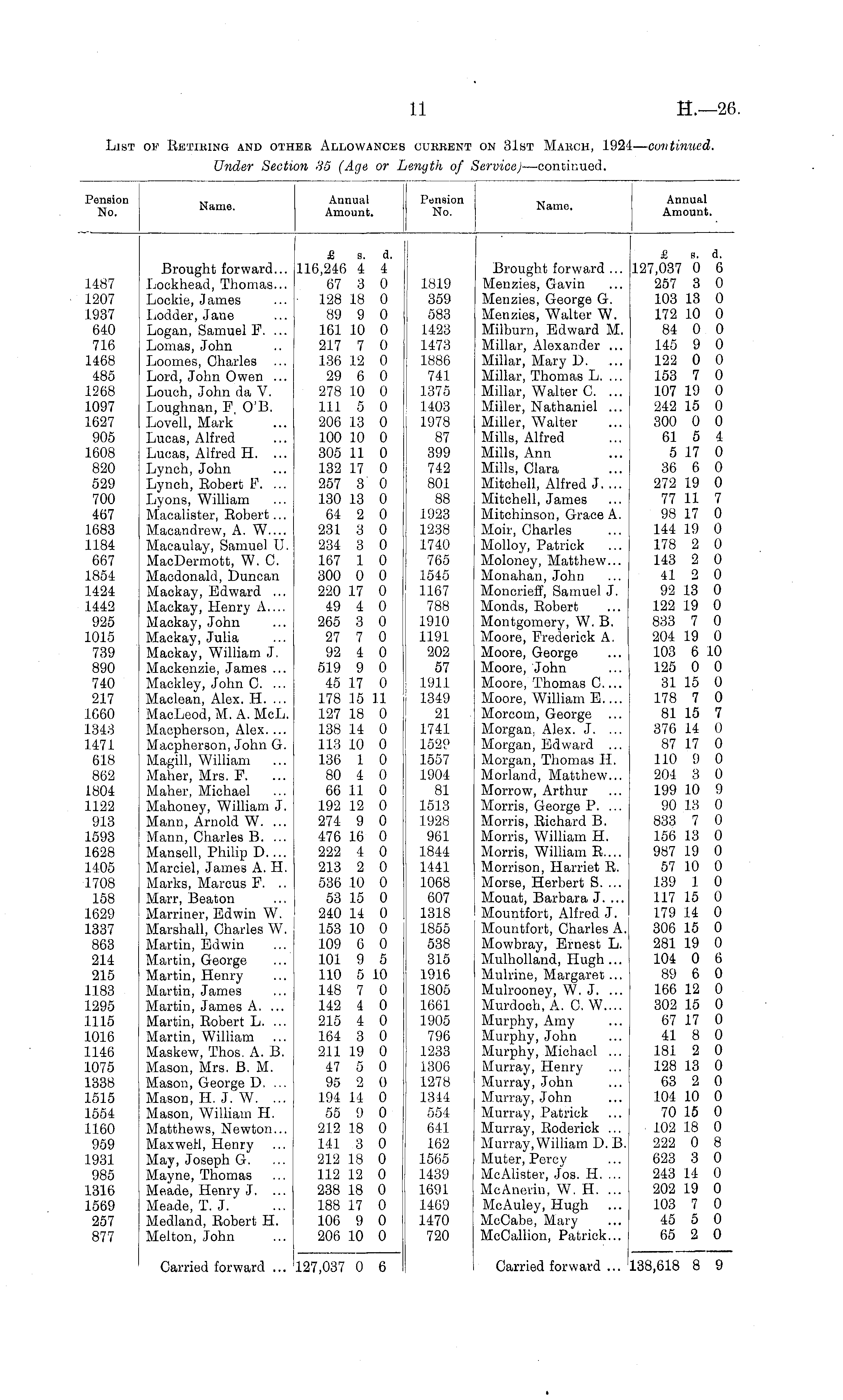 'ension No. Name. Annual Amount. Pension No. Name. Annual Amount. 1487 1207 1937 640 716 1468 485 1268 1097 1627 905 1608 820 529 700 467 1683 1184 667 1854 1424 1442 925 1015 739 890 740 217 1660 1343 1471 618 862 1804 1122 913 1593 1628 1405 1708 158 1629 1337 863 214 215 1183 1295 1115 1016 1146 1075 1338 1515 1554 1160 959 1931 985 1316 1569 257 877 Brought forward... Lockhead, Thomas... Lockie, James Lodder, Jane Logan, Samuel F. ... Lomas, John Loomes, Charles Lord, John Owen ... Louch, John da V. Loughnan, F, O'B. Lovell, Mark' Lucas, Alfred Lucas, Alfred H. ... Lynch, John Lynch, Robert P, ... Lyons, William Macalister, Robert... Macandrew, A. W.... Macaulay, Samuel U. MacDermott, W. C. Macdonald, Duncan Mackay, Edward ... Mackay, Henry A.... Mackay, John Mackay, Julia Mackay, William J. Mackenzie, James ... Mackley, John C. ... Maclean, Alex. H. ... MacLeod, M. A. McL. Macpherson, Alex. ... Macpherson, John G. Magill, William Maher, Mrs. F. Maher, Michael Mahoney, William J. Mann, Arnold W. ... Mann, Charles B. ... Mansell, Philip D. ... Marciel, James A. H. Marks, Marcus F. .. Marr, Beaton Marriner, Edwin W. Marshall, Charles W. Martin, Edwin Martin, George Martin, Henry Martin, James Martin, James A. ... Martin, Robert L. ... Martin, William Maskew, Thos. A. B. Mason, Mrs. B. M. Mason, George D. ... Mason, H. J, W. ... Mason, William H. Matthews, Newton... Maxwell, Henry May, Joseph G. Mayne, Thomas Meade, Henry J. ... Meade, T. J. Medland, Robert H. Melton, John £ s. d. 116,246 4 4 67 3 0 ■ 128 18 0 89 9 0 161 10 0 217 7 0 136 12 0 29 6 0 278 10 0 111 5 0 206 13 0 100 10 0 305 11 0 132 17 0 257 3 0 130 13 0 64 2 0 231 3 0 234 3 0 167 1 0 300 0 0 220 17 0 49 4 0 265 3 0 27 7 0 92 4 0 519 9 0 45 17 0 178 15 11 127 18 0 138 14 0 113 10 0 136 1 0 80 4 0 66 11 0 192 12 0 274 9 0 476 16 0 222 4 0 213 2 0 536 10 0 53 15 0 240 14 0 153 10 0 109 6 0 101 9 5 110 5 10 148 7 0 142 4 0 215 4 0 164 3 0 211 19 0 47 5 0 95 2 0 194 14 0 55 9 0 212 18 0 141 3 0 212 18 0 112 12 0 238 18 0 188 17 0 106 9 0 206 10 0 1819 359 583 1423 1473 1886 741 1375 1.403 1978 87 399 742 801 88 1923 1238 1740 765 1545 1167 788 1910 1191 202 57 1911 1349 21 1741 1529 1557 1904 81 1513 1928 961 1844 1441 1068 607 1318 1855 538 315 1916 1805 1661 1905 796 1233 1306 1278 1344 554 641 162 1565 1439 1691 1.469 1470 720 Brought forward ... Menzies, Gavin Menzies, George G. Menzies, Walter W. Milburn, Edward M. Millar, Alexander ... Millar, Mary D. ... Millar, Thomas L. ... Millar, Walter C. ... Miller, Nathaniel ... Miller, Walter Mills, Alfred Mills, Ann Mills, Clara Mitchell, Alfred J. ... Mitchell, James Mitchinson, Grace A. Moir, Charles Molloy, Patrick Moloney, Matthew... Monahan, John Moncrieff, Samuel J. Monds, Robert Montgomery, W. B. Moore, Frederick A. Moore, George Moore, John Moore, Thomas C Moore, William E.... Morcom, George Morgan, Alex. J. ... Morgan, Edward ... Morgan, Thomas II. Morland, Matthew... Morrow, Arthur Morris, George P. ... Morris, Richard B. Morris, William H. Morris, William R.... Morrison, Harriet R. Morse, Herbert S. ... Mouat, Barbara J. ... Mountfort, Alfred J. Mountfort, Charles A. Mowbray, Ernest L. Mulholland, Hugh... Mulrine, Margaret ... Mulrooney, W. J. ... Murdoch, A. C. W.... Murphy, Amy Murphy, John Murphy, Michael ... Murray, Henry Murray, John Murray, John Murray, Patrick Murray, Roderick ... Murray, William D. B. Muter, Percy McAlister, Jos. H. ... McAnerin, W. H. ... McAuley, Hugh McCabe, Mary McCallion, Patrick... £ s. d. 127,037 0 6 257 3 0 103 13 0 172 10 0 84 0 0 145 9 0 122 0 0 153 7 0 107 19 0 242 15 0 300 0 0 61 5 4 5 17 0 36 6 0 272 19 0 77 11 7 98 17 0 144 19 0 178 2 0 143 2 0 41 2 0 92 13 0 122 19 0 833 7 0 204 19 0 103 6 10 125 0 0 31 15 0 178 7 0 81 15 7 376 14 0 87 17 0 110 9 0 204 3 0 199 10 9 90 13 0 833 7 0 156 13 0 987 19 0 57 10 0 139 1 0 117 15 0 179 14 0 306 15 0 281 19 0 104 0 6 89 6 0 166 12 0 302 15 0 67 17 0 41 8 0 181 2 0 128 13 0 63 2 0 104 10 0 70 15 0 102 18 0 222 0 8 623 3 0 243 14 0 202 19 0 103 7 0 45 5 0 65 2 0 Carried forward ... '127,037 0 6 Carried forward ... 138,618 8 9