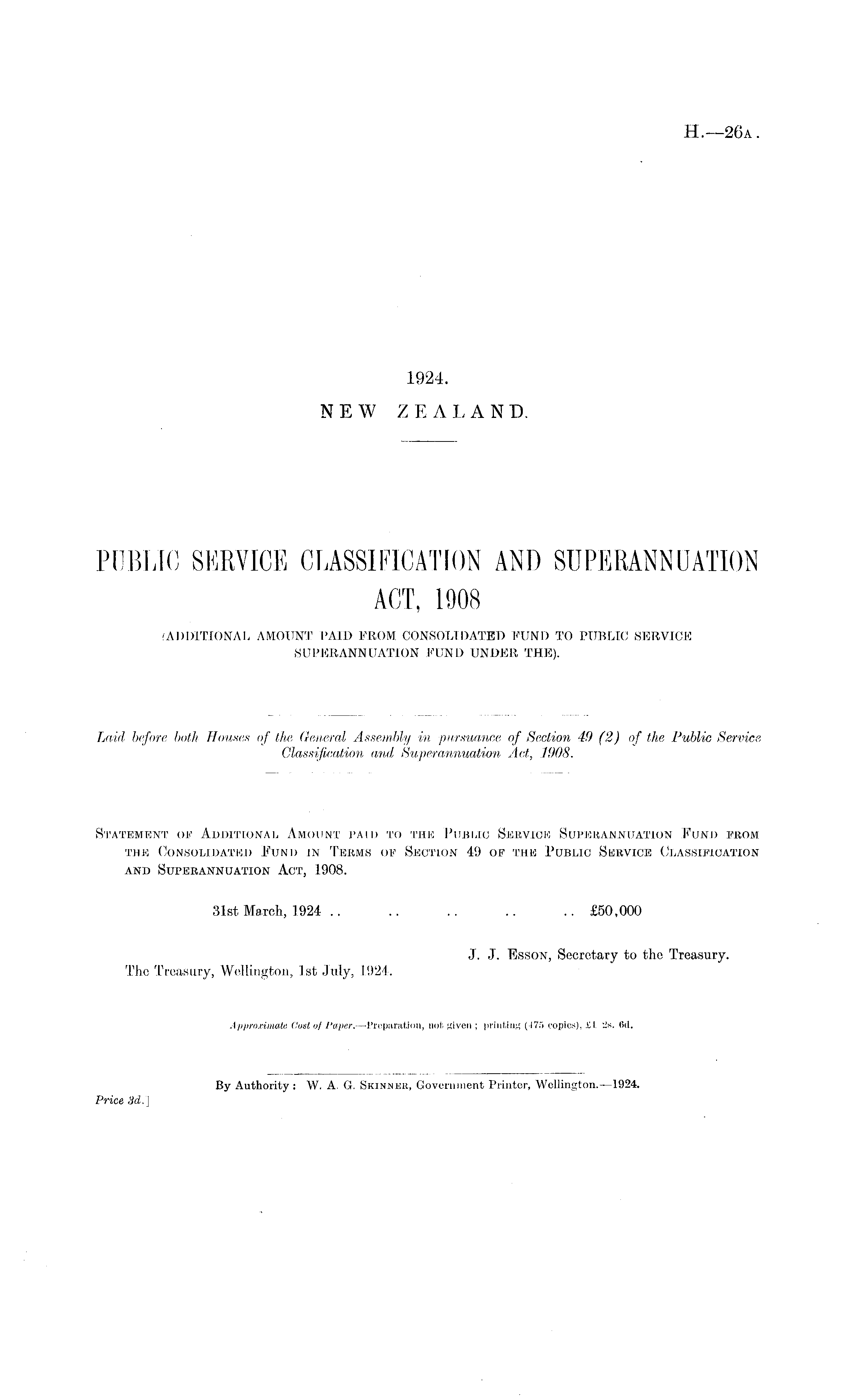 Statement of Additional Amount raid to the Public Sbrvioi Superannuation Fund from the Consolidated Fund in Terms of Section 49 of the Public Service Classification and Superannuation Act, 1908. 31st March, 1924 .. .. .. .. .. £50,000 J. J. Esson, Secretary to the Treasury. The Treasury, Wellington, Ist July, 1924.