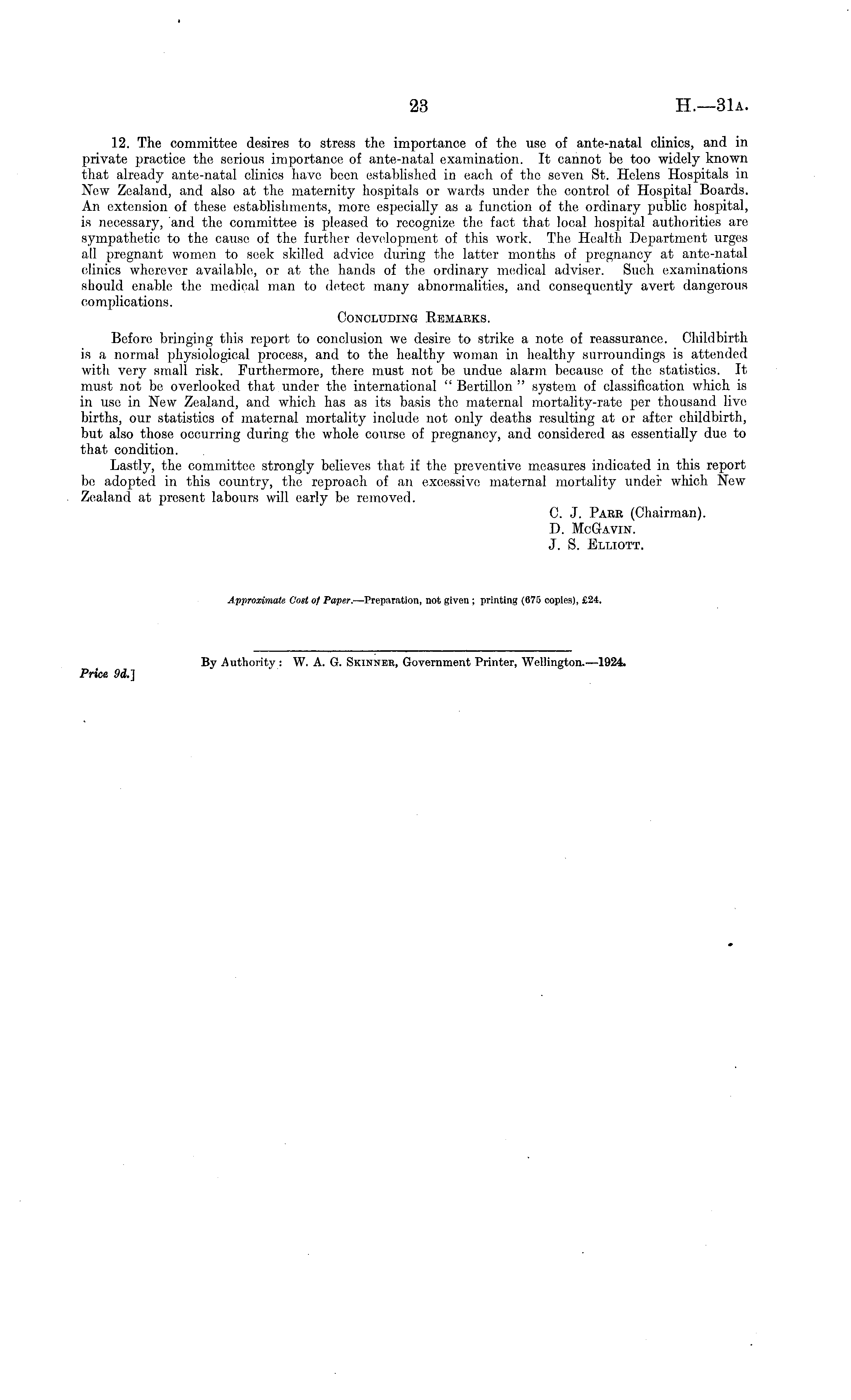 12. The committee desires to stress the importance of the use of ante-natal clinics, and in private practice the serious importance of ante-natal examination. It cannot be too widely known that already ante-natal clinics have been established in each of the seven St. Helens Hospitals in New Zealand, and also at the maternity hospitals or wards under the control of Hospital Boards. An extension of these establishments, more especially as a function of the ordinary public hospital, is necessary, and the committee is pleased to recognize the fact that local hospital authorities are sympathetic to the cause of the further development of this work. The Health Department urges all pregnant women to seek skilled advice during the latter months of pregnancy at ante-natal clinics wherever available, or at the hands of the ordinary medical adviser. Such examinations should enable the medical man to detect many abnormalities, and consequently avert dangerous complications. Concluding Remarks. Before bringing this report to conclusion we desire to strike a note of reassurance. Childbirth is a normal physiological process, and to the healthy woman in healthy surroundings is attended with very small risk. Furthermore, there must not be undue alarm because of the statistics. It must not be overlooked that under the international " Bertillon " system of classification which is in use in New Zealand, and which has as its basis the maternal mortality-rate per thousand live births, our statistics of maternal mortality include not only deaths resulting at or after childbirth, but also those occurring during the whole course of pregnancy, and considered as essentially due to that condition. Lastly, the committee strongly believes that if the preventive measures indicated in this report be adopted in this country, the reproach of an excessive maternal mortality under which New Zealand at present labours will early be removed. C. J. Parr (Chairman). D. McGavin. J. S. Elliott.
