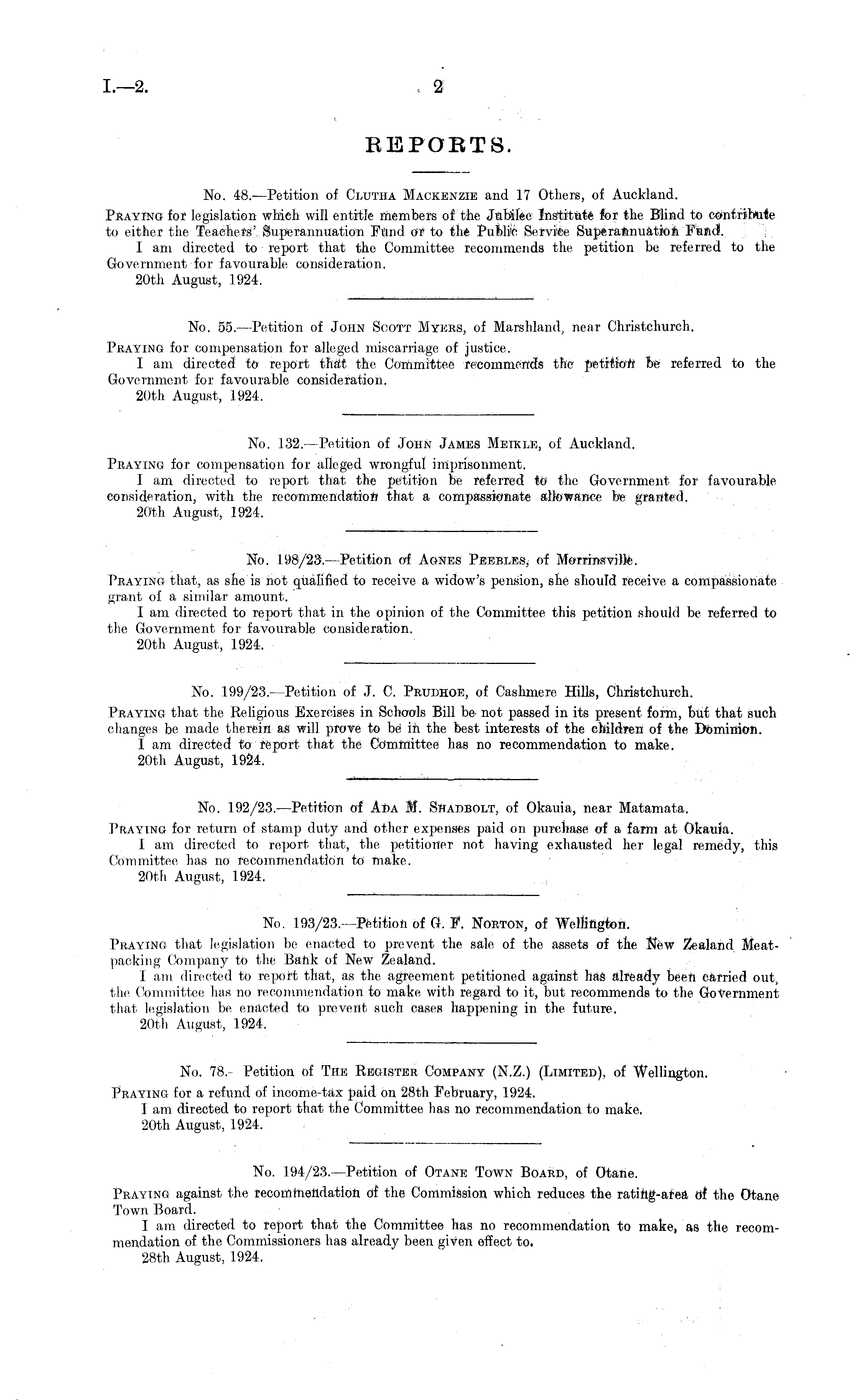 No. 55. —Petition of John Scott Myeks, of Marshland, near Christchurch. Praying for compensation for alleged miscarriage of justice. I am directed to report that the Committee recommends the petition be referred to the Government for favourable consideration. 20th August, 1924.