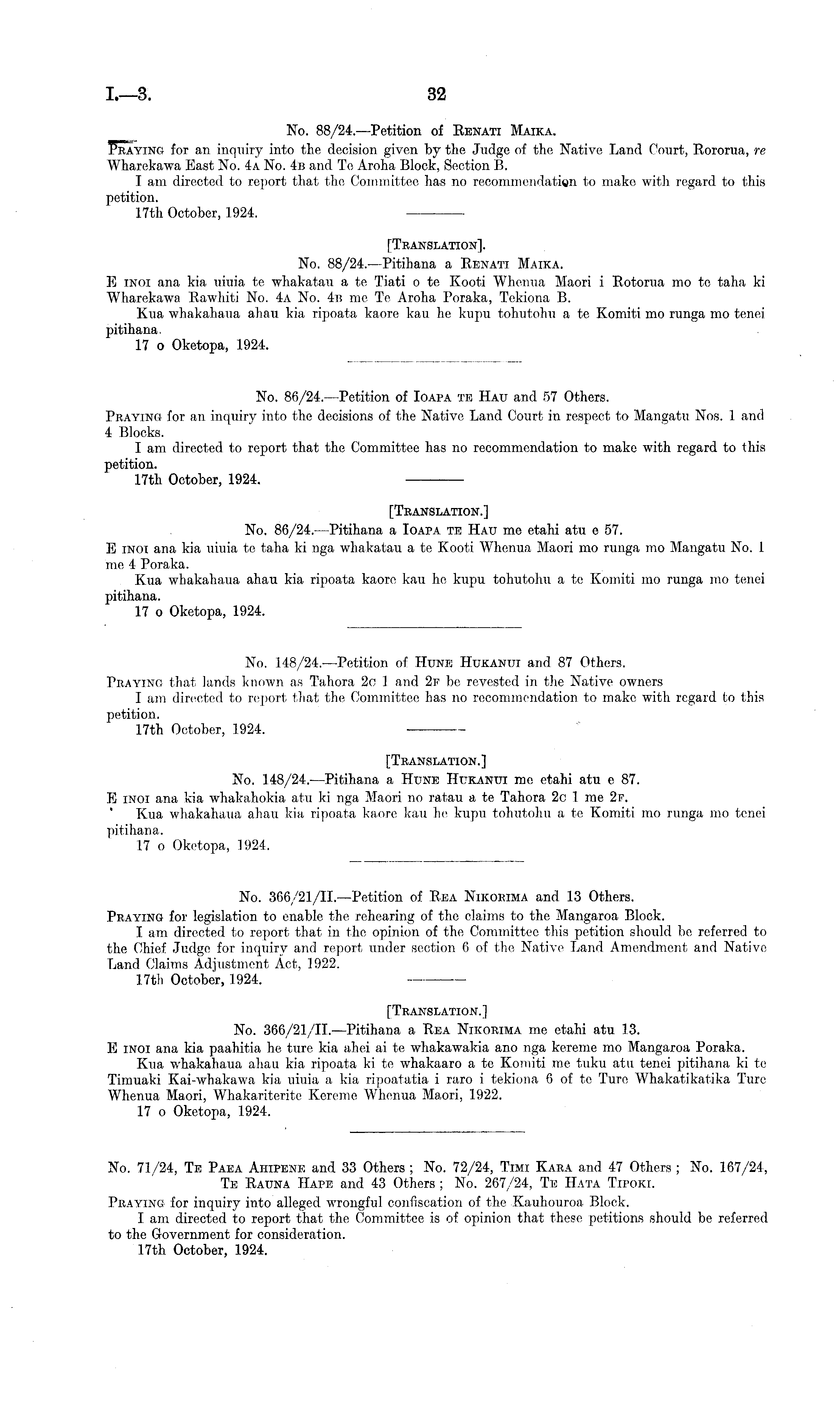 No. 88/24.—Petition of Renati Maika. PRAYING for an inquiry into the decision given by the Judge of the. Native Land Court, Rororua, re Wharekawa East No. 4a No. 4b and Te Aroha Block, Section B. I am directed to report that the Committee has no recommendation to make with regard to this petition. 17th October, 1924. [Translation]. No. 88/24 —Pitihana a Renati Maika. E tnoi ana kia uiuia te whakatau a te Tiati o te Kooti Whenua Maori i Rotorua mo te taha ki Wharekawa Rawhiti No. 4a No. 4n mo Te Aroha Poraka, Tekiona B. Kua whakahaua ahau kia ripoata kaoro kau he kupu tohutohu a te Komiti mo runga mo tenei pitihana, 17 o Oketopa, 1924.