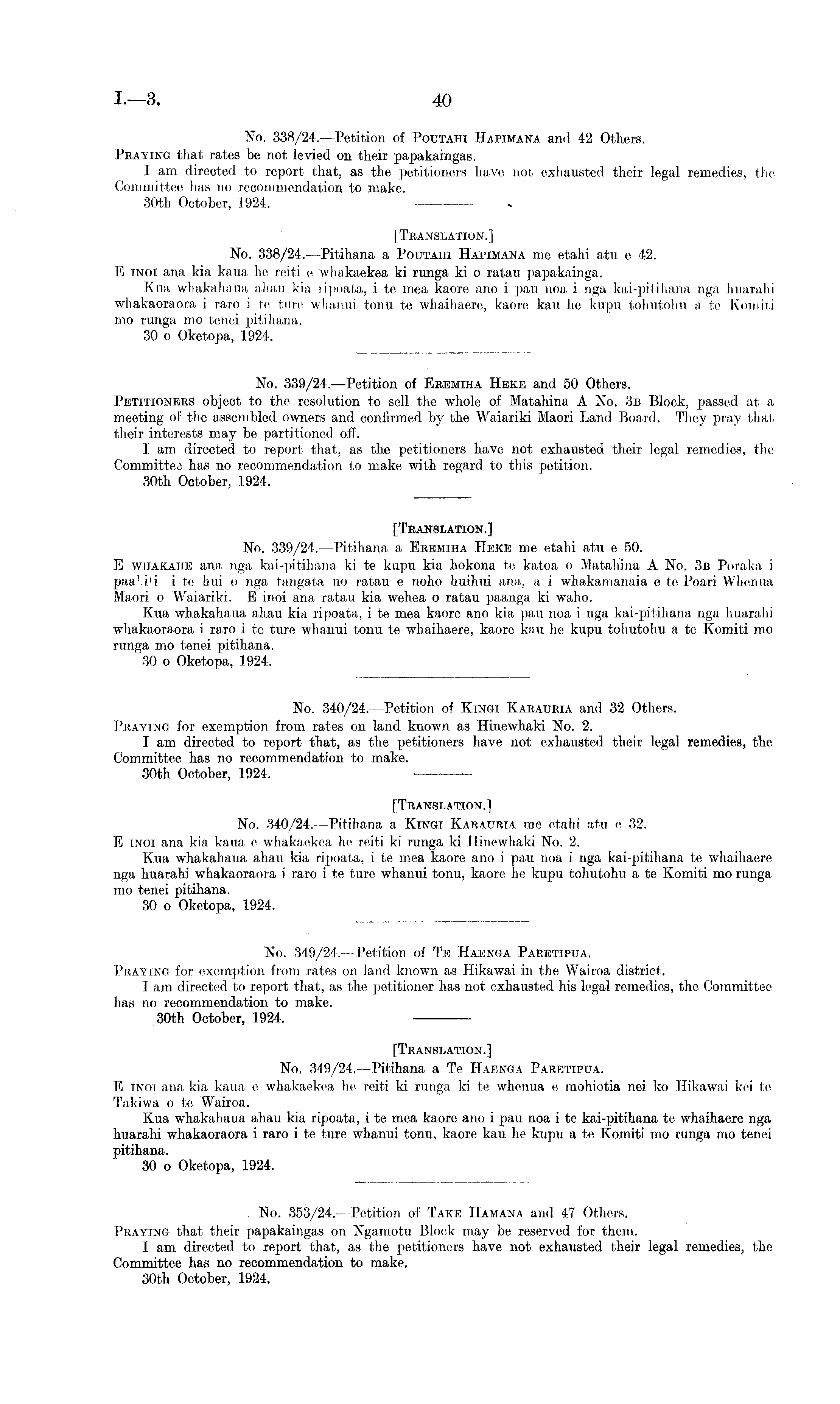 No. 338/24. —Petition of Poutahi Haptmana and 42 Others. Praying that rates be not levied on their papakaingas. I am directed to report that, as the petitioners have not exhausted their legal remedies, the Committee has no recommendation to make. 30th October, 4924. [Translation.] No. 338/24, —Pitihana a Poutahi Hapimana me etahi atu c 42. E tnoi ana kia kaua he, reiti c whakaekea ki runga ki o ratau papakainga. Kua whakahaua ahau kia ripoata, i te mea kaore ano i pan noa i nga kai-pitihana nga huarahi whakaoraora i raro i to ture whanui tonu te whaihaere, kaore kau he kupu tohutohu a le Komiti mo runga mo tenei pitihana. 30 o Oketopa, 192-4,