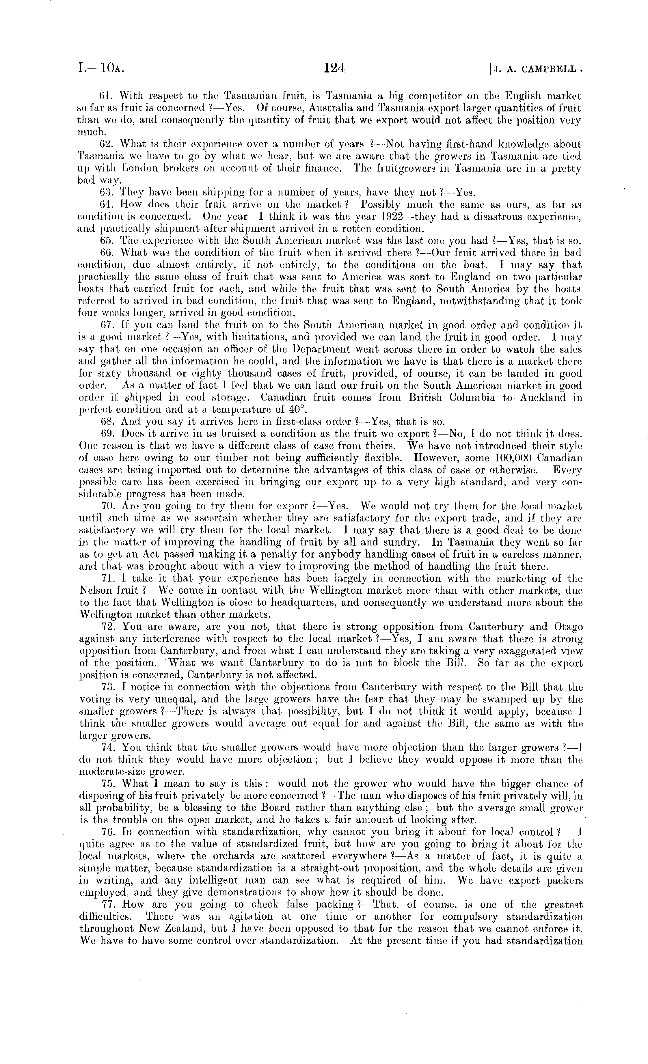 61. With respect to the; Tasmanian fruit, is Tasmania a big competitor on the English market sei far as fruit is concerned ?—Yes. Of course, Australia and Tasmania export larger quantities of fruit than we elo, and consequently the quantity of fruit that we export would not affect the: position very much. 62. What is their experience: over a number of yeiars ?—Not having first-hand knowledge about Tasmania, we have to go by what we he:ar, but wo are: aware that the growers in Tasmania are tied up with London brokers on account of their finance. Tho fruitgrowers in Tasmania are in a pretty bad way. 63. The:y have be:e:u shipping for a number of ye:ars, have they not ? —Yes. 64. How does their fruit arrive on tho market ?- Possibly much the: same as ours, as far as condition is concerned. One year —I think it was the year 1922—they had a disastrous experience, and practically shipment after shipment arriveel in a rotten condition. 65. The experience with the South American market was the last one you had ? —Yes, that is so. bT>. What was the condition of the: fruit when it arrived there ? —Our fruit arrive:ei there in bad condition, eluo almost entirely, if not entirely, to the conditions on the boat. I may say that practically the same class of fruit that was sent tei America was sent to England on two particular boats that carried fruit for each, and while: the fruit that was sent to South America by the boats referred to arrived in bad condition, the: fruit that was sent to England, notwithstanding that it took four weeks longer, arrived in good condition. 67. If you can land the: fruit on tei the: South American market in geiod order and condition it is a good market ? —Yes, with limitations, anel provided wo can land the: fruit in good order. I may say that on one occasion an officer of the Department went across there in order to watch the sales and gather all the information he coulel, and the information wc have is that there is a market there for sixty thousand or eighty thousand e;ases of fruit, provided, of course, it oan be landed in good order. As a matter of fact I feel that we: can land our fruit on the South American market in gooel oreler if shipped in ceieil storage. Canadian fruit come:s from British Columbia to Auckland in perfect condition and at a temperature of 40°. 68. Anel you say it arrives here in first-class order ? —Yes, that is sei. 69. Does it arrive: in as bruised a condition as the: fruit we export ? —No, I do not think it does. One: reason is that we have a different class of case from theirs. We have not introduced their style of case: here: owing to our timber not being sufficiently flexible. However, some 100,000 Canadian cases are being imported out to determine; the advantages of this class of case or otherwise:. Every possible: care has been, exorcised in bringing our export up to a very high standard, and very considerable progress has been made. 70. Aro you geiing to try them for export ?—Yes. We; weiuld not try them for the local market until such time as we ascertain whether- they are satisfactory for the eixport trade, and if they are satisfactory we will try them for the: local market. I may say that there is a good deal to be: done; in the matter of improving the handling of fruit by all and sundry. In Tasmania they went so far as to get an Act passed making it a penalty for anybody haneiling cases of fruit in a careless manner, anei that was brought about with a vie;w to improving the method of handling the fruit there. 7.1. I take it that your experience has been largely in connection with the marketing of the Nelson fruit ? —We come in contact with the: Wellington market more: than with other markets, due tei the fact that Wellington is close to headquarters, and consequently we understand more about the Wellington market than other markets. 72. You are aware, aro you not, that there is strong opposition from Canterbury and Otago against any interference with respect to the local market ? —Yes, I am. aware: that there is strong opposition from Canterbury, and from what I can understand they are taking a very exaggerated view of the position. What we, want Canterbury to do is not to block the Bill. So far as the export position is concerned, Canterbury is not affected. 73. I notice in connection with the objections from Canterbury with respect to the Bill that the voting is very unequal, and tho largo growers have the fear that they may be swamped up by the smaller growers ?—There is always that possibility, but I do not think it would apply, because I think the; smaller growers woulel average out equal for and against the: Bill, the same as with the larger growers. 74. You think that the smaller growers would have; more objection than the larger growers ? —1 do not think they woulel have more objection; but I beiicve they would oppose it more than tho moderate-size grower. 75. What I mean to say is this : would not the grower who would have the bigger chance: eif disposing of his fruit privately be more conoerned ? —The: man who disposes of his fruit privately will, in all probability, be a blessing to the Board rather than anything else; ; but the average small grower is the trouble on the open market, and he takes a fair amount of looking after. 76. In connection with standardization, why cannot you bring it, about for local control ? 1 quite: agree as to tho value: of standardized fruit, but how aro you going to bring it about for the local markets, where the orchards are: scattered everywhere ? —As a matter of fact, it is quite a simple: matter, because: standardization is a straight-out, proposition, aid the whole details are given in writing, and any intelligent man can see what is reepiired of him, We have expert packers employed, and they give demonstrations to show how it should be done. 77. How aro you going to eiheck false packing ? That, of course, is one of the greatest difficulties. There was