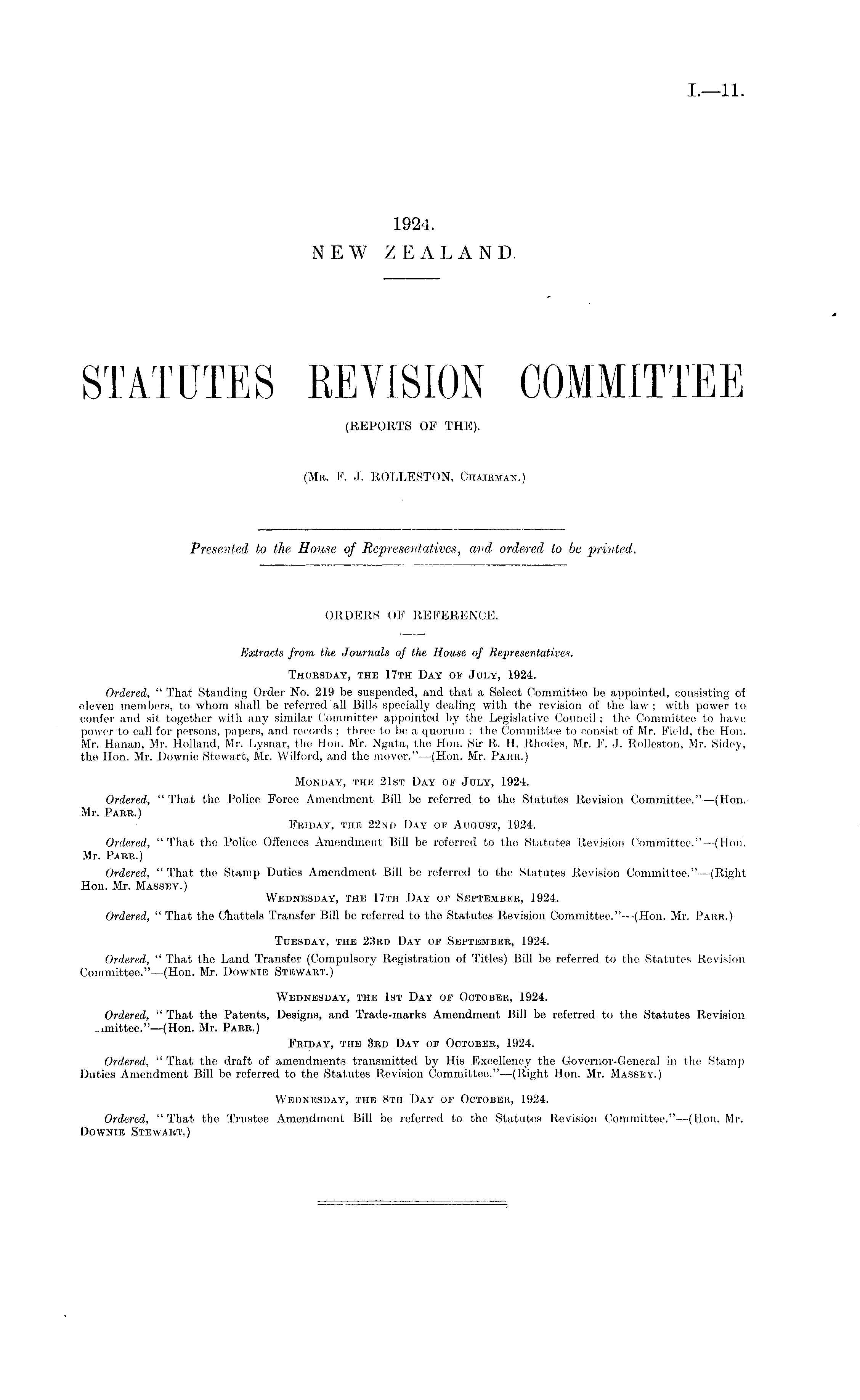 ORDERS OF REFERENCE, Extracts from the Journals of the House of Representatives. Thursday, the 17th Day of July, 1924. Ordered, " That Standing Order No. 219 be suspended, and that a Select Committee be appointed, consisting of eleven members, to whom shall be referred'all Bills specially dealing with the revision of the law; with power to confer and sit together with any similar Committee appointed by the Legislative Council ; the Committee to have power to call for persons, papers, and records ; three to be a quorum : the Committee to consist of Mr. Field, the Hon. Mr. Hanan, Mr. Holland, Mr. Lysnar, the Hon. Mr. Ngata, the Hon. Sir R. H. Rhodes, Mr. P. J. Rolleston, Mr. Sidey, the Hon. Mr. Downie Stewart, Mr. Wilford, and tho mover."—(Hon. Mr. Parr.) Monday, the 21st Day of July, 1924. Ordered, " That the Police Force Amendment Bill be referred to the Statutes Revision Committee."—(Hon. Mr. Parr.) Friday, the 22n0 Day oe August, 1924. Ordered, "That the Police Offences Amendment Hill be referred to the Statutes Revision Committee." —(Hon, Mr. Parr.) Ordered, " That the Stamp Duties Amendment Bill be referred to the Statutes Revision Committee." —(Right Hon. Mr. Massey.) Wednesday, the 17th Day of September, 1924. Ordered, " That the Chattels Transfer Bill be referred to the Statutes Revision Committee."—(Hon. Mr. Parr.) Tuesday, the 23rd Day of September, 1924. Ordered, " That the Land Transfer (Compulsory Registration of Titles) Bill be referred to the Statutes Revision Committee," —(Hon. Mr. Downie Stewart.) Wednesday, the Ist Day of October, 1924. Ordered, " That the Patents, Designs, and Trade-marks Amendment Bill be referred to the Statutes Revision oimittee." —(Hon. Mr. Parr.) Friday, the 3rd Day of October, 1924. Ordered, " That the draft of amendments transmitted by His Excellency the Governor-General in the Stamp Duties Amendment Bill be referred to the Statutes Revision Committee."—(Right Hon. Mr. Massey.) Wednesday, the Bth Day of October, 1924. Ordered, "That the Trustee Amendment Bill be referred to the Statutes Revision Committee." —(Hon. Mr. Downie Stewart.)