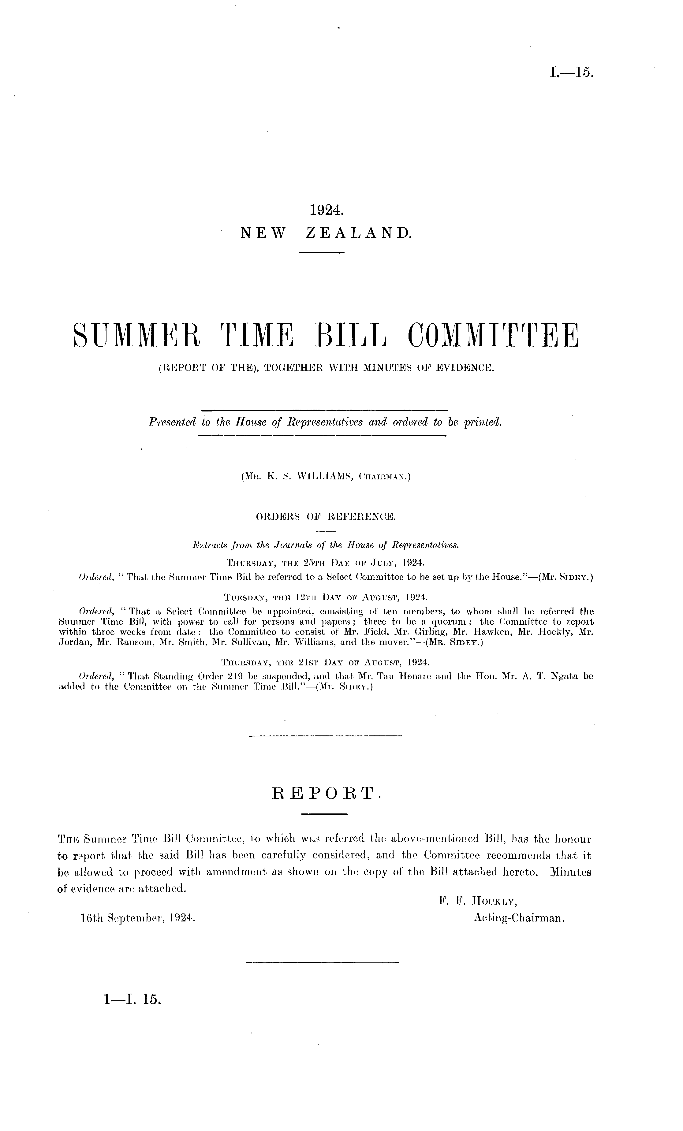 (Me. K. S. WILLIAMS, Chairman.) ORDERS OF REFERENCE. Extracts from, the. Journals of the House of Representatives. Thursday, the 25th Day 01? July, 1924. Ordered, " That the Summer Time Bill be referred to a Select Committee to be set up by the House."—(Mr. Sidioy.) Tuesday, the 12th Day of August, 1924. Ordered, " That a Select Committee be appointed, consisting of ten members, to whom shall be referred the Summer Time Bill; with power to call for persons and papers ; three to be a quorum ; the Committee to report within three weeks from date : the Committee to consist of Mr. Field, Mr. Girling, Mr. Hawken, Mr. Hoekly, Mr. Jordan, Mr. Ransom, Mr. Smith, Mr. Sullivan, Mr. Williams, and the mover."—(Me. Sidey.) Thursday, the 21st Day of Auoust, 1924. Ordered, " That Standing Order 219 be suspended, and that Mr. Tau Henare and the Hon. Mr. A. T. Ngata be added to the Committee on the Summer Time Bill." —(Mr. Stdtcy.)