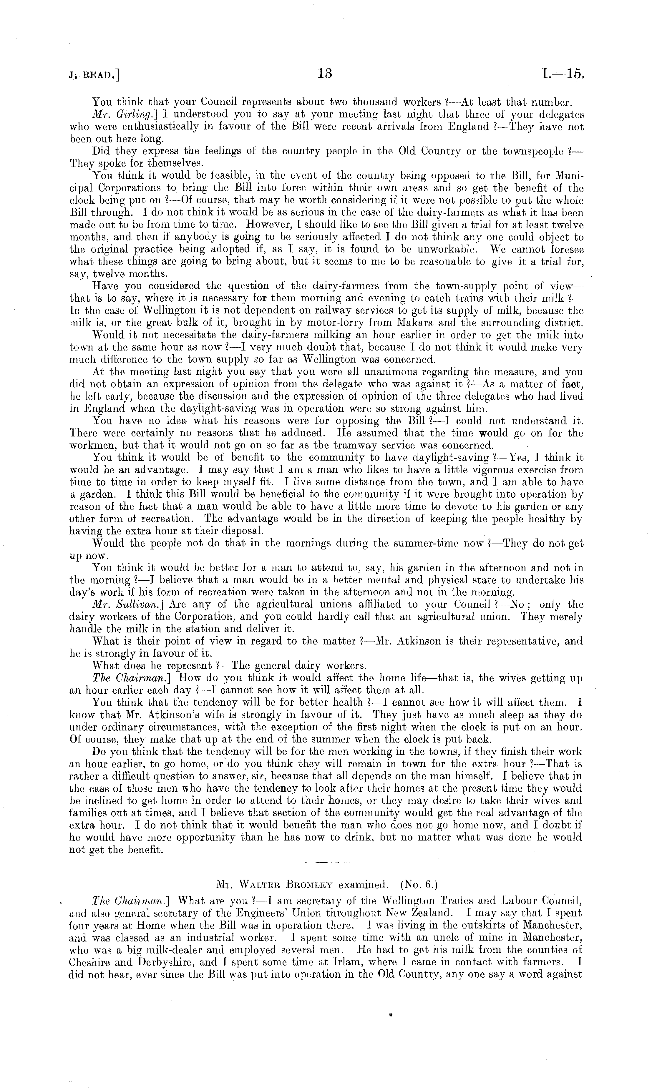 You think that your Council represents about two thousand workers ? —At least that number. Mr. Qirling.] 1 understood you to say at your meeting last night that three of your delegates who were enthusiastically in favour of the Bill were recent arrivals from England ? —They have not been out here long. Did they express the feelings of the country people in the Old Country or the townspeople ? — They spoke for themselves. You think it would be feasible, in the event of the country being opposed to the Bill, for Municipal Corporations to bring the Bill into force within their own areas and so get the benefit of the clock being put on ?—Of course, that may be worth considering if it wore not possible to put the whole Bill through. Ido not think it would be as serious in the case of the dairy-farmers as what it has been made out to be from time to time. However, I should, like to sec the Bill given a trial for at least twelve months, and then if anybody is going to be seriously affected i do not think any one could object to the original practice being adopted if, as I say, it is found to be unworkable. We cannot foresee what these things arc going to bring about, but it seems to me to be reasonable to give it a trial for, say, twelve months. Have you considered the question of the dairy-farmers from the town-supply point of view— that is to say, where it is necessary for them morning and evening to catch trains with their milk ?— In the case of Wellington it is not dependent on railway services to get its supply of milk, because; the milk is, or the great bulk of it, brought in by motor-lorry from Makara and the surrounding district. Would it not necessitate the dairy-farmers milking an hour earlier in order to get the milk into town at the same hour as now ?—I very much doubt that, because Ido not think it would make very much difference to the town supply so far as Wellington was concerned. At the meeting last night you say that you were all unanimous regarding the measure, and you did not obtain an expression of opinion from the delegate who was against it ?— As a matter of fact, he left early, because the discussion and the expression of opinion of the three delegates who had lived in England when, the daylight-saving was in operation were so strong against him. You have no idea what his reasons were for opposing the Bill ? —1 could not understand it. There were certainly no reasons that he adduced. He assumed that the time would go on for the workmen, but that it would not go on so far as the tramway service was concerned. You think it would, bo of benefit to the community to have daylight-saving I—Yes,1 —Yes, I think it would be an advantage. I may say that I am. a man who likes to have a little vigorous exorcise from time to time in order to keep myself fit. I live some distance from the town, and lam able to have a garden. 1 think this Bill would be beneficial to the community if it wore brought into operation by reason of the fact that a man would be able to have a little more time to devote to his garden or any other form of recreation. The advantage would be in the direction of keeping the people healthy by having the extra hour at their disposal. Would the people not do that in the mornings during the summer-time now ? —They do not get up now. You think it would, be better for a man to attend to. say, his garden in the afternoon and not in the morning ? —I believe that a man. would be in a better mental and physical state to undertake his day's work if his form of recreation were taken in the afternoon and not in the morning. Mr. Sullivan.] Are any of the agricultural unions affiliated to your Council ?—No ; only the dairy workers of the Corporation, and you could hardly call that an agricultural union. They merely handle the milk in the station and deliver it. What is their point of view in regard to the matter ?—Mr. Atkinson is their representative, and he is strongly in favour of it. What does he represent ? —The general dairy workers. The Chairman.] How do you think it would affect the home life —that is, the wives getting up an hour earlier eaoh day ? —I cannot see how it will affect them at all. You think that the tendency will be for bettor health ? —I cannot see how it will affect them. I know that Mr. Atkinson's wife is strongly in favour of it. They just have as much sleep as they do under ordinary circumstances, with the exception of the first night when the clock is put on an hour. Of course, they make that up at the end of the summer when the clock is put back. Do you think that the tendency will be for the men working in the towns, if they finish their work an hour earlier, to go home, or do you think they will remain in town for the extra hour ? —That is rather a difficult question to answer, sir, because that all depends on the man himself. I believe that in the case of those men who have the tendency to look after their homes at the present time they would be inclined to get home in order to attend to their homes, or they may desire to take their wives and families out at times, and I believe that section of the community would get the real advantage of the extra hour. Ido not think that it would benefit the man who does not go home now, and I doubt if lie would have more opportunity than he has now to drink, but no matter what was done he would not get the benefit. Mr. Walteb Bkomley examined. (No. G.) The Chairman.} What are you '{— 1 am secretary of the Wellington Trades and Labour Council, and also general secretary of the Engineers' Union throughout New Zealand. I may say that I spent four years at Home when the Bill was in operation there. .1 was living in the outskirts of Manchester, and was classed as an industrial worker. I spent some time with an uncle of mine in Manchester, who was a big milk-dealer and employed several men. He had to get his milk from the counties of Cheshire and Derbyshire, and I spent some 